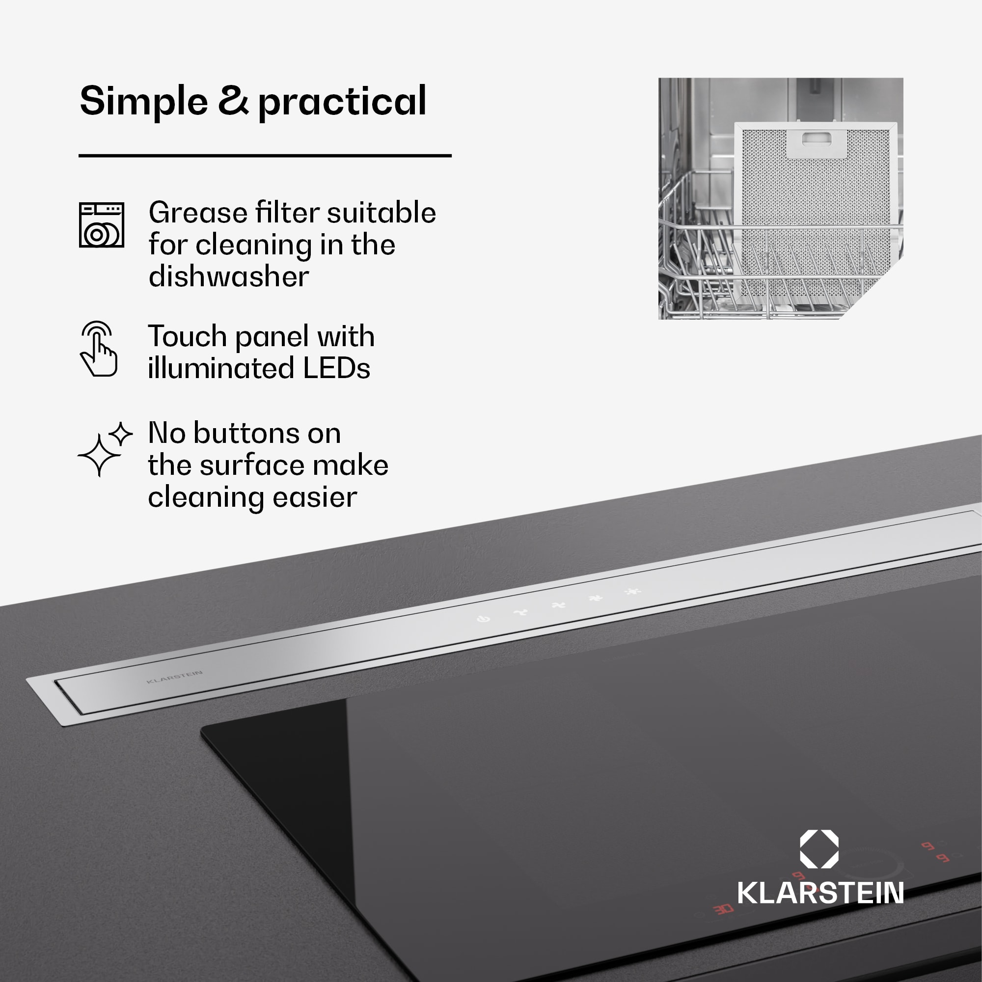 Spádový Downdraft digestor Klarstein Royal Flush Eco 90 je inovatívne riešenie pre vašu kuchyňu. Odsáva paru a pachy priamo pri zdroji s pôsobivým cirkulačným prietokom až 604 m³/h. Po skončení prevádzky sa elegantne schová do pracovnej dosky a šetrí tak cenný priestor. Tento digestor ponúka vysoký výkon pri nízkom prevádzkovom hluku. Keďže sa inštaluje vedľa varnej dosky, je samozrejme vhodný nielen pre kuchynské ostrovčeky, ale hodí sa aj do takmer každej inej kuchyne a takmer ku každému sporáku. Ponúka intuitívne ovládanie a štýlový dizajn z nehrdzavejúcej ocele. Objavte moderný komfort vo svojej kuchyni s Downdraft digestorom od Klarstein.