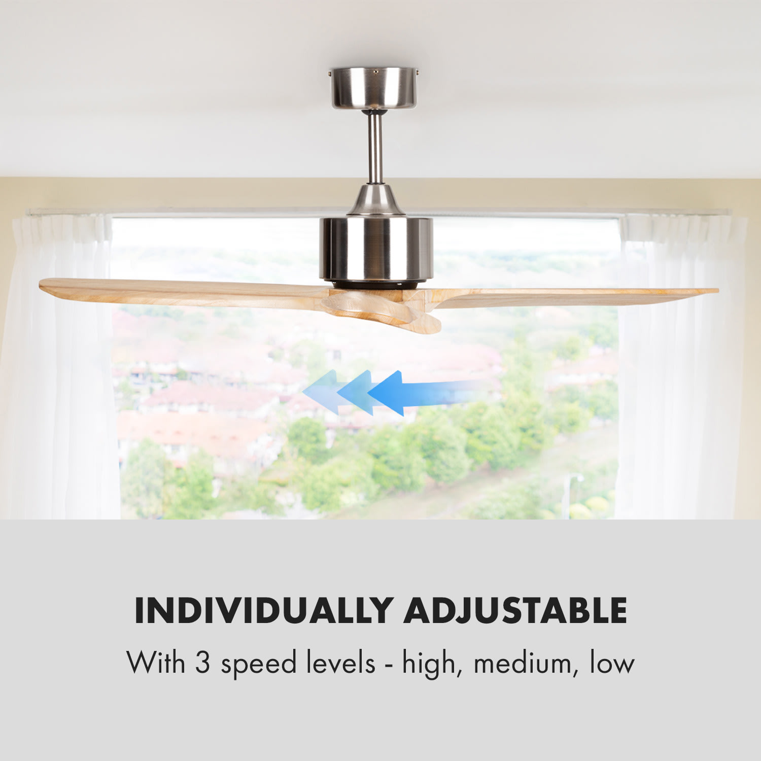 Extra podľa vášho vkusu: Stropný ventilátor Klarstein Santa Elena vám a vašim blízkym poskytne svieži vánok presne podľa potreby.Stropný ventilátor Klarstein Santa Elena s priemerom 52″ (132 cm) a 3 rýchlosťami – vysoká, stredná a nízka – spoľahlivo uvedie do pohybu množstvo lenivého vzduchu jediným stlačením tlačidla. Rozpohybuje až 9 060 m³ vzduchu za hodinu. Jeho tri robustné lopatky z pravého dreva nielenže vyzerajú mimoriadne elegantne, ale sú aj mimoriadne tiché s maximálnou prevádzkovou hlučnosťou iba 45 dB. Štvorstupňový časovač vypnutia s dĺžkou trvania až 8 hodín umožňuje nekomplikovanú prevádzku – napríklad ako ventilátor pri zaspávaní. Okrem toho možno všetky funkcie zariadenia Santa Elena ovládať priamo zdola pomocou diaľkového ovládača. Osviežujúco štýlový: Stropný ventilátor Klarstein Santa Elena zaujme svojimi početnými funkciami a pohodlným diaľkovým ovládaním.Upozorňujeme, že batérie potrebné pre diaľkové ovládanie nie sú súčasťou balenia.