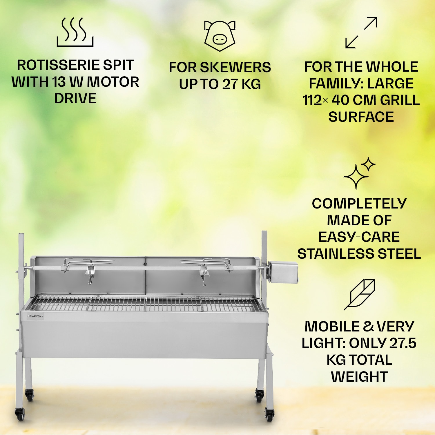 Klarstein Sauenland Pro, gril na prasiatko, otočný špíz, 13 W, 4 kolesá, ušľachtilá oceľ –Kúpiť