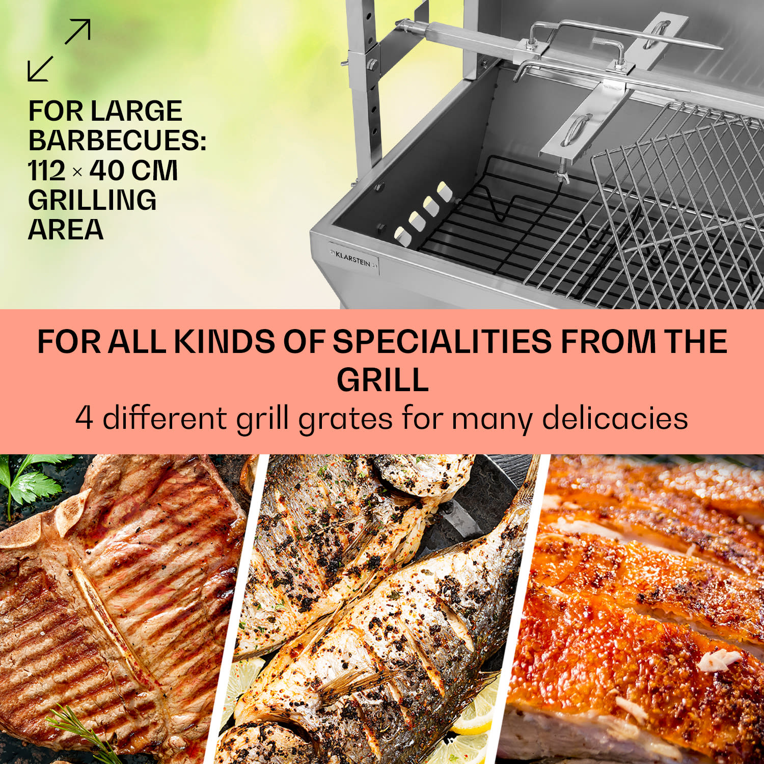 Zariadenie Sauenland Pro od spoločnosti Klarstein je záhradný gril, vďaka ktorému sa plnia sny dedinských znalcov. Pevná konštrukcia z ušľachtilej ocele podľa konceptu CrystalSteel Concept určuje vonkajší vzhľad grilu. Vďaka štyrom kolesám s dvom integrovaným brzdám sa gril na prasiatko aj napriek hmotnosti a vysokej stabilite veľmi ľahko prepravuje, napríklad z garáže do záhrady alebo z miestnosti na náradie na terasu. Najväčšou zaujímavosťou grilu je určite dobre dimenzovaný grilovací špíz z ušľachtilej ocele. Možno na ňom opekať delikátne pečienky, kurča alebo iné grilované jedlá. Špíz z ušľachtilej ocele je poháňaný dodávaným motorom. Vďaka konštantnej rotácii zabezpečuje rovnomerný proces varenia a dokonalý pôžitok zo šťavnatého mäsa. Do grilovacej vaničky sa zmestí dostatok uhlia na dlhodobé poskytovanie potrebného tepla. Vďaka štyrom grilovacím roštom je k dispozícii aj veľkorysá grilovacia plocha, vďaka čomu je gril ideálnym partnerom pre tradičné BBQ podujatia. Či už ide o rodinné oslavy, párty, alebo firemné výročia, s grilom na prasiatko Sauenland Pro od spoločnosti Klarstein sa podaria sedliacke pečené prasatá a ďalšie špeciality naozaj vo veľkom štýle! Upozornenie: gril na prasiatka je dodávaný ako montážna sada.