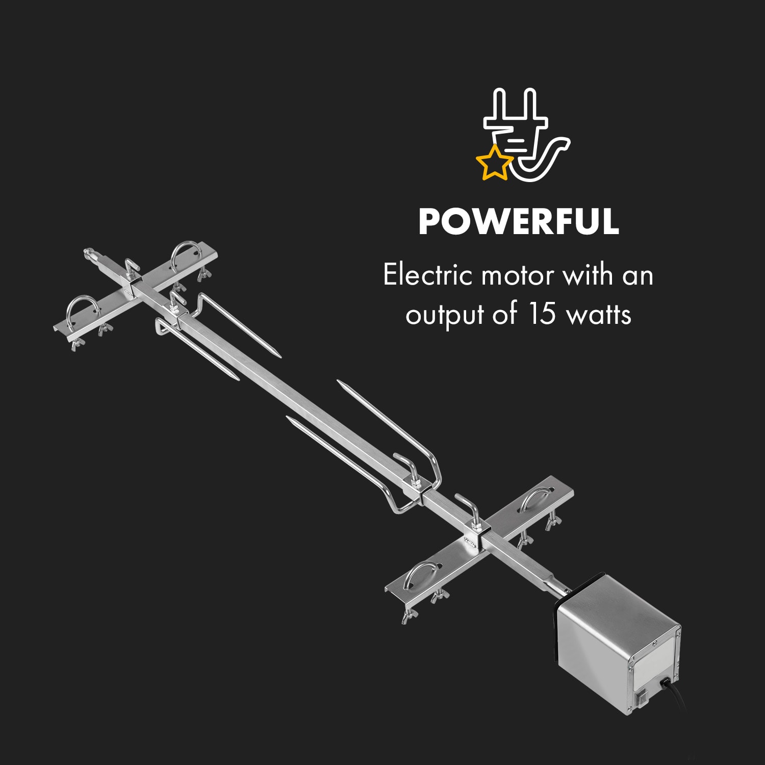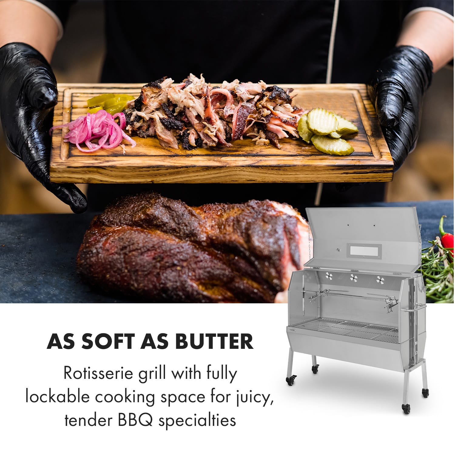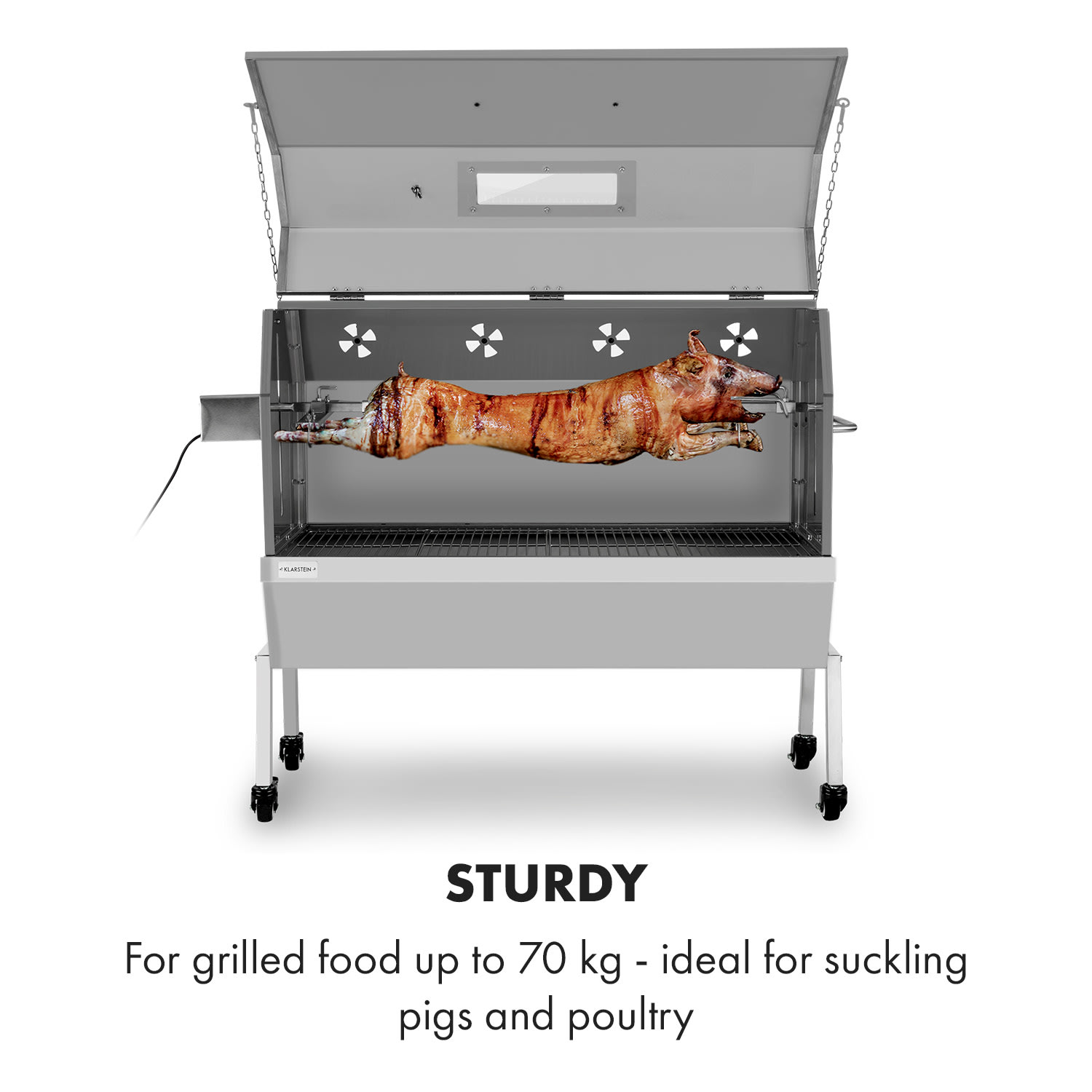 Záhradný gril na prasiatka Sauenland Pro XL od spoločnosti Klarstein zaujme vďaka uzavretému priestoru na varenie svojimi šťavnatými pochúťkami a mimoriadne jemným mäsom.S otočným grilom, grilovacím roštom a pevnými nohami z ušľachtilej ocele je gril na prasiatka Klarstein Sauenland Pro XL nielen veľmi kvalitný, ale tiež sa ľahko čistí vďaka hladkým povrchom. Vďaka dobrej tepelnej izolácii umožňuje uzatvárateľný priestor na varenie dlhý čas varenia pri nízkych teplotách, a preto sa hodí na prípravu jemných a šťavnatých prasiatok, pečených kurčiat a pečienok, ale tiež špecialít pomalého varenia ako „pulled pork“. Vďaka štyrom kolieskam s dvomi integrovanými brzdami sa gril na drevené uhlie aj napriek hmotnosti a vysokej stabilite veľmi ľahko prepravuje, napríklad z garáže do záhrady alebo z miestnosti na náradie na terasu.Špíz grilu na prasiatka z ušľachtilej ocele je poháňaný dodávaným motorom: vďaka konštantnej rotácii zabezpečuje rovnomerný proces varenia a dokonalý pôžitok zo šťavnatého mäsa. Do grilovacej vaničky sa zmestí dostatok uhlia na dlhodobé poskytovanie potrebného tepla. S teplomerom integrovaným vo varnom priestore a okienkom sa dá neustále sledovať teplota a dianie v grile. Vďaka štyrom grilovacím roštom je okrem toho k dispozícii aj veľká grilovacia plocha, čo robí z grilu ideálneho partnera na tradičné BBQ podujatia. Nový dizajn nôh tiež poskytuje grilu ešte lepšie postavenie v rozličných terénoch.Či už ide o rodinné oslavy, párty, alebo firemné výročia: s rotačným grilom Sauenland Pro XL od spoločnosti Klarstein sa podaria rustikálne pečené prasatá, chutné pečené kurčatá a špeciality ako „pulled pork“ naozaj vo veľkom štýle!Upozornenie: gril na prasiatka je dodávaný ako montážna sada.