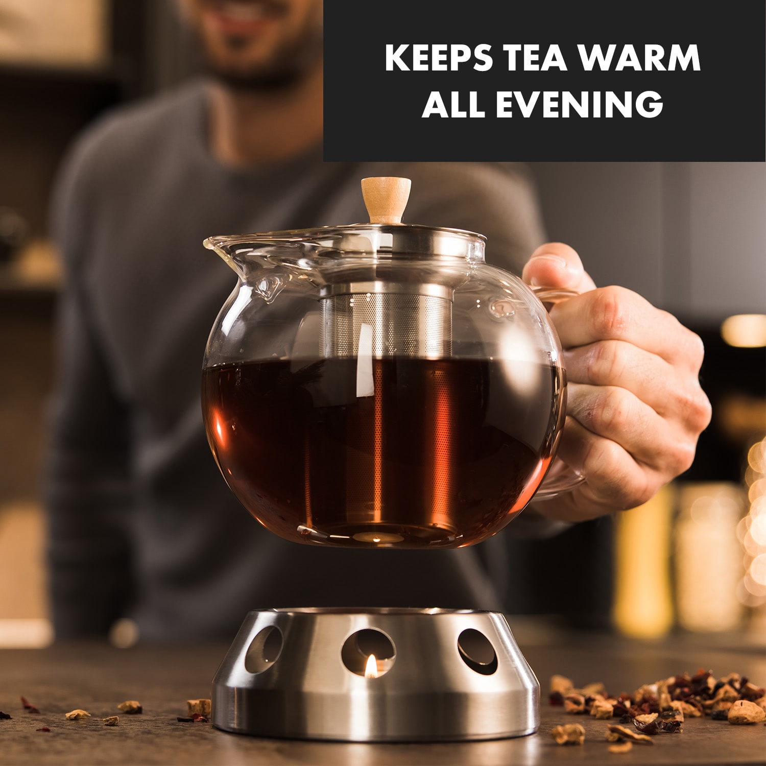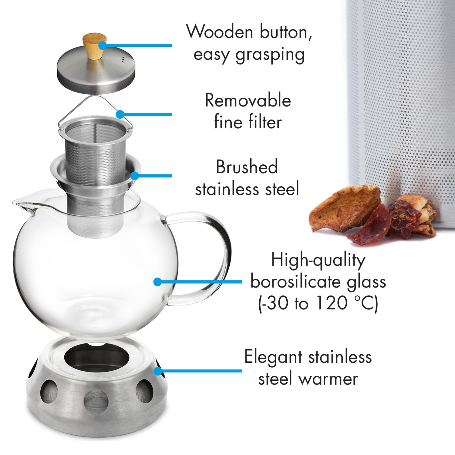 Pre neopakovateľný aromatický zážitok z čaju: užívajte si momenty relaxu s čajovou kanvicou od Klarstein s objemom 1,3 litra, sitkom z nehrdzavejúcej ocele a vyrobenú z odolného borosilikátového skla. Pod vekom z brúsenej, nehrdzavejúcej ocele s drevenou rukoväťou sa ukrýva vyberateľné a jemné sitko. Sypké a voľne kombinovateľné čajové zmesi sa v ňom zalievajú horúcou vodou a vďaka mimoriadne dlhému filtru môžu optimálne rozvinúť svoju arómu aj s malým množstvom vody. Po uplynutí požadovaného času lúhovania môžete vložku sitka ľahko vytiahnuť a vyčistiť pomocou priloženej rukoväte, zatiaľ čo dobre tvarovaná výlevka zaručuje nalievanie čerstvého čaju bez kvapkania. Vďaka žiaruvzdornému a odolnému borosilikátovému sklu môžete čajník jednoducho umiestniť na dodaný ohrievač a udržiavať ho teplý. Jedinečný pôžitok z čaju v atraktívnom dizajne: obohaťte svoj každodenný život o individuálne čajové kreácie v dizajnovej kanvici Sencha s ohrievačom na ibištekový čaj od Klarstein.