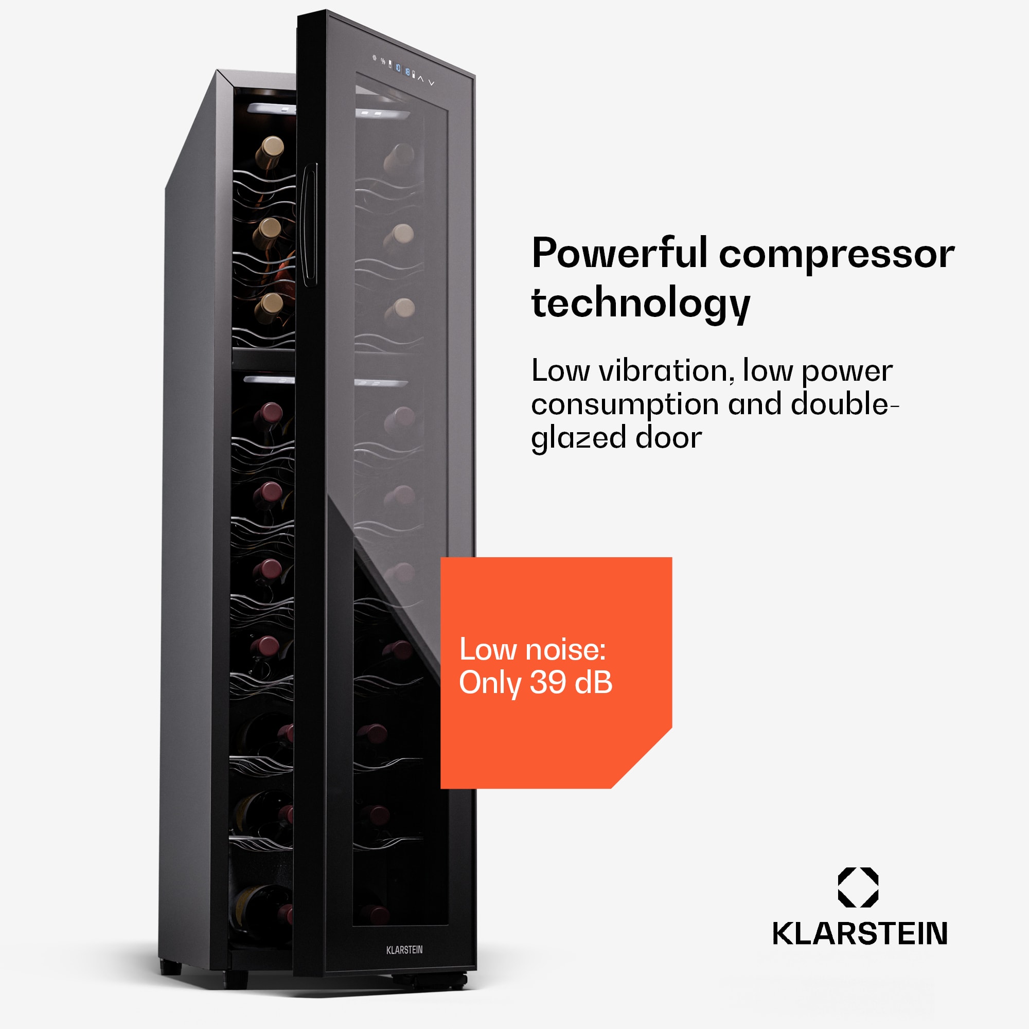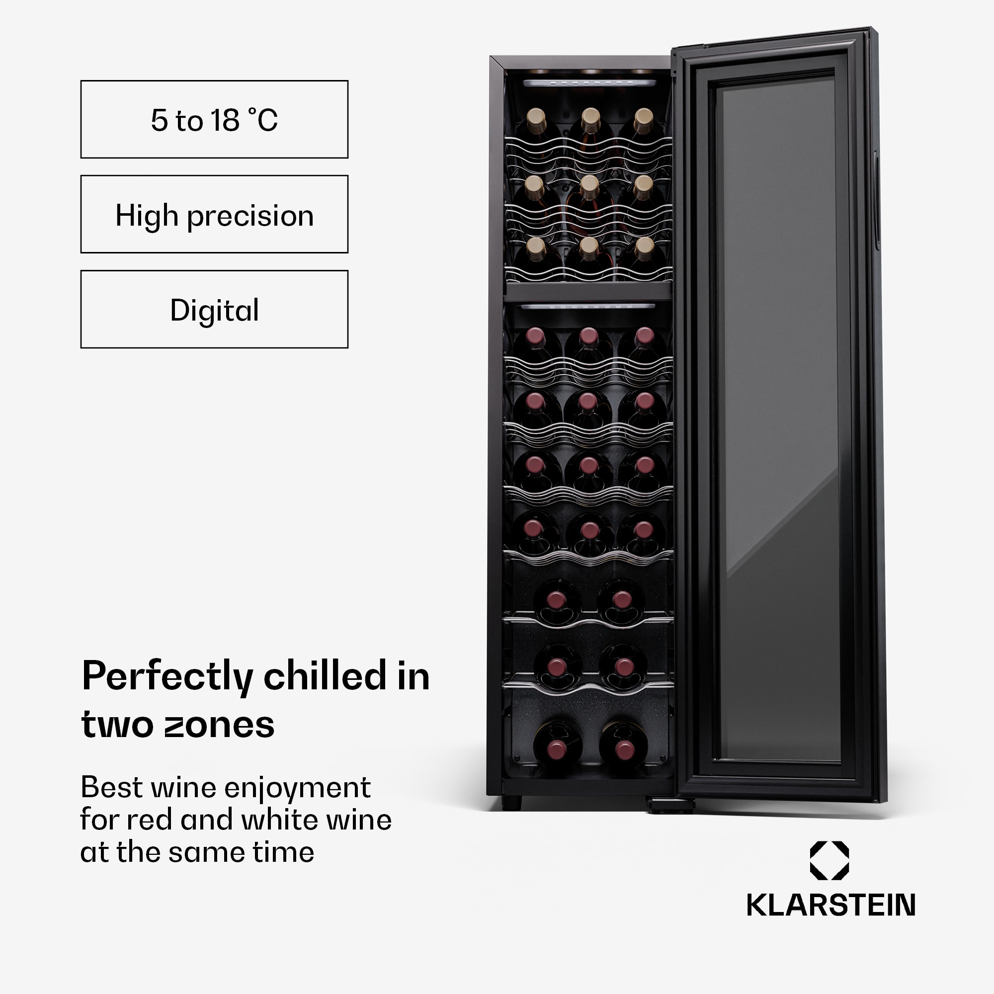 Zažite maximálny pôžitok z vína s vinotékou Klarstein Shiraz 27 Duo. Vďaka dvom oddeleným chladiacim zónam zabezpečuje súčasne červeným aj bielym vínam tú správnu teplotu na pitie. Táto dvojzónová vinotéka ponúka cez panoramatické sklenené dvere a vnútorné LED osvetlenie vždy dobrý výhľad na luxusnú prezentáciu až 27 fliaš. Vďaka pohodlnému dotykovému ovládaniu a elegantnému vzhľadu obohatí Shiraz 27 Duo každé obytné prostredie o pohodlie a eleganciu.Pre všetkých znalcov kvalitných vín: chladnička na víno Klarstein Shiraz 27 Duo ponúka štýlový úložný priestor a ideálne chladenie na víno, sekt či iné nápoje.