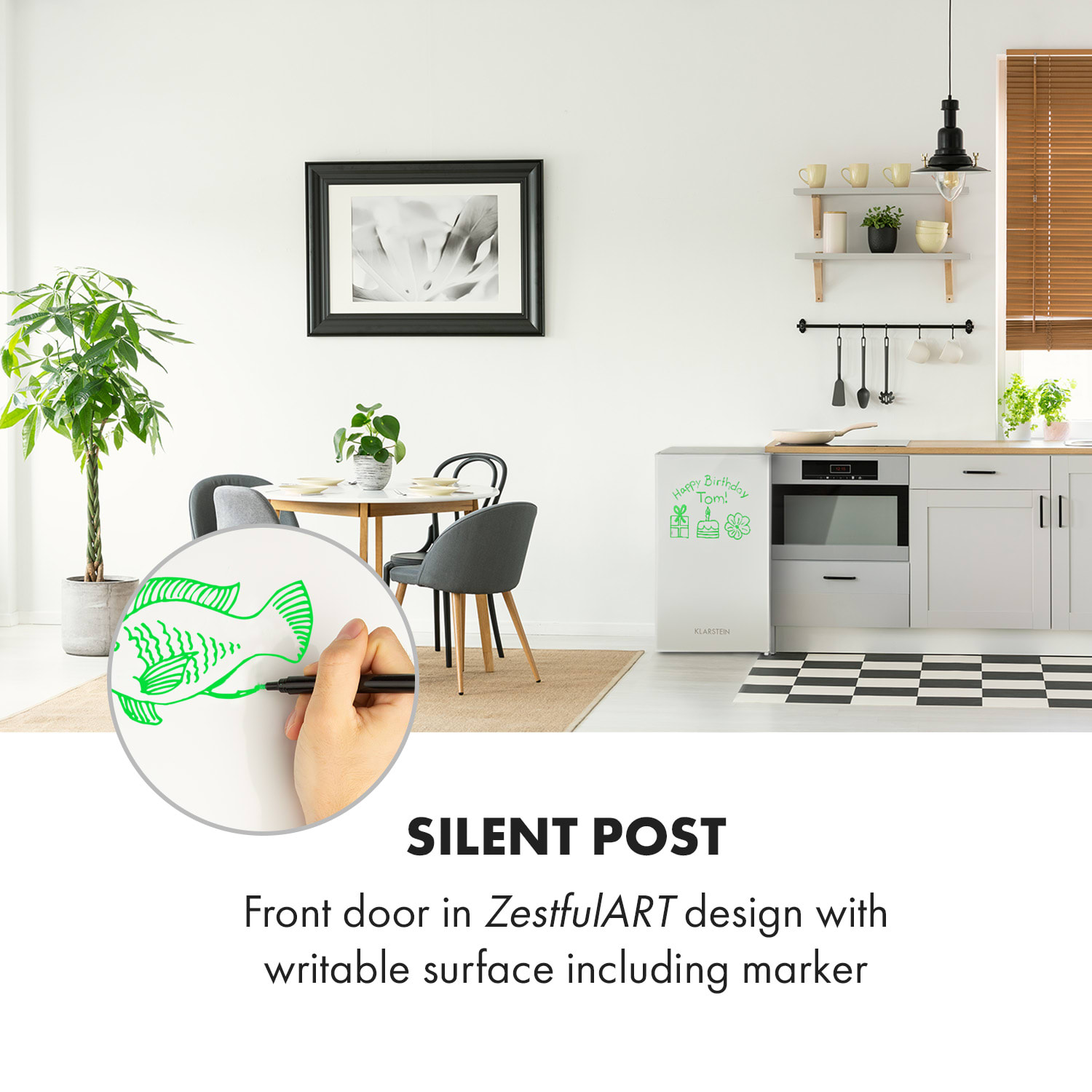 Studená a komunikatívna: ekologická chladnička Klarstein Spitzbergen Uni je nielen ideálnym miestom na uskladnenie čerstvých potravín v malých domácnostiach, ako sú internátne izby, apartmány jednotlivcov alebo záhradné domčeky, ale je zaujímavá aj svojou odkazovacou funkciou v kuchyni – či už ide o nákupné zoznamy, pozvánky alebo zaľúbené správy!Napriek svojim kompaktným rozmerom je chladnička Klarstein Spitzbergen Uni z hľadiska úložného priestoru dosť veľká. S kapacitou 91 litrov poskytuje dostatok priestoru pre širokú škálu potravín od jogurtov a syrov cez mäso až po zeleninu. Mimoriadne praktická: do 10 mraziacej časti môžete dlhodobo uskladniť mrazenú zeleninu, hranolky alebo pizzu. O dokonalú prehľadnosť čerstvých potravín sa postarajú dve sklenené regálové police, priečinok na zeleninu a tri bočné priehradky vo dverách. Vo dverách má zariadenie Spitzbergen Uni veľký držiak na nápoje a malú priehradku na vajíčka, marmelády, maslo atď. Vďaka štýlovému, úspornému a krištáľovo čistému LED svetlu vo vnútri zariadenia je možný vždy dokonalý prehľad o skladovaných potravinách. Veľmi pútavou a zaujímavou je chladnička Spitzbergen Uni predovšetkým vďaka predným dverám v dizajne ZestfulART Design. Na biely povrch je možné písať špeciálnymi fixkami a text potom znovu zotrieť. Vhodná fixka na všetky dôležité správy je súčasťou balenia. Kuchyňa získa úplne nové kúzlo.Vďaka triede energetickej účinnosti E je chladnička ekologická. Pomocou veľkého regulátora vo vnútri je možné teplotu nastaviť individuálne v piatich úrovniach.Energeticky úsporné zariadenie je prínosom pre každú malú domácnosť: chladnička Klarstein Spitzbergen Uni.