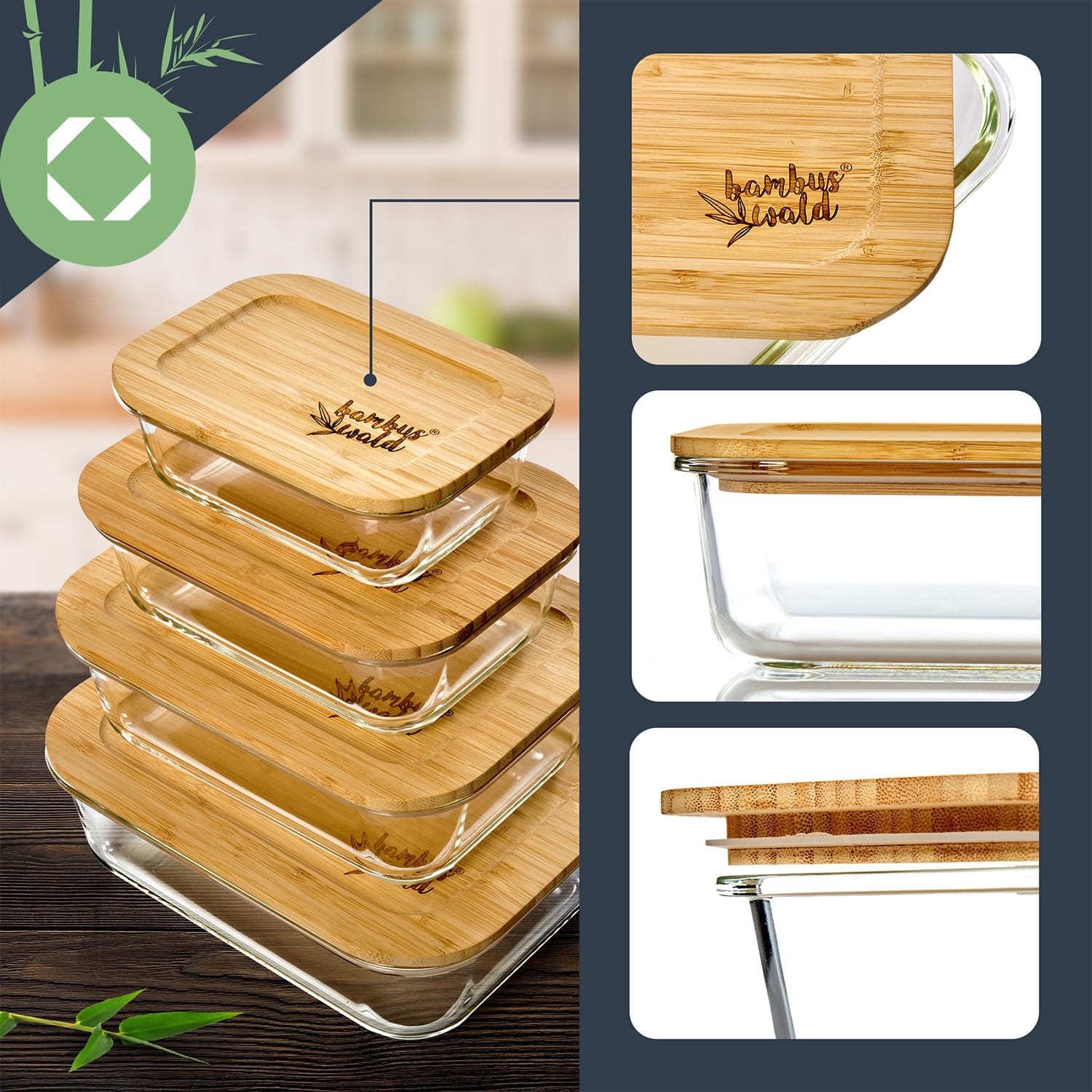 Elegantná súprava všestranných pomocníkov Klarstein bambuswald: 4 dózy na skladovanie potravín v rôznych veľkostiach. Na skladovanie potravín, syrov alebo klobásy v chladničke, na skladovanie zásob na polici alebo na zabalenie desiatej – použitie súpravy je takmer neobmedzené. Vďaka robustnému borosilikátovému sklu sú dózy vhodné dokonca na zohrievanie alebo mrazenie potravín. Vďaka tesnému bambusovému vrchnáku so silikónovým tesnením zostáva všetko pevne uzavreté a potraviny si udržia dlho svoju arómu. Praktická, udržateľná, elegantná: súprava naukladaná na seba priťahuje pozornosť na tvojej kuchynskej polici.