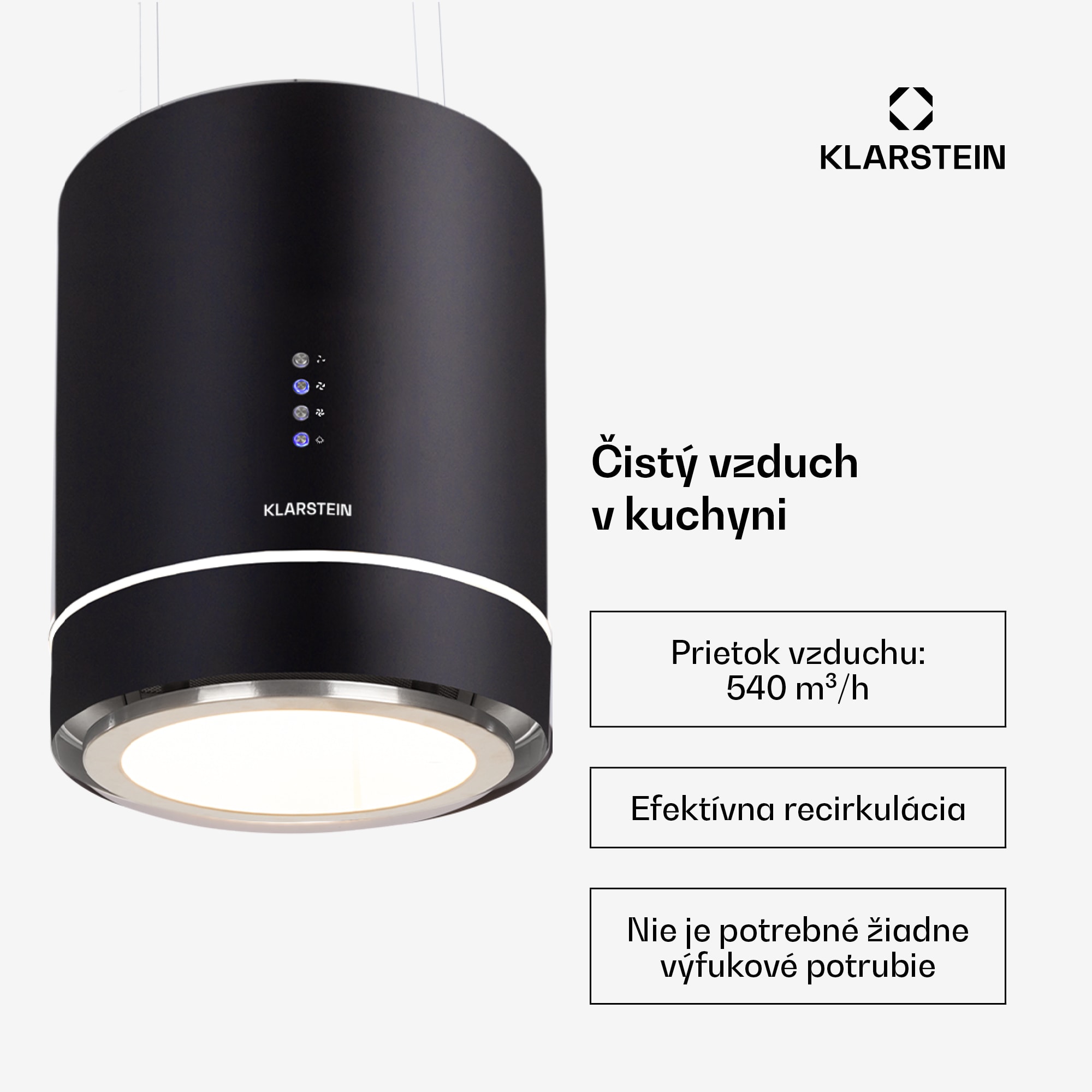 Budúcnosť odparovania výparov: ostrovčekový digestor Klarstein Tron Ambience prináša do kuchyne futuristický lesk a zbaví vzduch pár a výparov.Dokonalosť pre kuchynský ostrovček. S ostrovčekovým digestorom Klarstein Tron Ambience získa otvorená varná plocha posledné luxusné doladenie, keďže názov zariadenia zároveň pomenúva aj jeho program. Digestor voľne visí zo stropu na odolných, 140 cm dlhých oceľových lankách a efektívne sa postará o odstránenie výparov vznikajúcich pri varení. V troch výkonnostných úrovniach neúnavne cirkuluje vzduch s prietokom vzduchu až do 540 m³/h, čím neúnavne odstraňuje z kuchynského vzduchu mastnotou a pachy. Vďaka tomu je ideálny pre veľké priestory americkej ostrovčekovej kuchyne. Pri všetkých výkonnostných úrovniach dodáva zabudované LED diódy osvetlenie varnej plochy svetlé, biele svetlo, zatiaľ čo predný ovládací panel s digitálnym displejom presne zobrazuje jeden zo zvolených výkonnostných stupňov.Ostrovčekový digestor Klarstein Tron Ambience sa vyznačuje dokonale elegantným vonkajším vzhľadom. V dizajne PureAmbience získava okrúhla čierna konštrukcia s jasne osvetleným LED kruhom na varnom ostrove futuristický lesk.Čistý vzduch a elegantný vzhľad: stropný ostrovčekový digestor Klarstein Tron Ambience prinesie do kuchyne žiarivé momenty.Všimnite si, prosím, že tento digestor je určený na recirkulačnú prevádzku a je už už vybavený vhodnými filtrami s aktívnym uhlím.