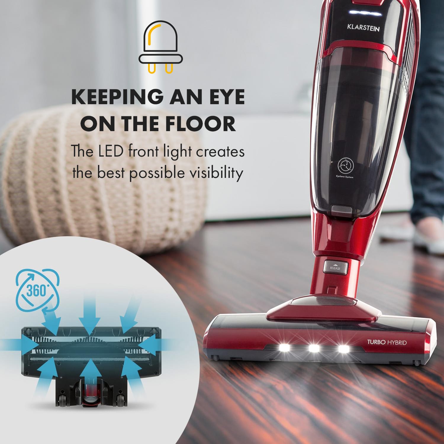 Akumulátorový vysávač Klarstein TurboHybrid má podlahovú časť určenú na hladké povrchy, ako drevené a laminátové podlahy alebo dlažbu. Na hrubšie tkaniny, ako koberce a potahy, je určená ručná časť zariadenia. So zariadením TurboHybrid môžete bez kábla a pohodlne čistiť miesta bez elektrického prúdu, ktoré sú vzdialené od elektrických zásuviek, ako napríklad záhradný altánok. Vďaka zabudovanému 25,2 V lítiovo-iónovému akumulátoru a 2 úrovniam vysávania môžete bez kábla vysávať bez problémov až 50 minút. Vysávač s motorizovanou podlahovou dýzou je pritom extrémne výkonný a dôkladný. Podlahu budete dobre vidieť dokonca aj v tmavých rohoch: akumulátorový vysávač má praktické LED osvetlenie, ktoré spoľahlivo naznačuje cestu. Aj na ťažko dostupných miestach je zariadenie Clean Turismo vynikajúce: Zámena podlahového vysávača na ručný vysávač je veľmi jednoduchý a vybavíte ho v priebehu niekoľkých sekúnd odobratím držiaka. Sada príslušenstva poskytuje všetko pre každý druh vysávania: Okrem funkcie podlahového vysávača môžete v prípade potreby nasadiť na ručný vysávač dodávanú hubicu na čalúnenie a štrbinovú hubicu. Cyklónový filtračný systém je veľmi účinný a nevyžaduje vrecko: Nádoba na nečistoty sa dá po použití ľahko oddeliť od ručného vysávača a vyprázdniť. Na ďalšie použitie možno vysávač nabiť prúdom v kompaktnej nabíjacej stanici. Stanica pritom nemusí byť pevne namontovaná: môže byť veľmi flexibilne umiestnená kdekoľvek a potrebuje spolu s vysávačom len veľmi málo miesta. Perfektný na rýchle aj dôkladné čistenie bez spleti káblov: akumulátorový vysávač TurboHybrid od spoločnosti Klarstein.