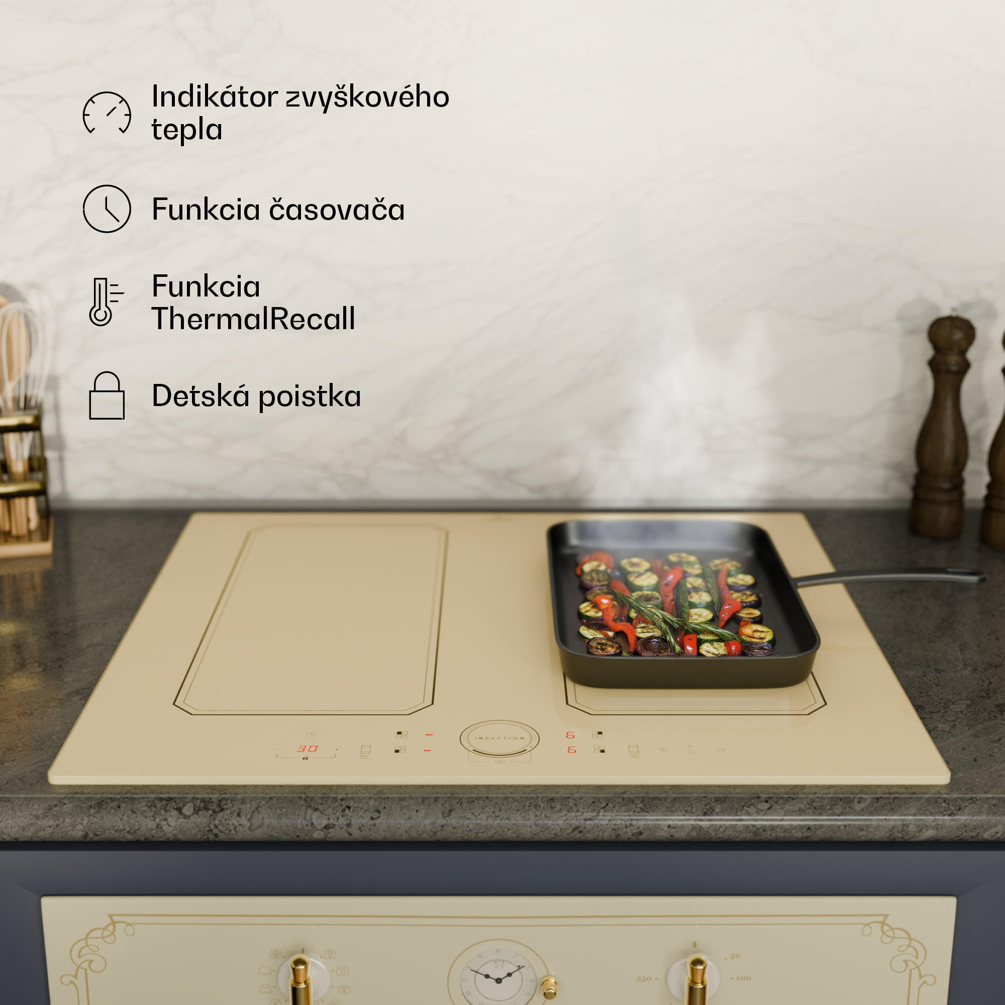 Jednoducho flexibilnejšie varenie: Indukčná varná doska Victoria 4 Flex od Klarstein umožňuje optimálne využitie priestoru s minimálnou spotrebou energie počas varenia. Štyri varné plochy s celkovým výkonom 7400 W privedú obsah vašich hrncov a panvíc do varu v rekordnom čase a možno ich spojiť do jednej flexi zóny prostredníctvom VarioHeating. Všetky jednotlivé zóny je možné regulovať samostatne a majú funkciu ThermoBoost, ktorá poskytuje zvýšený výkon pre rýchly ohrev. Sklokeramická varná doska Victoria 4 Flex sa jednoducho ovláda pomocou integrovaného senzorového dotykového ovládacieho panela a digitálneho displeja. To znamená, že žiadne gombíky, ani ovládacie prvky neprenikajú cez povrch kuchynskej linky. Indukčná varná doska Victoria 4 Flex od Klarstein vizuálne presvedčí svojím ľahko udržiavateľným a elegantným sklokeramickým povrchom: varná doska sa bez problémov hodí do každej kuchynskej linky – či už klasickej alebo modernej.
