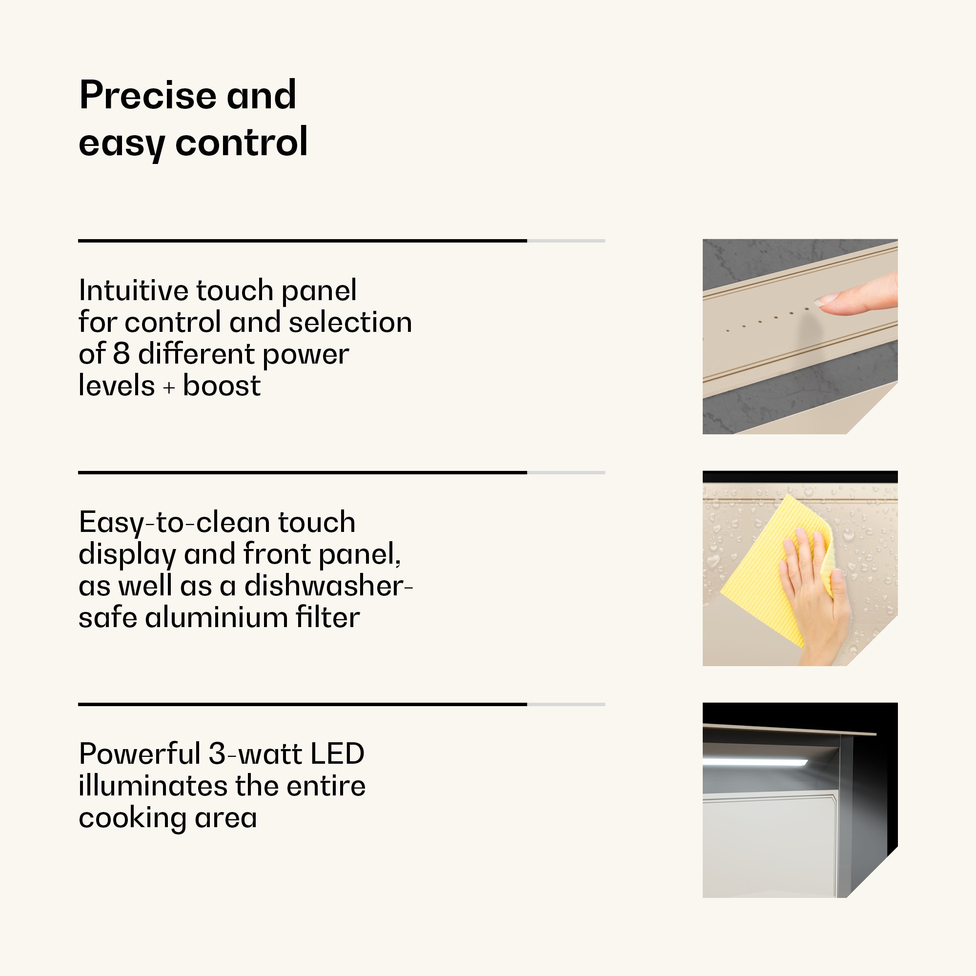 Downdraft-digestor Klarstein Victoria prináša do vašej kuchyne moderný dizajn a výkonnú technológiu. Vďaka triede energetickej účinnosti A zabezpečuje ekologickú prevádzku a šetrí vašu peňaženku. Digestor ponúka 8 úrovní výkonu a funkciu Boost, ktorá umožňuje zvýšiť prietok vzduchu až na 713,8 m³/h. Vďaka výkonnému 120 W BLDC-motoru zostáva hlučnosť minimálne 52 dB, čo z neho robí jeden z najtichších digestorov na trhu. Motor tiež prispieva k vysokej energetickej účinnosti s ročnou spotrebou energie len 17,3 kWh.Digestor sa obsluhuje pomocou užívateľsky prívetivého dotykového panela, ktorý uľahčuje ovládanie. Downdraft-digestor Klarstein Victoria je vynikajúcim doplnkom každej modernej kuchyne, ktorá kladie dôraz na účinnosť, tichú prevádzku a jednoduchú obsluhu.