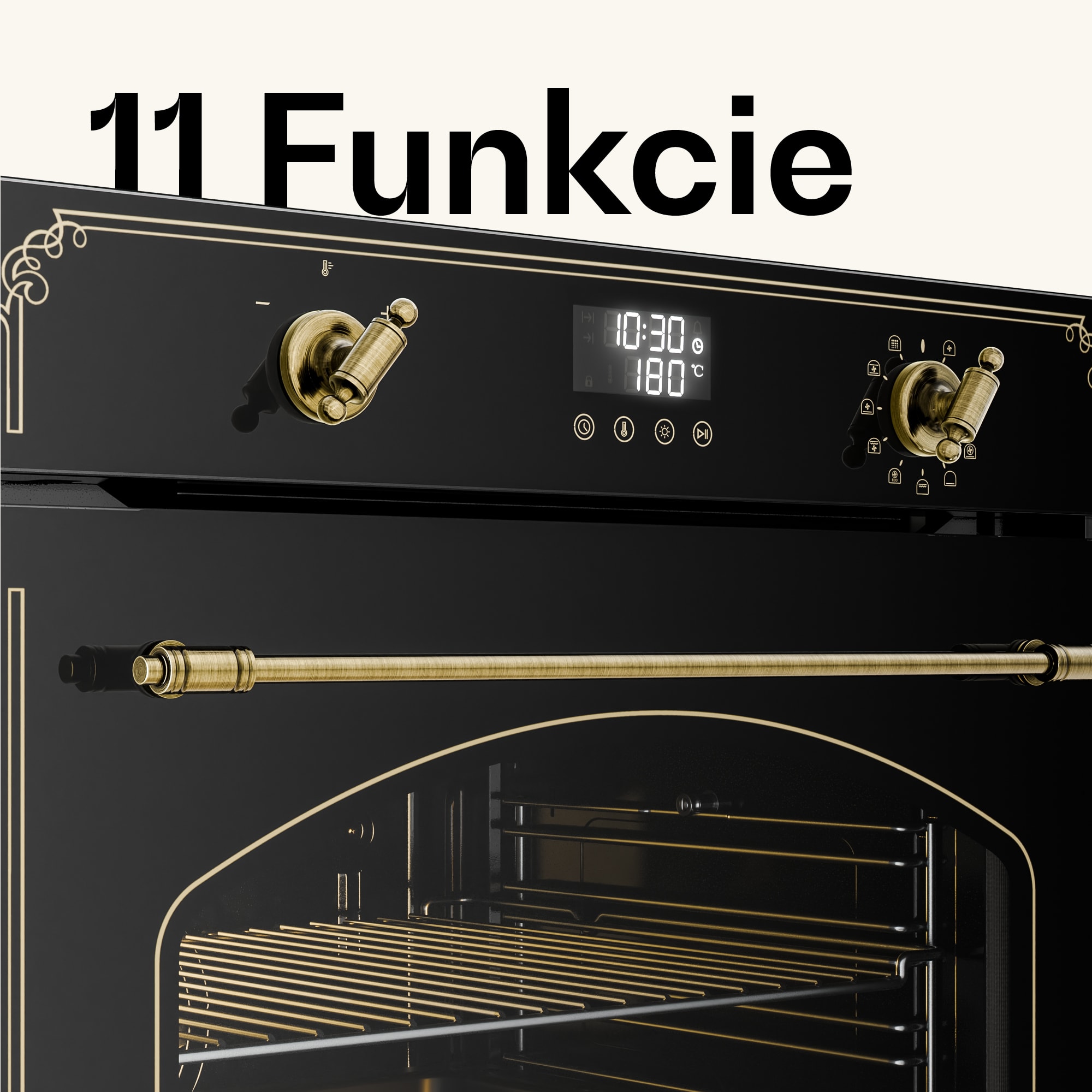 Pyro-rúra Klarstein Victoria kombinuje dizajn inšpirovaný retro štýlom s vysokým výkonom a modernou technológiou. Táto rúra je súčasťou dizajnového radu Victoria a vďaka zlatým detailom inšpirovaným viktoriánskym štýlom stelesňuje nadčasový vintage šarm, ktorý z nej robí prirodzený stredobod každej kuchyne.S objemom 76 litrov je vhodná aj do domácností, kde sa pečie často a vo veľkom množstve. Smaltovaný povrch interiéru uľahčuje čistenie, rovnako ako aj odnímateľné bočné police.Univerzálny plech a rošt sú súčasťou balenia. Spolu s rôznymi prevádzkovými režimami táto rúra umožňuje všestranné metódy varenia.Funkcia pyrolýzy potom zabezpečí dôkladné čistenie tým, že pec zahreje na vysokú teplotu a jednoducho spáli všetky zvyšky. Zostane len trochu popola, ktorý sa dá ľahko odstrániť.Chceli by ste si zariadiť celú kuchyňu s eleganciou inšpirovanou viktoriánskym štýlom? Objavte všetky naše spotrebiče Victoria a vytvorte si nadčasovú, harmonickú kuchyňu!
