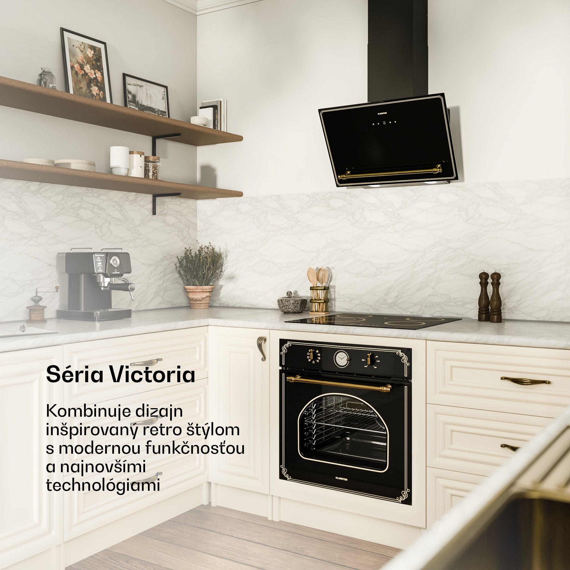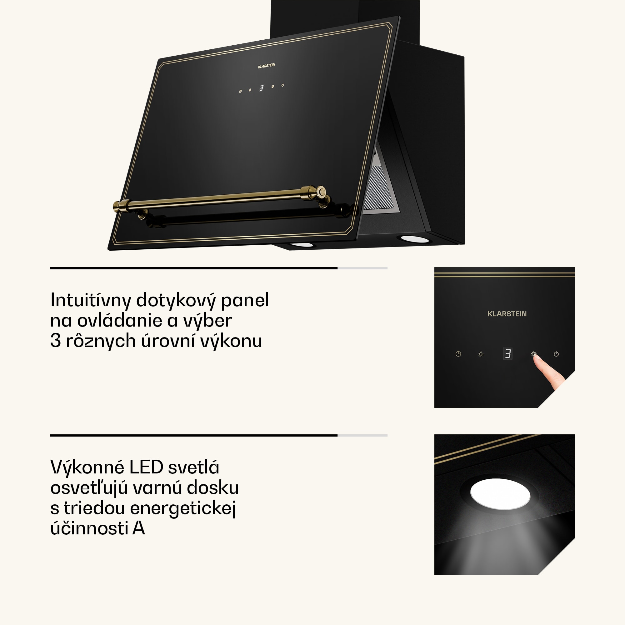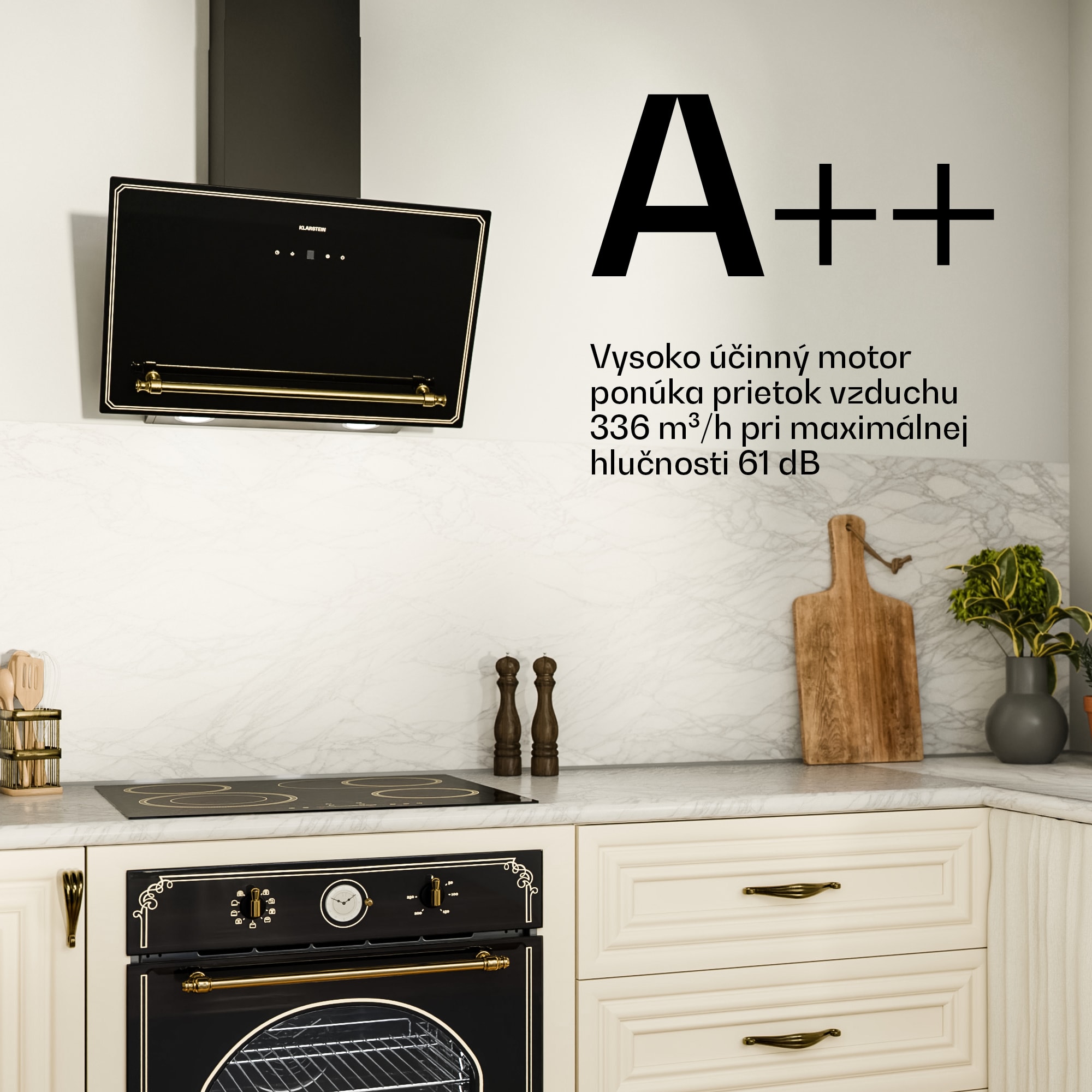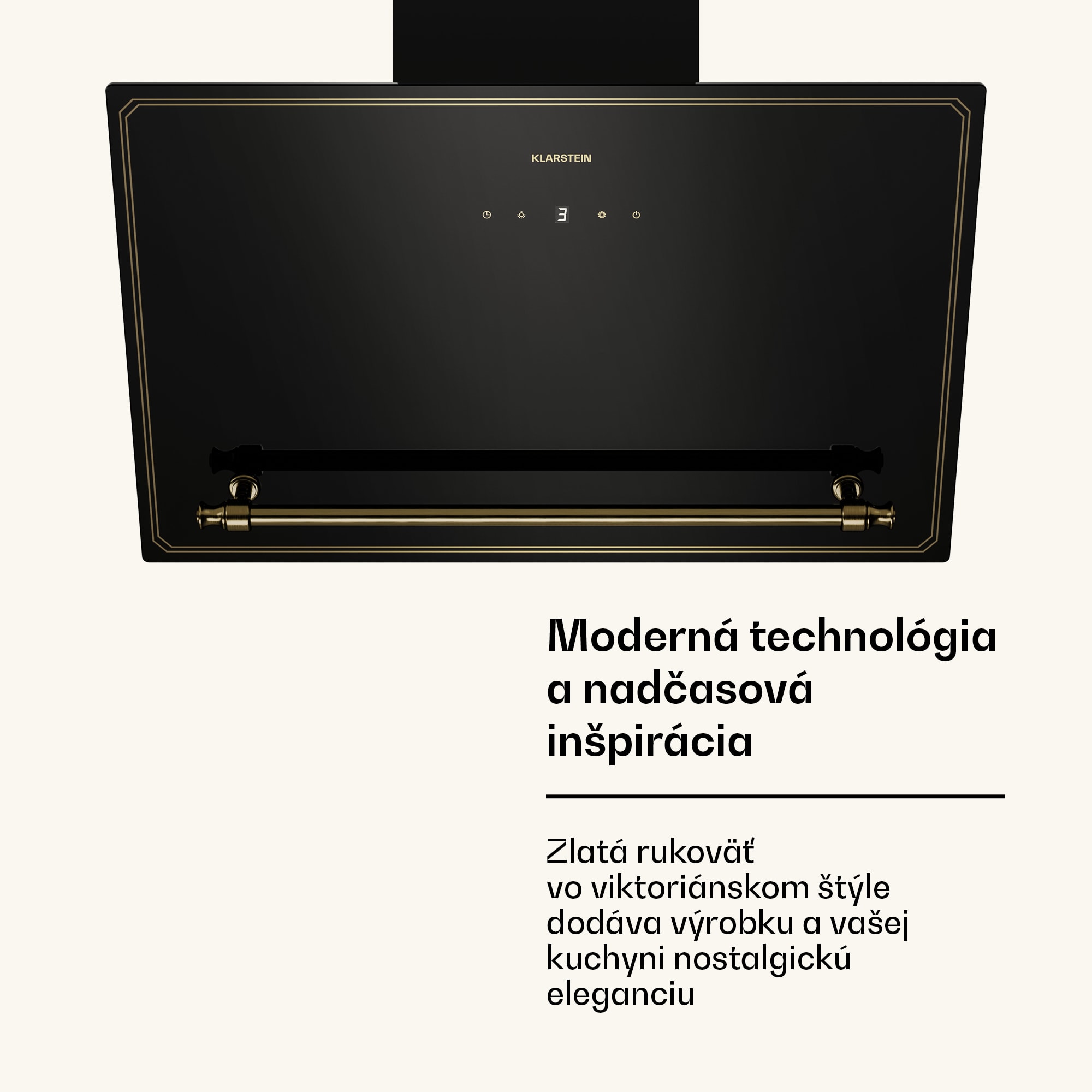 Šikmý digestor Klarstein Victoria – moderná technológia s nádychom vintage dizajnu.Prináša najmodernejšie technológie do vašej kuchyne s nádychom inej éry v sofistikovanej kombinácii čiernej a zlatej farby – nápadná zlatá rukoväť inšpirovaná viktoriánskym štýlom pozdvihuje celočierny dizajn s jemnými zlatými líniami sledujúcimi okraje krytu.Presvedčí nielen dizajn, ale aj výkonný motor s dvojitým prietokom vzduchu 336 m³/h, ktorý stále šetrí energiu vďaka triede energetickej účinnosti A++.Dotykový ovládací panel s krásne osvetleným LED displejom poskytuje jednoduchú obsluhu.Šikmý digestor Klarstein Victoria spája nadčasovú inšpiráciu a pokročilé funkcie, vďaka ktorým bude vaša kuchyňa každý deň bez nežiaducich pachov.