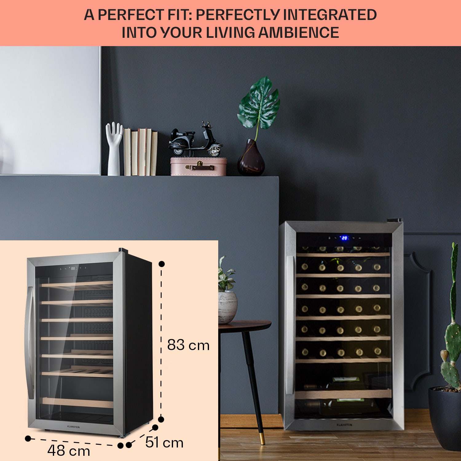 Vinotéka Vinamour 32 Uno od Klarstein sa postará o ten najlepší pôžitok z vína. Vďaka jednej chladiacej zóne poskytuje správnu teplotu na pitie celkovo 36 fľašiam červeného alebo bieleho vína naraz. Teplotu chladenia od 4 do 18 °C možno nastaviť pomocou dotykového ovládacieho panela – ideálne aj pre šumivé šampanské. Vytvára luxusnú atmosféru a luxusné moky prezentuje osobitým spôsobom. Biele osvetlenie sa elegantne zameriava na uložené vína a panoramatické sklenené dvere poskytujú dokonalý výhľad na všetko.Z lásky k vínu: vinotéka Vinamour 32 Uno od Klarstein ponúka štýlové skladovanie vína, sektov a iných nápojov.