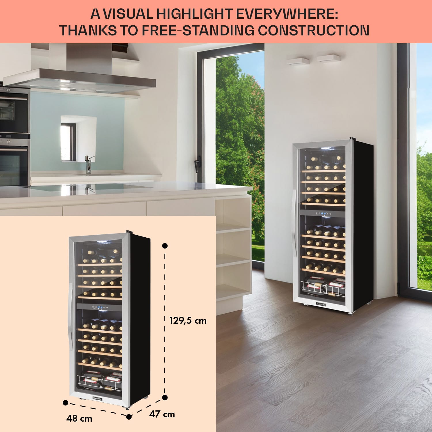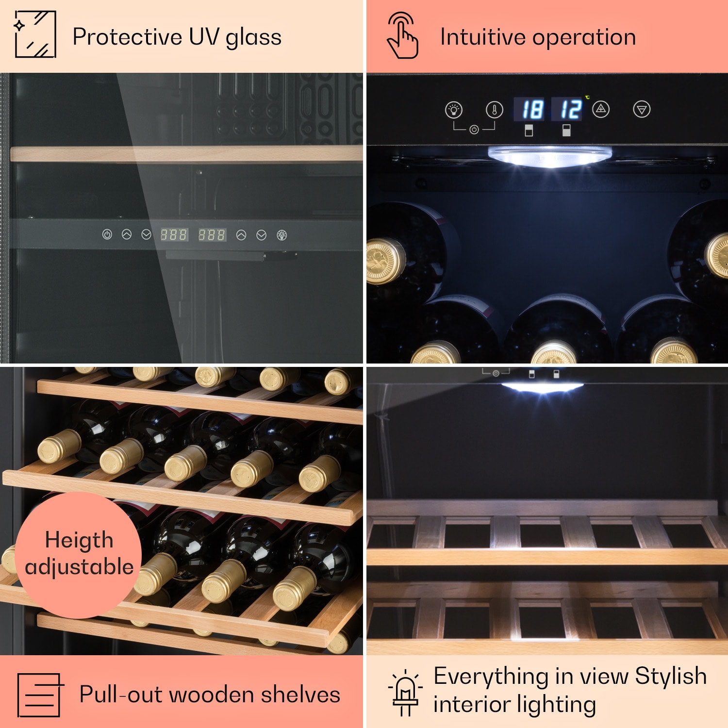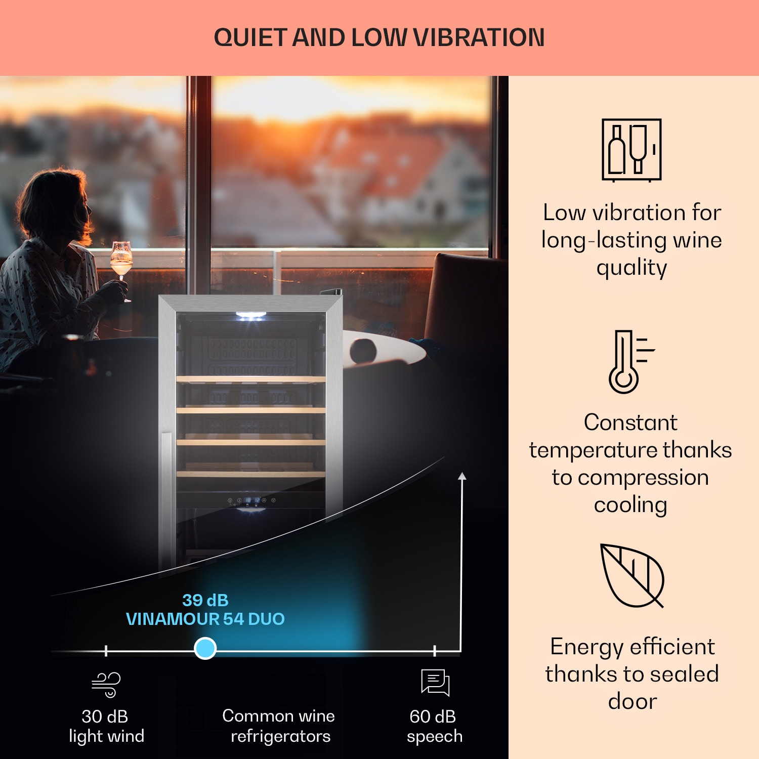 Pre ten najlepší pôžitok z vína: Vinotéka Klarstein Vinamour 48 Uno zaujme reguláciou teploty až na stupeň presne, 3 policovými zásuvkami a prehľadným dotykovým ovládacím panelom. Predné dvere z dvojstenného skla zabezpečujú dômyselnú prezentáciu kvalitných vín. Prepínateľné vnútorné osvetlenie šikovne dotvára scénu pre uložené fľaše. Klarstein Vinamour 48 Uno chladnička na víno je preto štýlovou ozdobou nielen každej domácnosti, ale aj barov a reštaurácií. Táto dvojzónová vinotéka umožňuje uchovávať rôzne druhy vín pri ideálnych teplotách.Chladnička na víno Vinamour 48 Uno od spoločnosti Klarstein ponúka štýlový a moderný úložný priestor na dokonale vychladené vína.