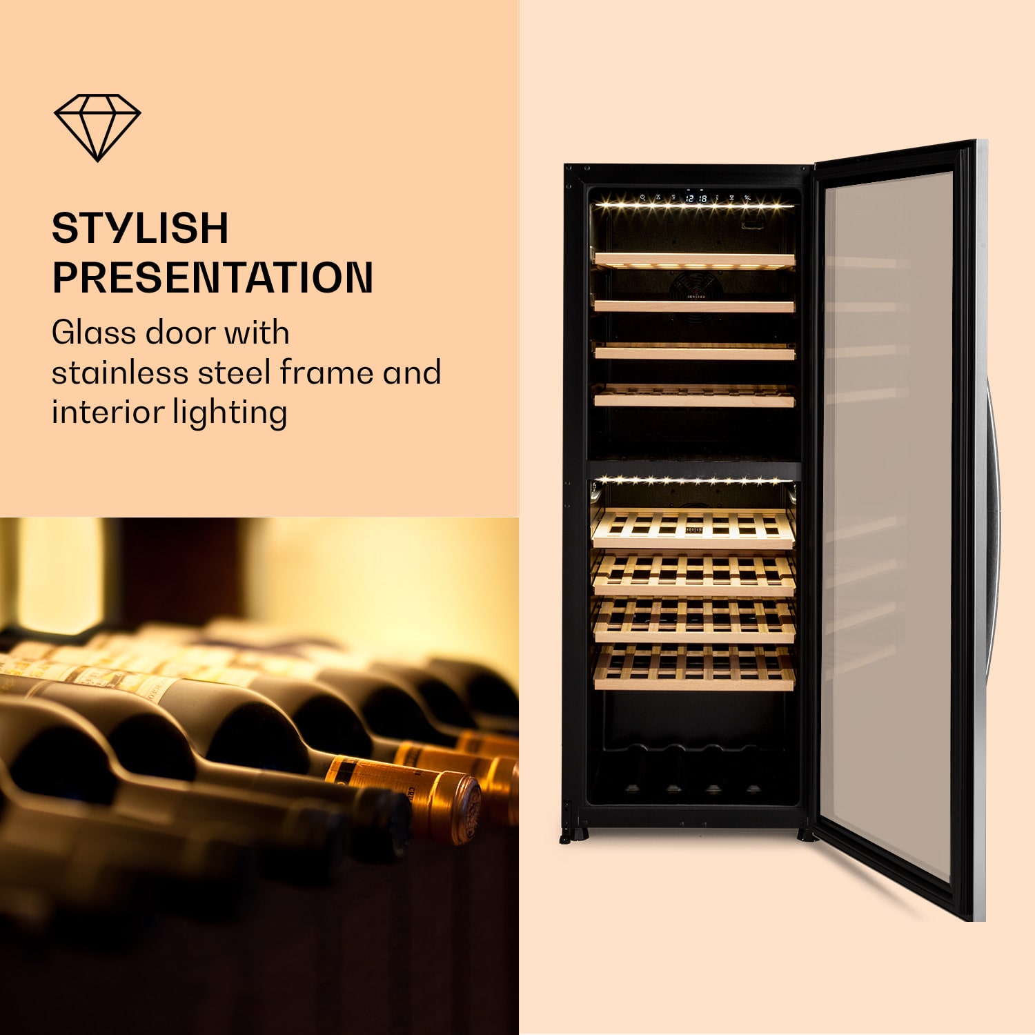 Vinotéka Vinamour 77 Duo od Klarstein premení dobré víno na úžasný pôžitok. Jej veľký vnútorný priestor poskytuje atraktívny a dobre temperovaný domov až pre 77 fliaš vína na 8 vyberateľných drevených policiach. Vďaka dvom oddeleným chladiacim zónam sa biele i červené vína chladia súčasne a rozvíjajú tak svoju individuálnu arómu pri teplote od 5 do 20 °C. Táto Dvojzónová vinotéka umožňuje nastaviť teplotu cez prehľadný dotykový panel s LCD displejom. Vďaka zapínateľnému vnútornému LED osvetleniu, veľkým panoramatickým skleneným dverám a strohému dizajnu sa Vinamour 77 Duo stane skutočnou ozdobou vašej domácnosti. Poznámka: Na uloženie pohárov na víno si môžete objednať aj držiak na poháre z bukového dreva (10032964).