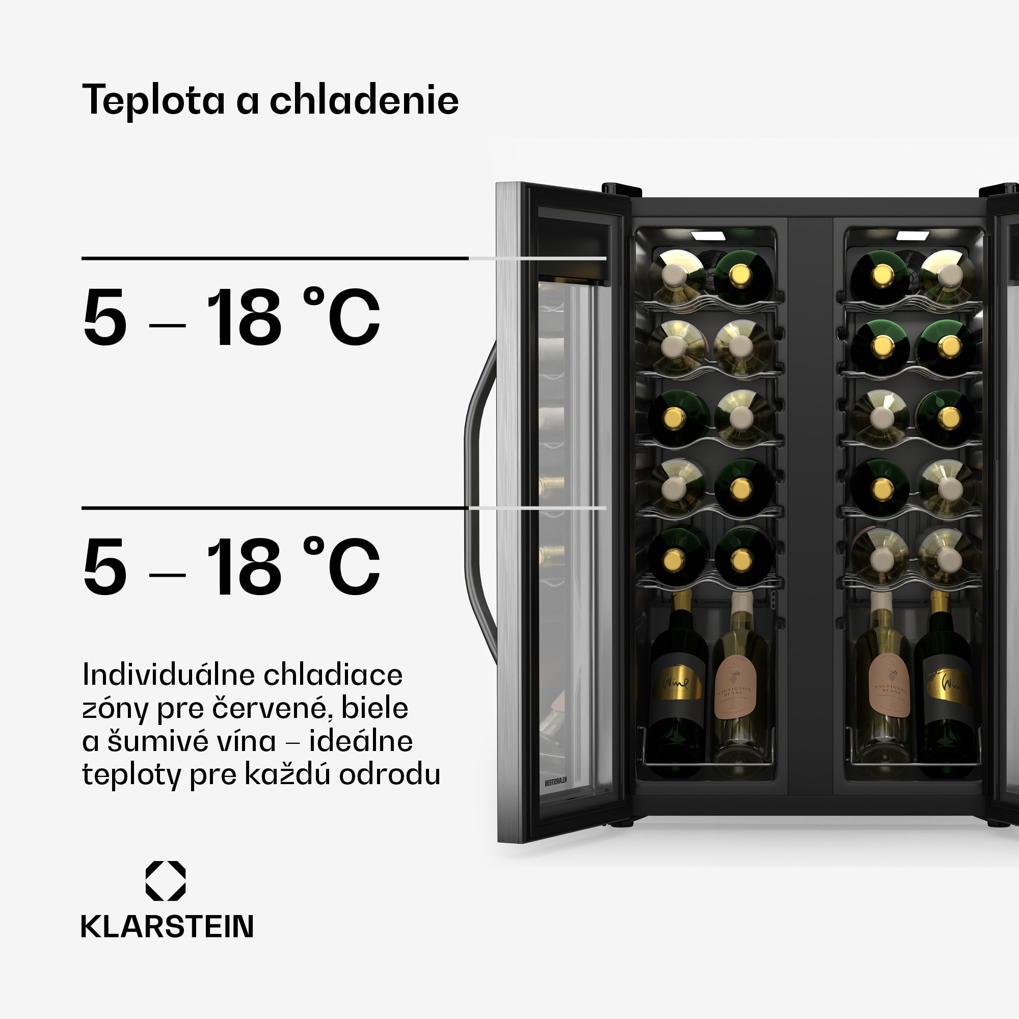 Vinotéka Klarstein Vinamour sdvojitými dverami z nehrdzavejúcej ocele ponúka milovníkom vína štýlové a funkčné riešenie na optimálne uskladnenie a prezentáciu ich zbierky vín. Vďaka oddeleným chladiacim zónam pre červené a biele vína sa každá fľaša udržiava pri ideálnej teplote od 5 do 18 °C.Robustné kovové police s plastovým povrchom ponúkajú bezpečný úložný priestor až pre 24 fliaš, zatiaľ čo vnútorné LED osvetlenie elegantne prezentuje vašu zbierku. Vďaka intuitívnemu dotykovému ovládaniu možno teplotu dvojdverovej chladničky na víno Klarstein Vinamour nastaviť bez námahy. Táto vinotéka je voľne stojaca a možno ju flexibilne umiestniť do akéhokoľvek prostredia, takže je ideálna pre meniace sa životné situácie. Vibrácie a UV žiarenie sú minimalizované, aby sa dlhodobo zachovala kvalita vášho vína.Aby sa maximalizovala životnosť a výkon chladničky na víno Vinamour, mala by sa pravidelne čistiť a inštalovať v dobre vetranej miestnosti. Vyhnite sa priamemu slnečnému žiareniu a silným vibráciám.Vychutnajte si svoje vína vždy pri ideálnej teplote – objednajte si teraz dvojzónovú chladničku na víno Klarstein Vinamour Double Door!