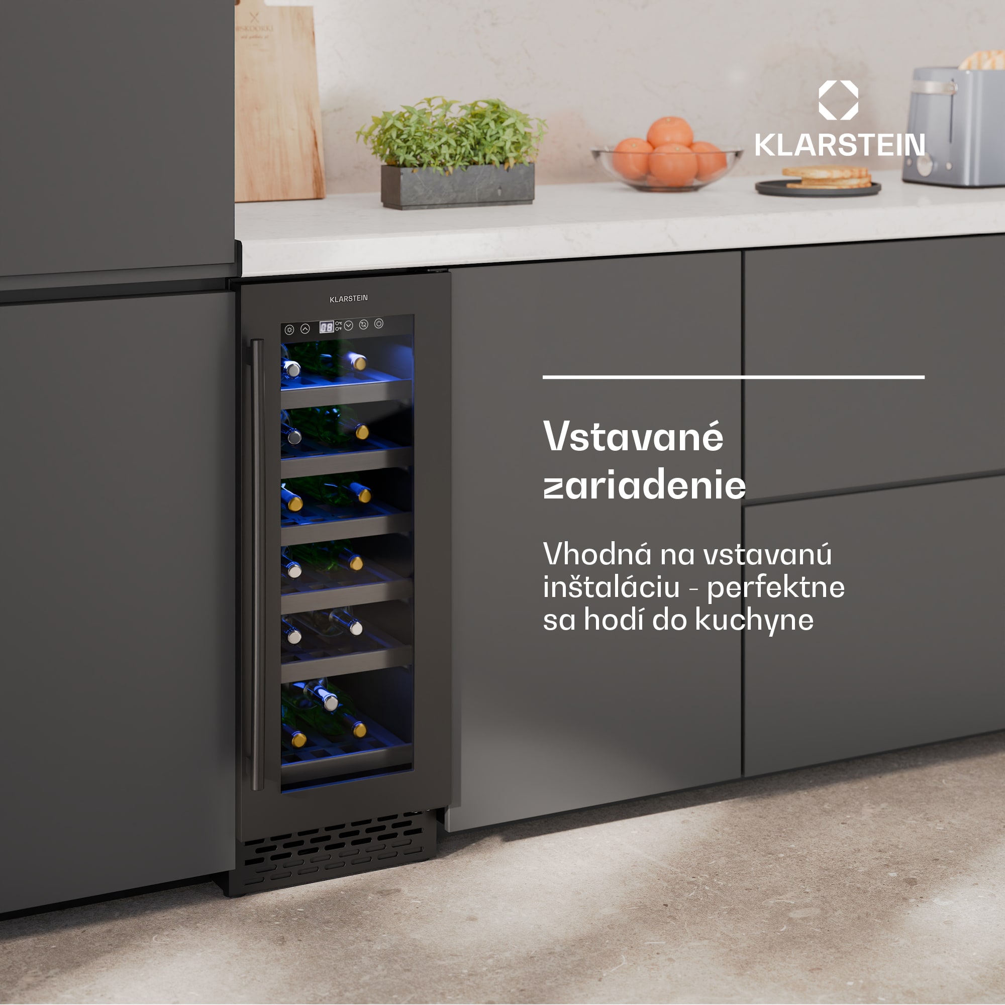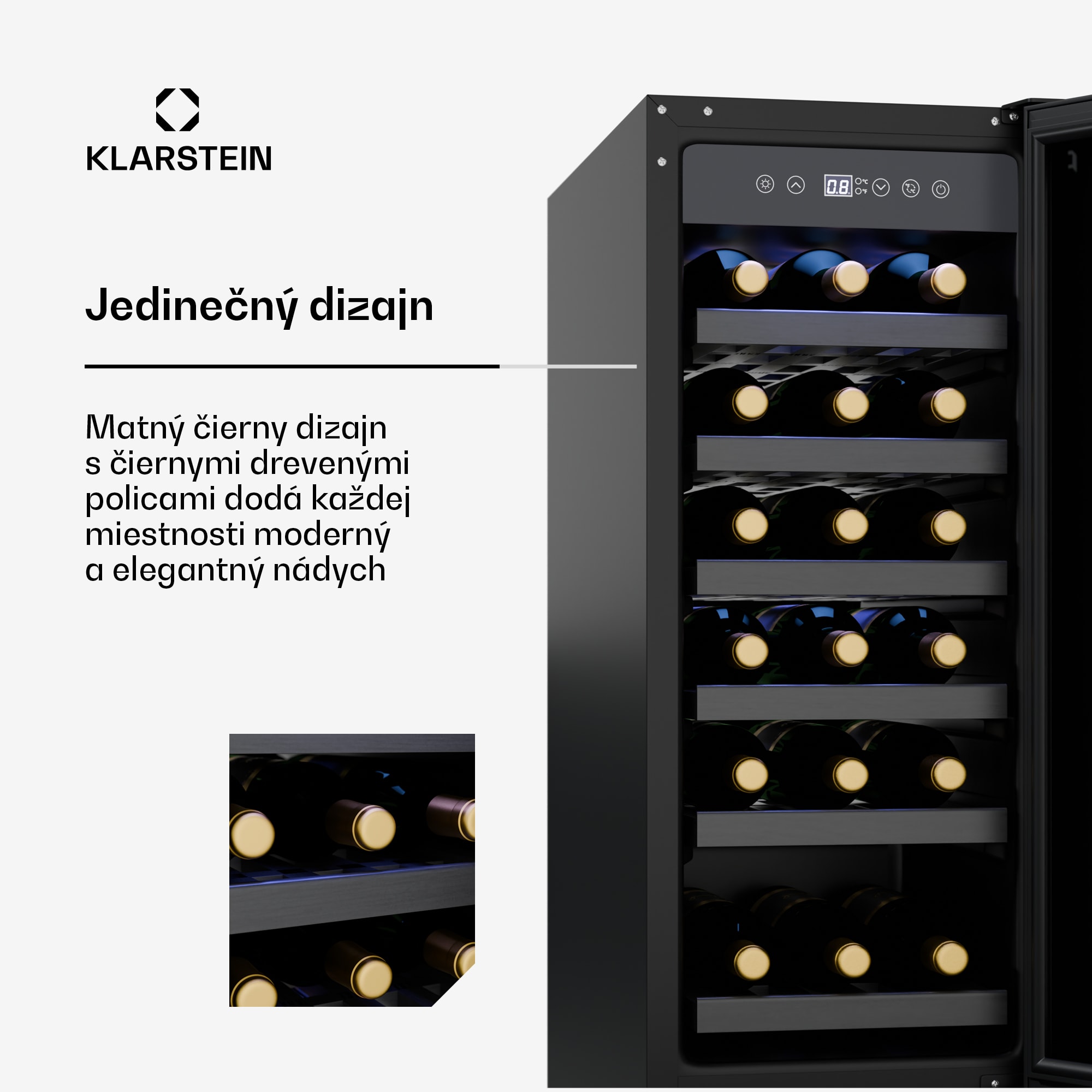 Vinotéka Klarstein Vinovilla 18 Uno ponúka exkluzívny spôsob uskladnenia až pre 18 fliaš vína v optimálnych podmienkach. Vďaka štýlovému matnému čiernemu dizajnu a čiernym dreveným policiam sa bez problémov začlení do každej modernej kuchyne, či už ako vstavaný alebo podskrinkový spotrebič. Táto vstavaná vinotéka vďaka presnému teplotnému rozsahu 5 až 18 °C zaisťuje Klarstein Vinovilla dokonalú teplotu pitia pre vaše vína, zatiaľ čo tichá prevádzka zaisťuje príjemnú atmosféru.Vďaka chladiacej zóne, ktorá umožňuje konštantnú teplotu od 5 do 18 °C, poskytuje Klarstein Vinovilla 18 Uno ideálne prostredie na skladovanie vína. Masívne drevené police sa dajú ľahko vybrať, takže môžete pohodlne ukladať fľaše rôznych veľkostí. Vďaka intuitívnemu ovládaciemu panelu LED môžete teplotu nastaviť rýchlo a jednoducho. Elegantný matný čierny dizajn a minimalistické LED osvetlenie robia z tejto chladničky na víno štýlový doplnok každej kuchyne. Vinovilla je nielen praktická, ale aj vizuálne príťažlivá, takže je ideálnou voľbou pre milovníkov vína.Doprajte svojim vínam dokonalé uskladnenie a vytvorte štýlový pútač pozornosti vašej kuchyne – s chladničkou na víno Klarstein Vinovilla 18 Uno!