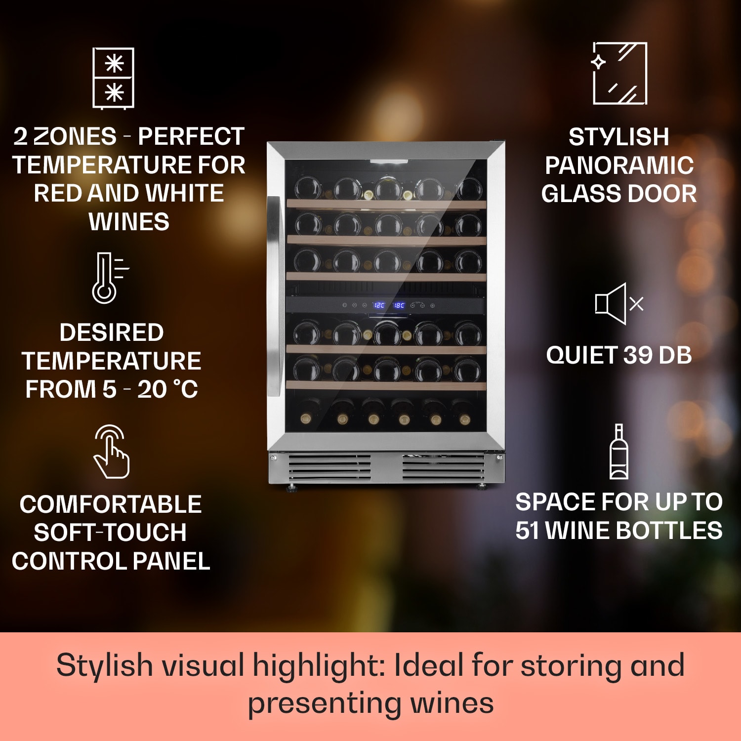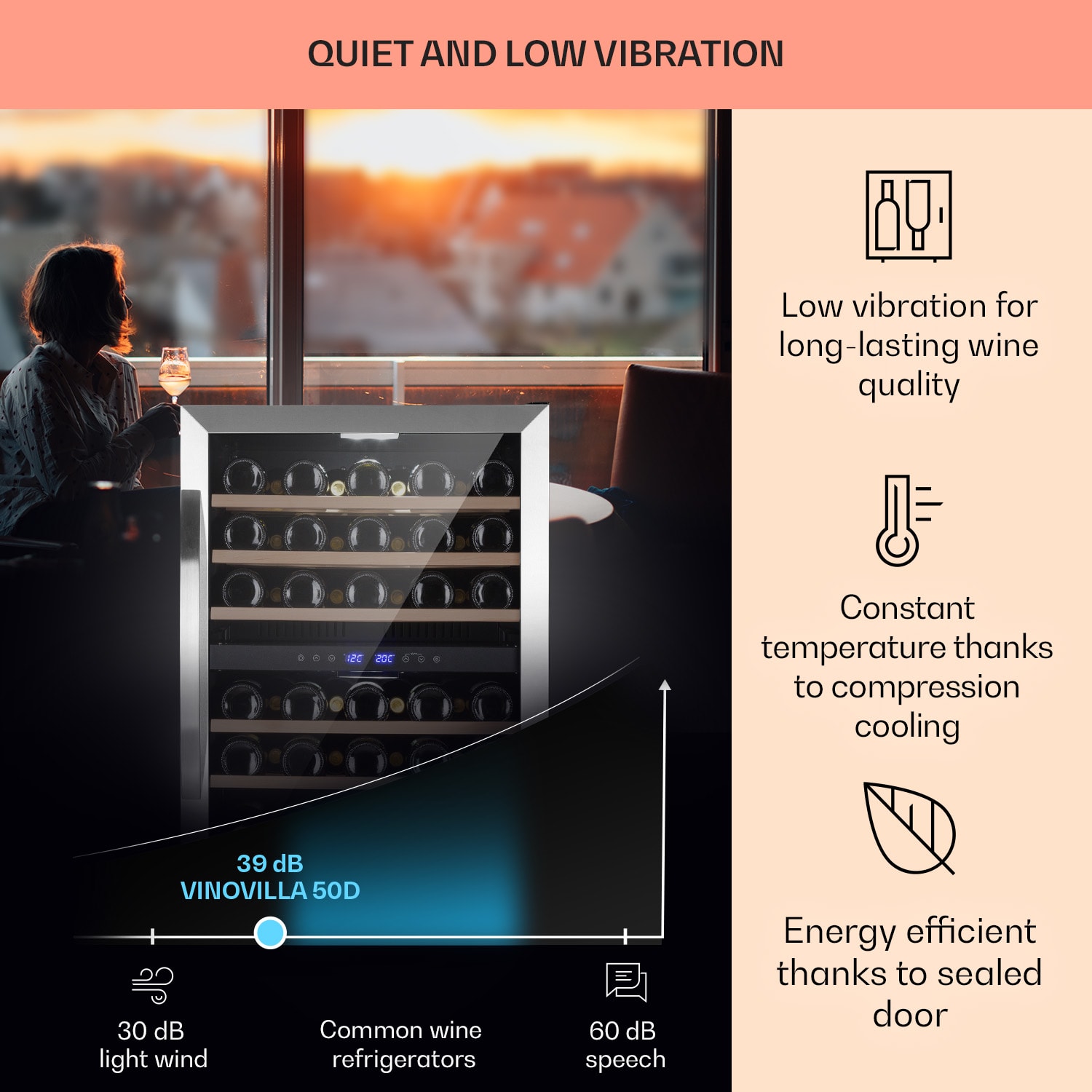 Elegantný dizajn a prezentácia: Dvojzónová vinotéka Klarstein Vinovilla 50 Duo urobí z vášho vína aj vizuálny pôžitok! Jej dve zóny sa dajú chladiť oddelene, čo umožňuje súčasne chladiť a skladovať červené a biele vína pri správnej teplote. Ale aj šampanské, šumivé vína, sekty alebo iné delíkátne nápoje môžu byť vo vinotéke dlhodobo optimálne uložené. Táto vstavaná vinotéka ponúka okrem tých najlepších podmienok na skladovanie a chladenie aj extravagantnú scénu: za UV sklom sú fľaše krásne prezentované na piatich policiach z bukového dreva a v prípade potreby je možné ich štýlovo osvetliť. Nízka prevádzková hlučnosť, antivibračný dizajn a integrovaný filter s aktívnym uhlím šikovne dopĺňajú skladovanie vína.