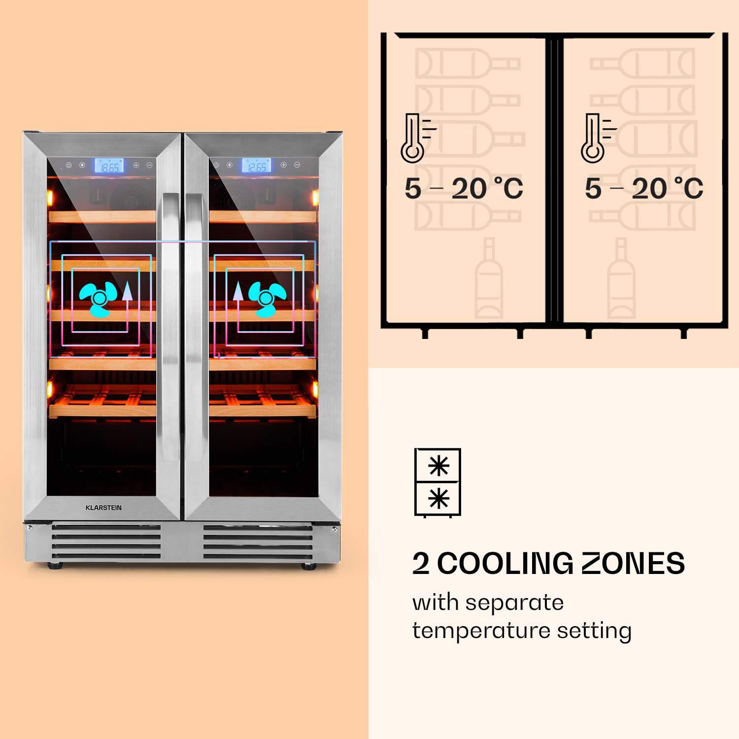 Klarstein Vinovilla Duo 42, dvojzónová vinotéka, 126 l, 42 fliaš, 3 farebné LED osvetlenie, sklenené dvere –Kúpiť