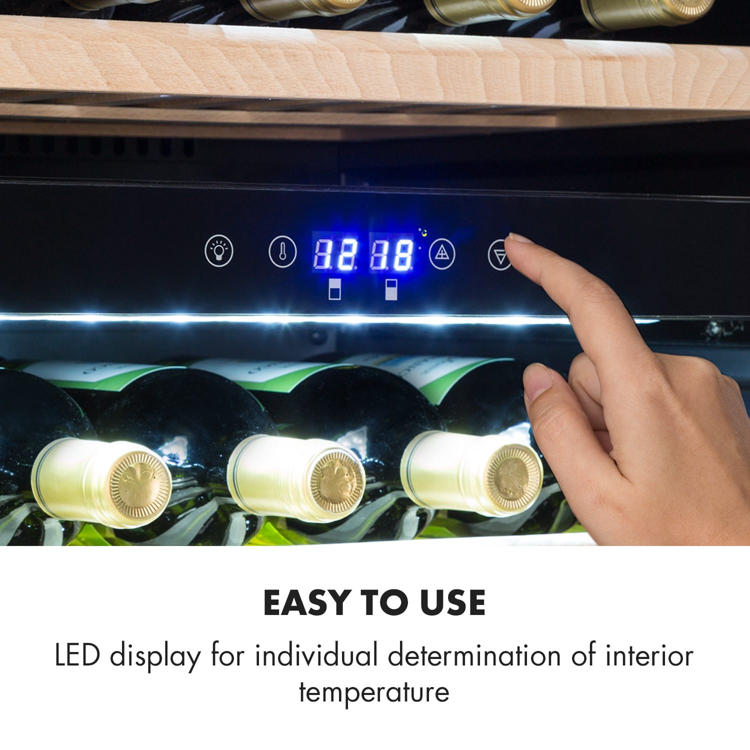 Vinotéka Vinsider 35D Onyx Edition od spoločnosti Klarstein garantuje optimálne uskladnenie Vášho vína pre najlepší pôžitok z jeho pitia. Vďaka vinotéke Klarstein Vinsider 35D Onyx Edition môžete poskytnúť vínu ideálne podmienky, ktoré potrebuje, aby malo optimálnu teplotu na konzumáciu a aby bola zachovaná plná aróma. Jediné, čo musíte urobiť, je otvoriť elegantné predné dvere s rámom OnyxCrystal s tónovaným panoramatickým oknom a umiestniť víno do jednej zo 6 drevených políc. Potom nastavte požadovanú teplotu chladenia a Vaša vinotéka od spoločnosti Klarstein sa postará o vhodné prostredie pre Vaše víno. Keď si ho budete chcieť Vy a Vaši hostia vychutnať, bude mať správnu teplotu: kedykoľvek a vo Vašej priamej blízkosti. Vďaka teplotnému regulátoru je možné vo vinotéke vytvoriť teploty medzi 5 a 22 °C. Tak bude ideálne postarané o biele aj červené víno – či už čoskoro v čase večere, alebo počas ďalších mesiacov Vaše víno bude počas uskladnenia ochránené pred vibráciami alebo dopadom svetla. Vinotéka Vinsider 35D Onyx Edition od spoločnosti Klarstein nanovo interpretuje klasickú vínu pivnicu: v pôsobivom elegantnom dizajne z ocele, skla a dreva. Vďaka prepínateľnému LED osvetleniu interiéru bude Vaše víno v každom čase decentne viditeľné. Pri každej ceste do kuchyne sa teda môžete potešiť pri pohľade na Vašu zbierku vín. Niet divu, ak budú Vaši hostia závistlivo hľadieť na Vašu zbierku vín, pretože takúto vinotéku by mal rád každý! S vinotékou Klarstein Vinsider 35D Onyx Edition bude pôžitok z vína je ešte lepší! Táto dvojzónová vinotéka umožňuje skladovať rôzne druhy vína pri ideálnych teplotách.Tvar fliaš na víno ovplyvňuje maximálny objem a kapacitu vinotéky.