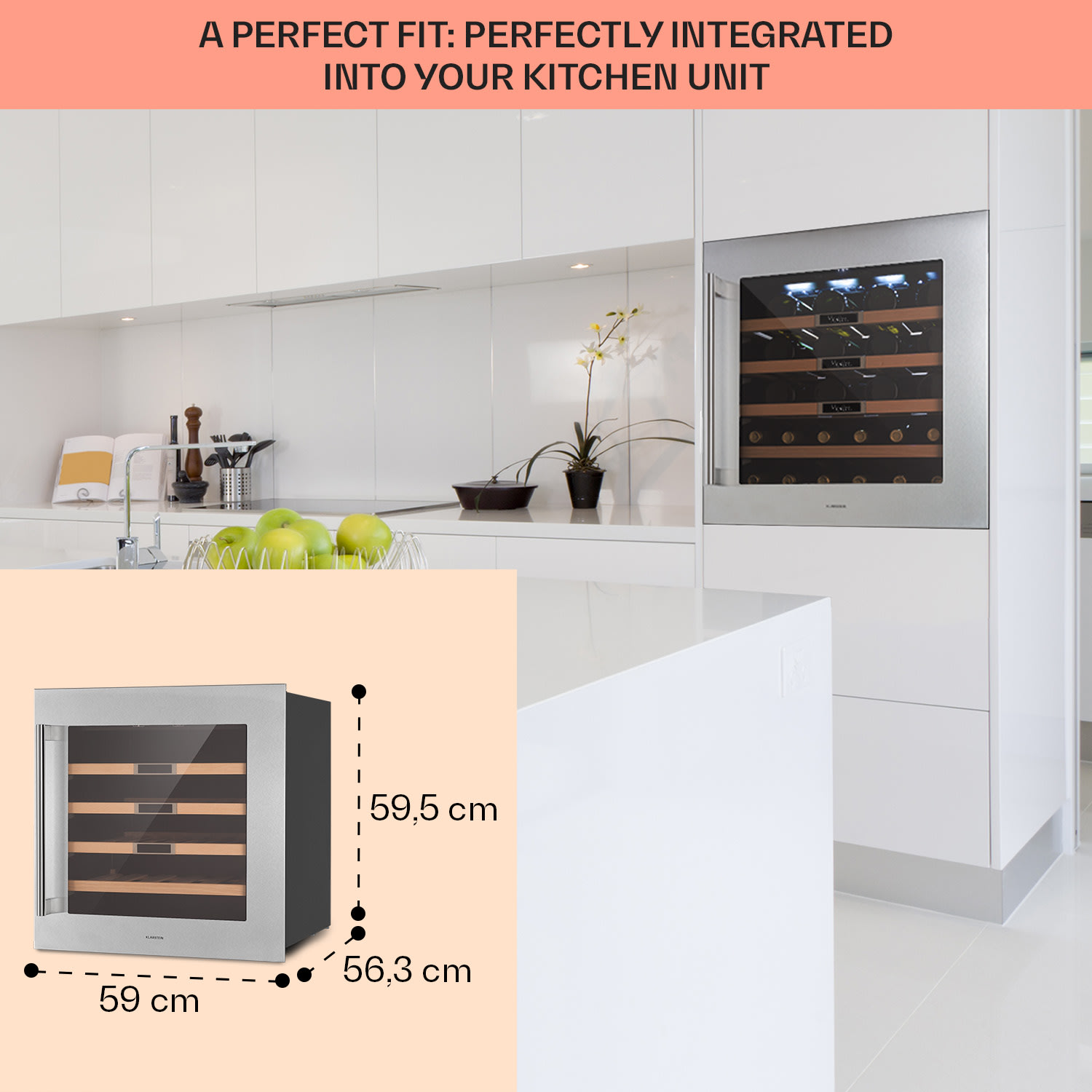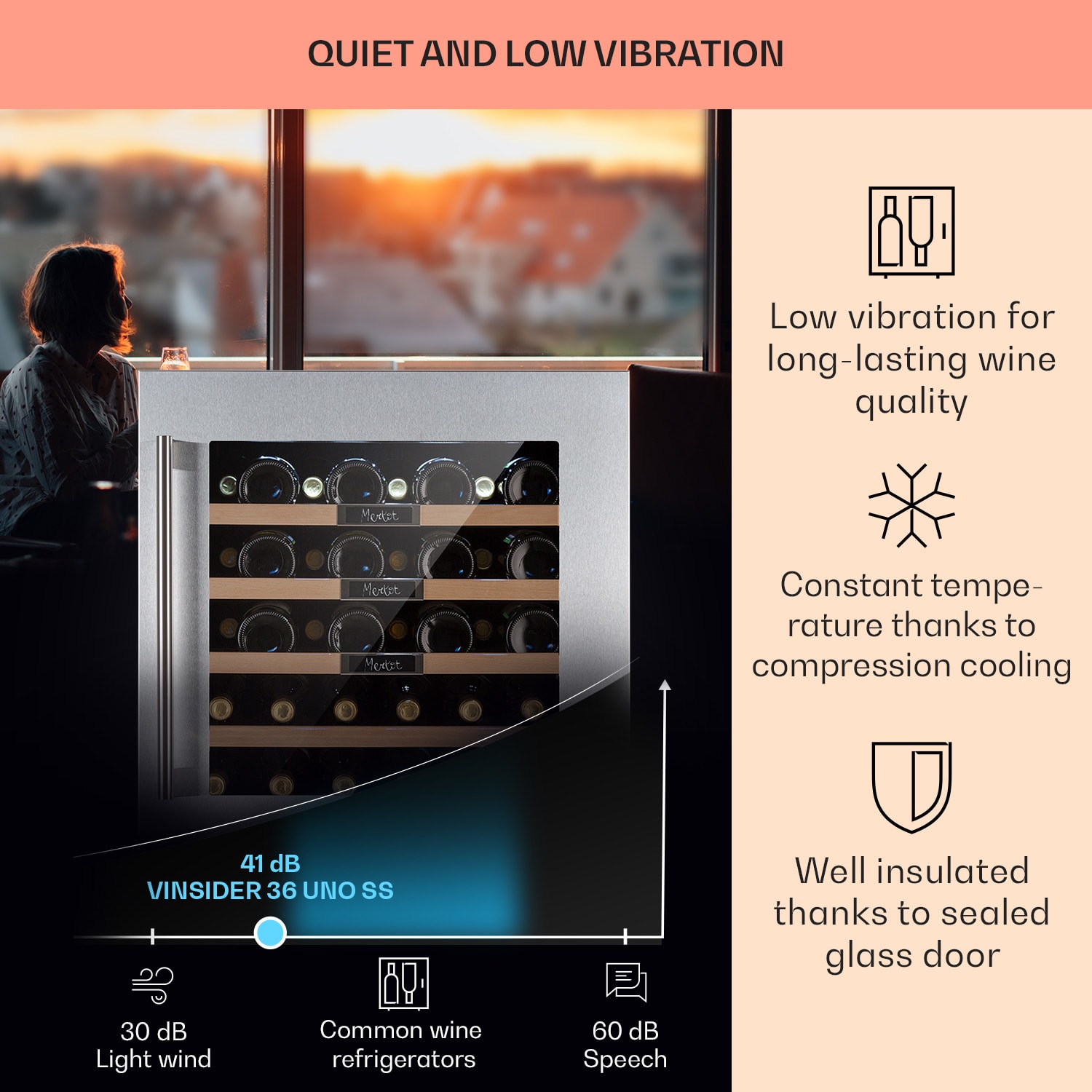 Vďaka vstavanej vinotéke Vinsider 36 Built-In Uno od Klarstein môžete zabezpečiť vínu ideálne podmienky na to, aby plne rozvinulo svoju chuť a vôňu. Všetko čo musíte spraviť je otvoriť elegantné predné dvierka s panoramatickým sklom a položiť víno na jednu zo 4 drevených políc. Potom stačí nastaviť želanú teplotu a vaša vinotéka od Klarstein sa postará o „príjemnú atmosféru pre víno“. Ak budete vašim hosťom chcieť ponúknuť víno, tak bude vždy vychladené na tú správnu teplotu: vždy a po ruke. Vstavaná vinotéka je skvelým doplnkom pre každého milovníka vína.