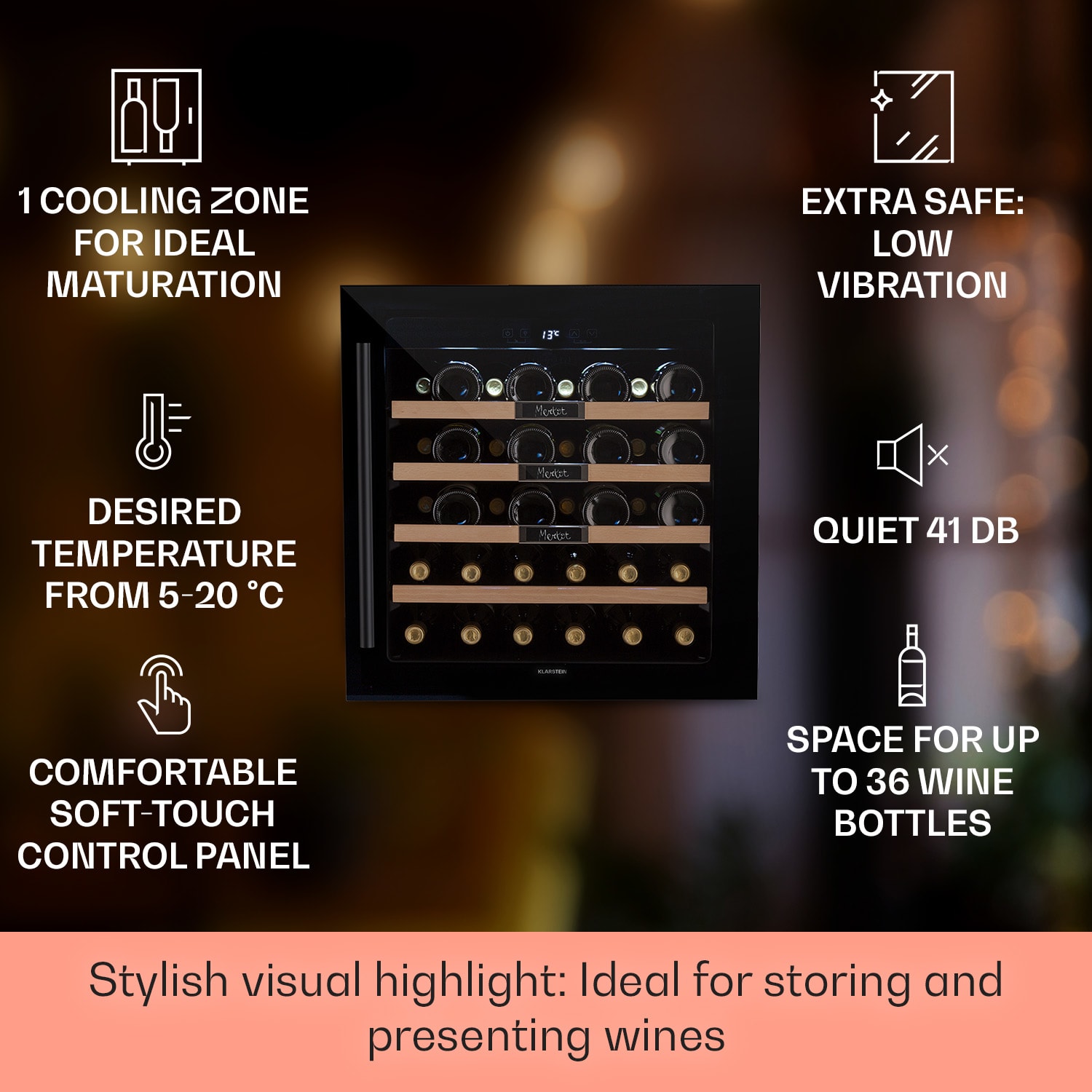 Vďaka vstavanej vinotéke Vinsider 36 Built-In Uno od Klarstein môžete ponúknuť vínu ideálne podmienky na to, aby rozvinulo svoju chuť a vôňu. Všetko čo musíte spraviť je otvoriť elegantné predné dvierka s panoramatickým sklom a položiť víno na jednu zo 4 drevených políc. Potom stačí nastaviť želanú teplotu a vaša vinotéka od Klarstein sa postará o „príjemnú atmosféru pre víno“. Ak budete vašim hosťom chcieť ponúknuť víno, je vždy vychladené na správnu teplotu: vždy a po ruke. Vstavaná vinotéka je skutočne neoceniteľným doplnkom pre každého milovníka vína.