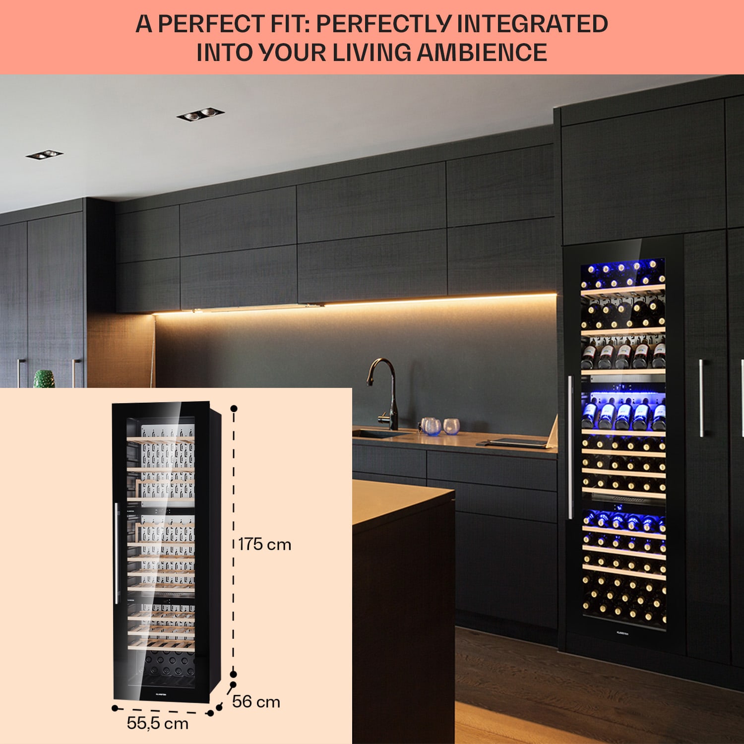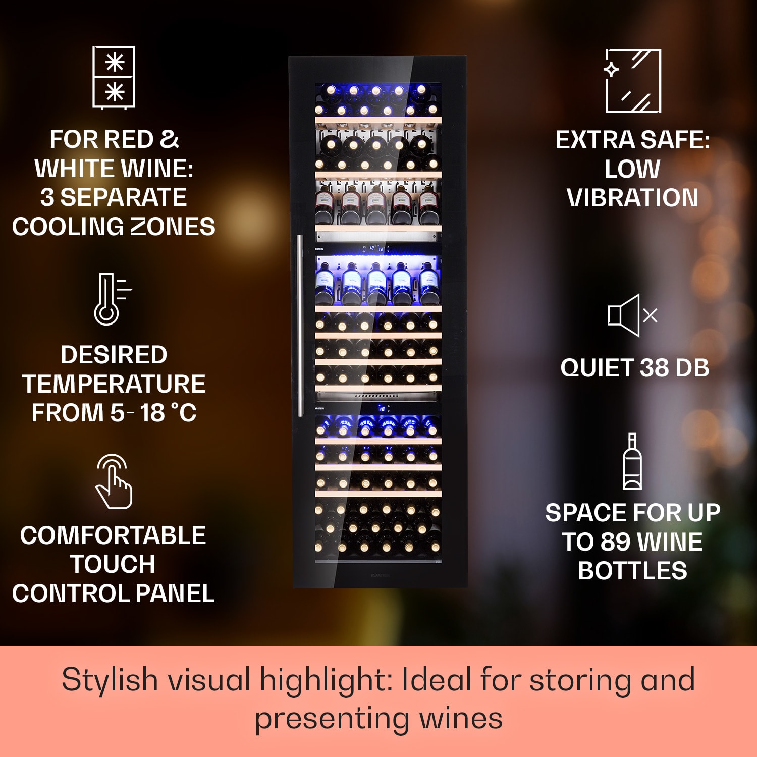 Vďaka vinotéke Klarstein Vinsider 89 Built-In Trio môžete vínu zabezpečiť tú správnu teplotu na pitie a ideálne podmienky pre rozvinutie jeho plnej vôňe. Stačí otvoriť elegantné predné dvere z UV skla a umiestniť fľaše s vínom do 3 oddelených chladiacich zón. Špeciálnou funkciou je, že vinotéku môžete naraz ochladiť na tri rôzne teploty. Červené a biele vína tak získajú ideálnu teplotu na pitie pri najlepších tých podmienkach skladovania. Na celkom 10 elegantných drevených policiach môžete fľaše nielen ideálne uložiť, ale aj veľmi atraktívne prezentovať – trojzónová chladnička na víno od Klarstein sa spoľahlivo postará o „ideálnu klímu pre víno“ a dizajnovo zaujme. Táto vstavaná vinotéka je skutočným klenotom pre každého milovníka vína.Veľký znalec sofistikovaného pôžitku z vína: V 3 oddelených chladiacich zónach vstavanej chladničky na víno od Klarstein môžete súčasne chladiť a skladovať rôzne druhy vína.