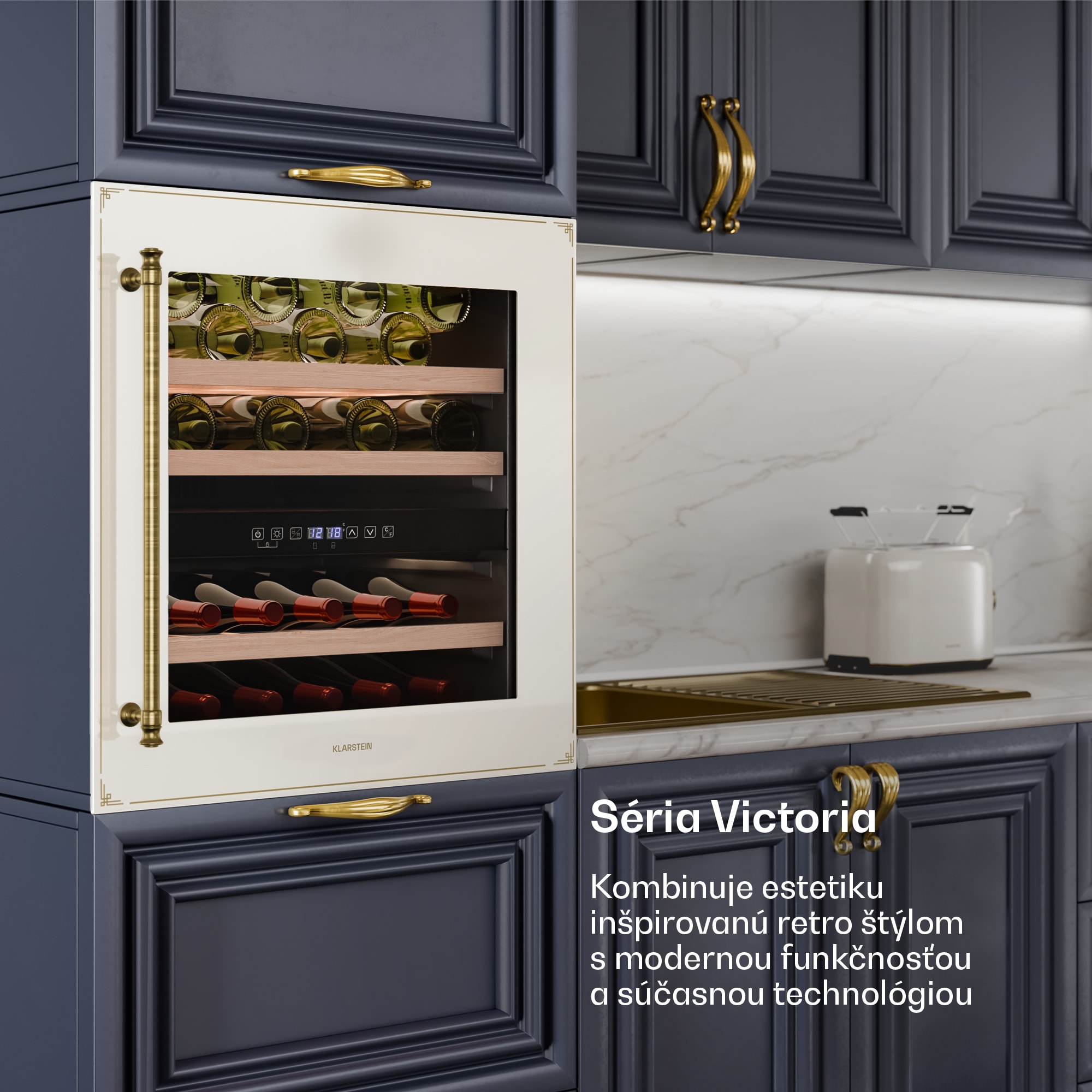 Vinotéka  Klarstein  Vinsider Victoria 36 kombinuje vintage dizajn s optimálnou funkčnosťou na dokonalé uskladnenie a prezentáciu vašich vín.S kapacitou až 36 fliaš ponúka chladnička na víno Klarstein  Vinsider Victoria 36 dostatok priestoru pre vaše najcennejšie vína. Vysokokvalitné spracovanie s odnímateľnými drevenými policami v dvoch chladiacich zónach zaručuje nielen štýlovú prezentáciu, ale aj skladovanie bez vibrácií a s ochranou proti UV žiareniu, ktorá dlhodobo zachováva kvalitu vína. Intuitívne dotykové ovládanie umožňuje jednoduchú reguláciu teploty v rozsahu od 5 do 22 stupňov Celzia, takže vaše vína budú mať vždy ideálnu teplotu na pitie. Vďaka tichej prevádzke s hlučnosťou len 41 dB a elegantnému vnútornému LED osvetleniu chladnička na víno  dokonale zapadne do každej kuchyne a vytvorí príjemnú atmosféru. Chladničku na víno  je potrebné pravidelne čistiť a podľa potreby upravovať teplotu, aby sa zabezpečilo optimálne skladovanie vašich vín. Táto vstavaná vinotéka je ideálnym riešením pre každého milovníka vína.Vyskúšajte rozdiel a kúpte si  chladničku na víno   Klarstein  Vinsider Victoria 36 pre dokonalé uskladnenie vína.