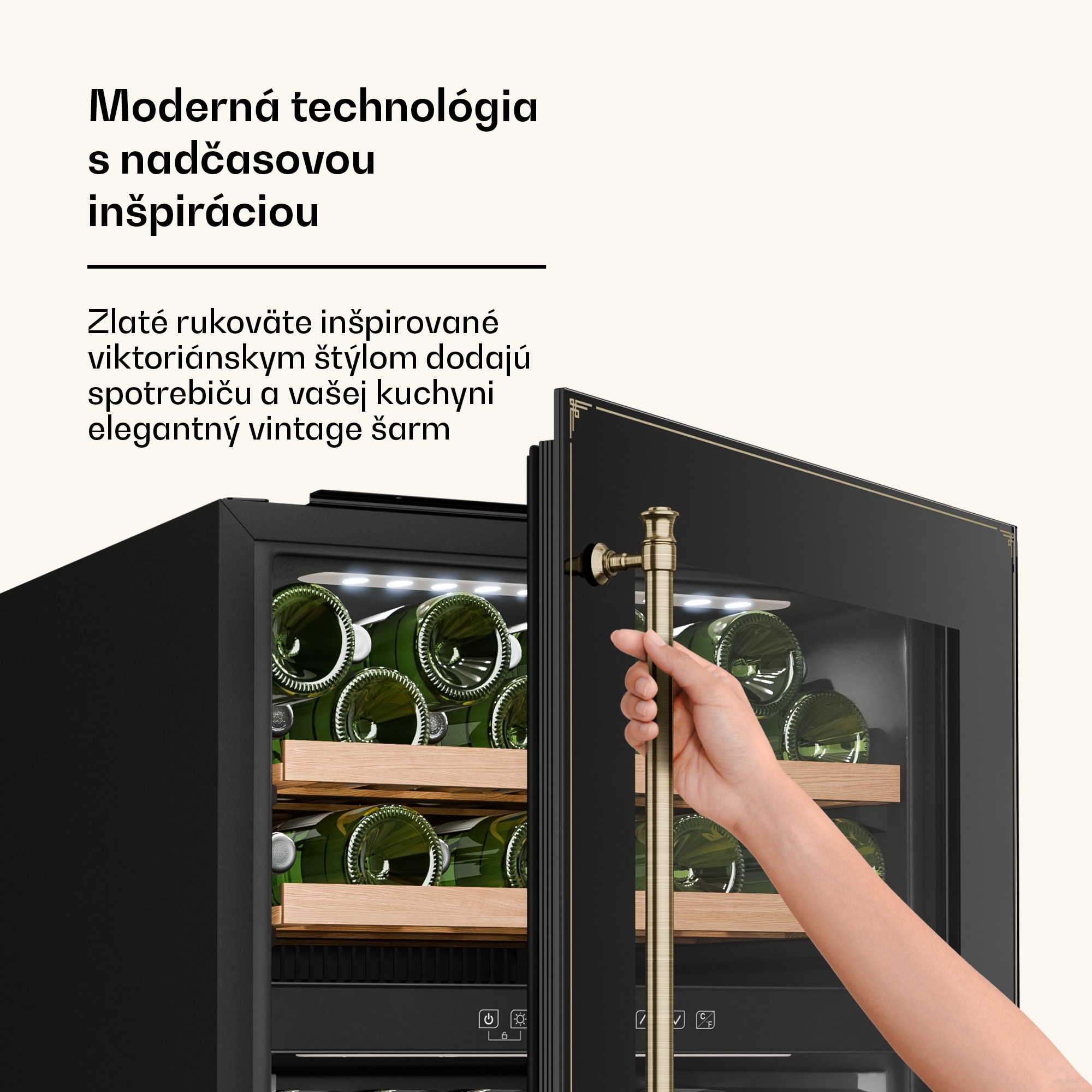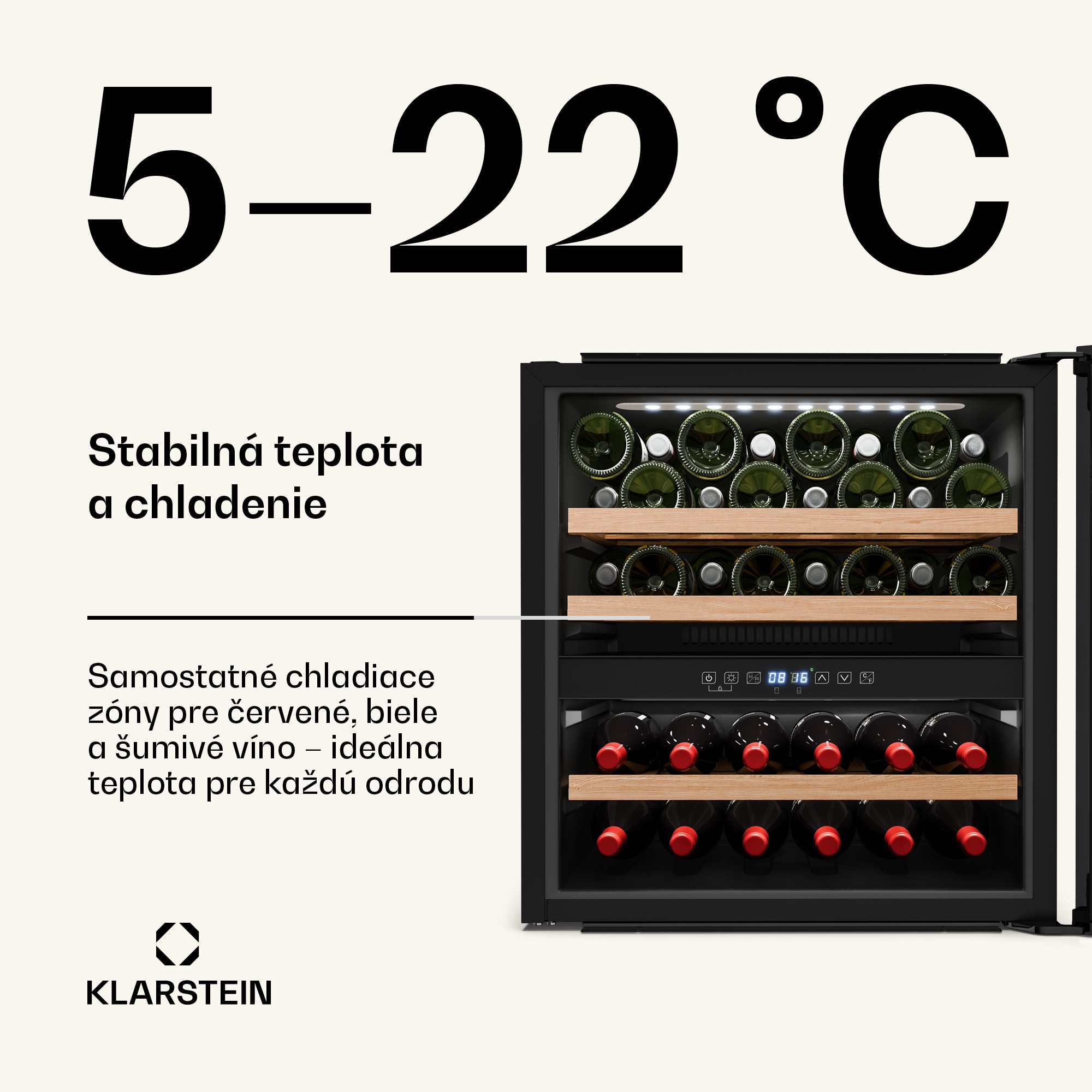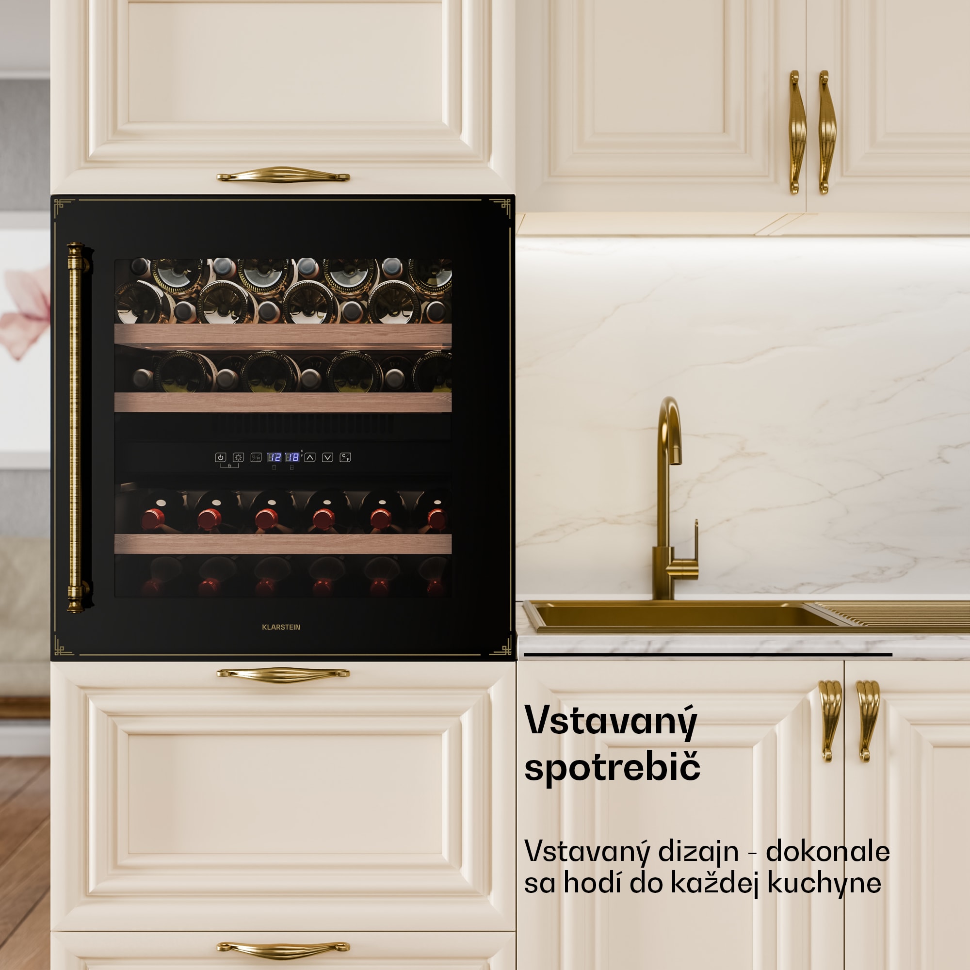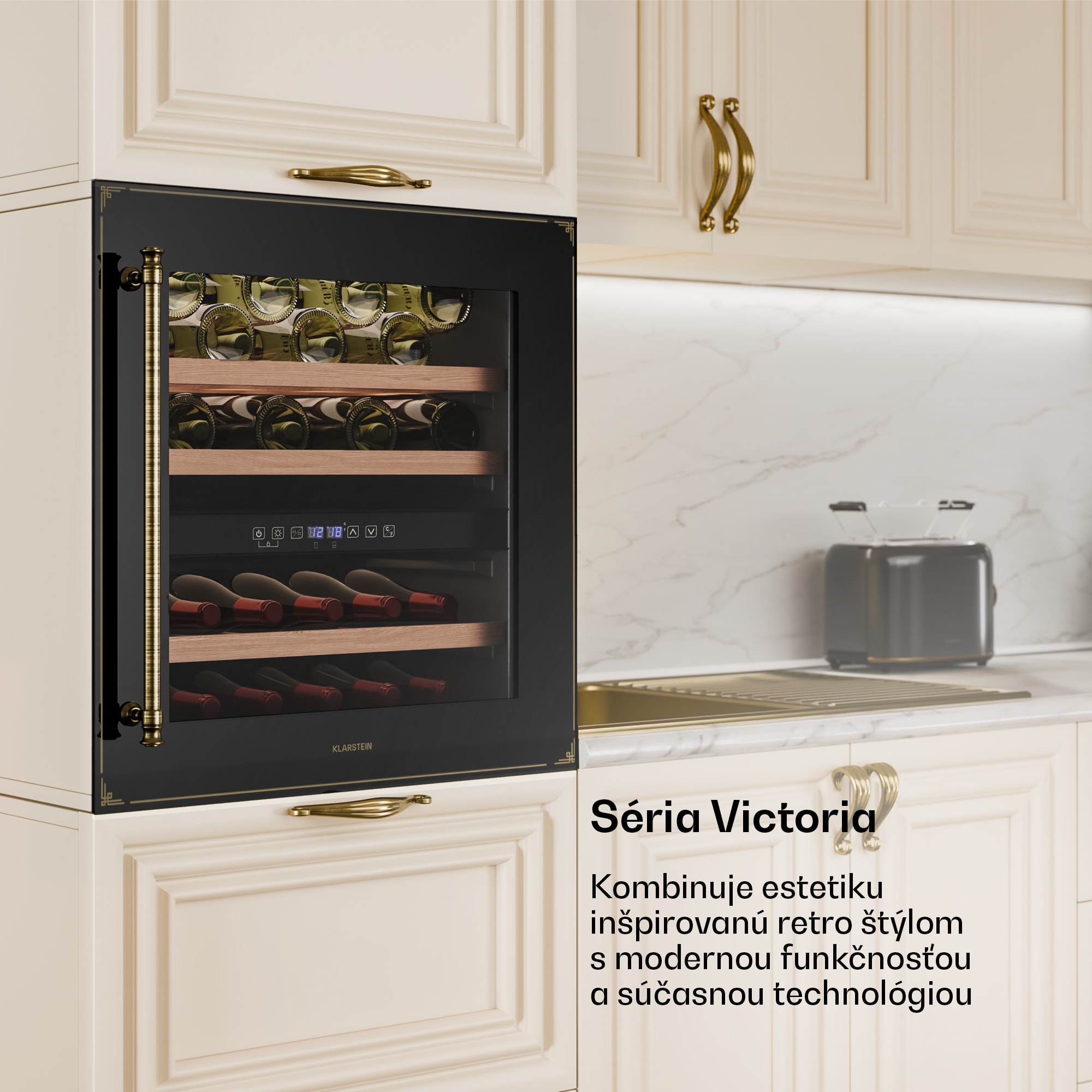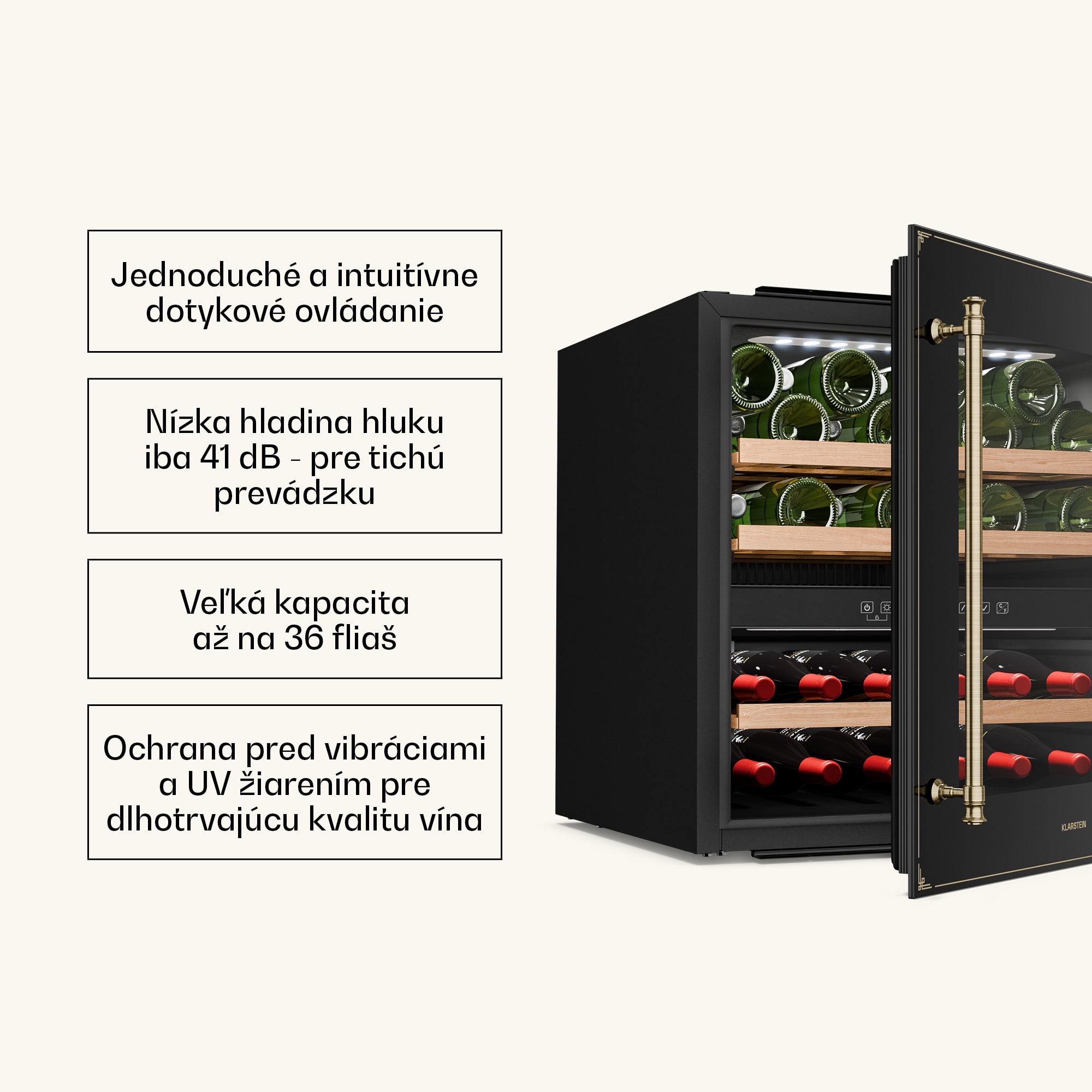 Vinotéka Klarstein Vinsider Victoria 36 kombinuje vintage dizajn s optimálnou funkčnosťou na dokonalé uskladnenie a prezentáciu vašich vín.S kapacitou až 36 fliaš ponúka chladnička na víno Klarstein Vinsider Victoria 36 dostatok priestoru pre vaše najcennejšie vína. Vysokokvalitné spracovanie s odnímateľnými drevenými policami v dvoch chladiacich zónach zaručuje nielen štýlovú prezentáciu, ale aj skladovanie bez vibrácií a s ochranou proti UV žiareniu, ktorá dlhodobo zachováva kvalitu vína. Intuitívne dotykové ovládanie umožňuje jednoduchú reguláciu teploty v rozsahu od 5 do 22 stupňov Celzia, takže vaše vína budú mať vždy ideálnu teplotu na pitie. Vďaka tichej prevádzke s hlučnosťou len 41 dB a elegantnému vnútornému LED osvetleniu chladnička na víno dokonale zapadne do každej kuchyne a vytvorí príjemnú atmosféru. Chladničku na víno je potrebné pravidelne čistiť a podľa potreby upravovať teplotu, aby sa zabezpečilo optimálne skladovanie vašich vín. Táto vstavaná vinotéka je ideálnym riešením pre každého milovníka vína.Vyskúšajte rozdiel a kúpte si chladničku na víno Klarstein Vinsider Victoria 36 pre dokonalé uskladnenie vína.