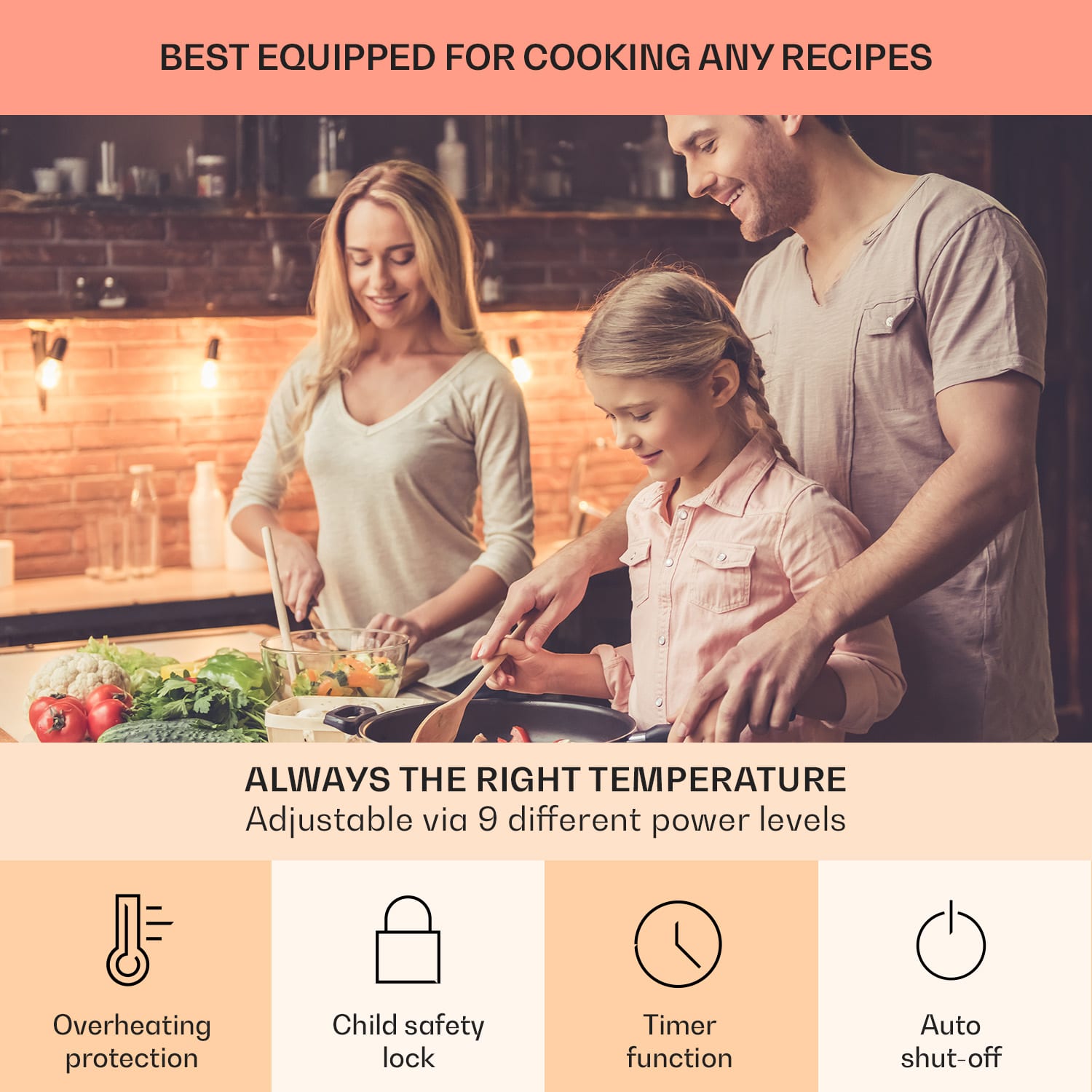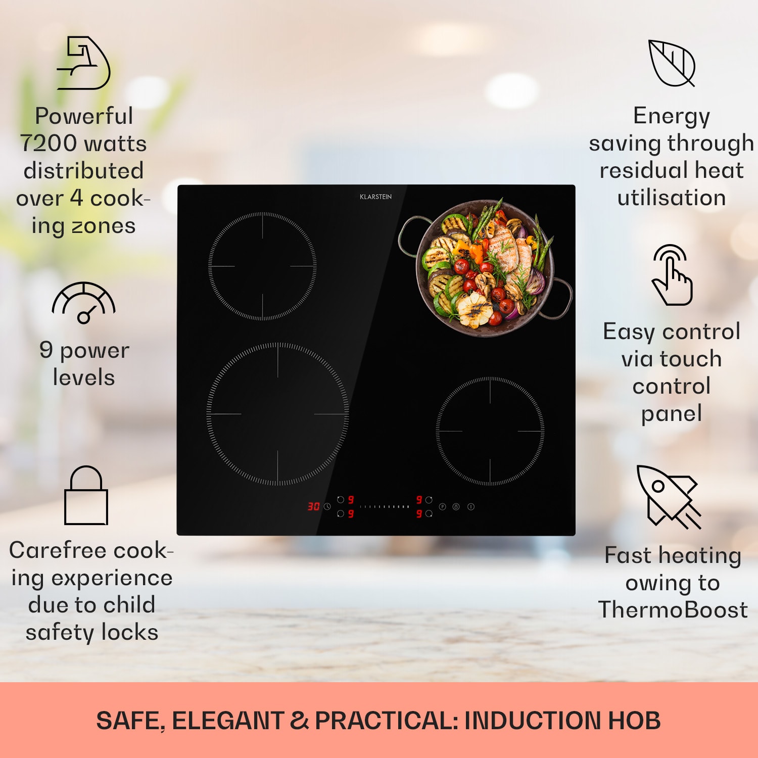 Staň sa šéfkuchárom pri vlastnom sporáku. Indukčná varná doska Klarstein Virtuosa EcoAdapt ti ponúka všetko, čo potrebuješ vo svojej kuchyni, aby si vykúzlil úžasné kulinárske špeciality. Jednoduché ovládanie pomocou dotykového displeja, 9 úrovní výkonu a funkcia zosilnenia boost ťa optimálne podporujú pri príprave obľúbených jedál. Vďaka funkcii EcoAdapt je možné nastaviť celkový výkon zabudovanej indukčnej varnej dosky na 2800, 3500, 6000 alebo 7200 W. Bez ohľadu na veľkosť hrnca si so štyrmi rôznymi priemermi varných zón s hodnotami 2 x 16, 18 a 21 cm nájde každý hrniec správne miesto. Ak potrebuješ trochu väčší výkon, k dispozícii je boost funkcia zosilnenia. Krátkodobo zvyšuje výkon pre vybranú varnú zónu a rýchlejšie tak uvarí tvoje pokrmy. Indukčná varná doska je sebestačná a dá sa zabudovať nezávisle od rúry na pečenie.Všetky plochy sa dajú regulovať samostatne v 9 úrovniach. Indukčná varná doska Klarstein Virtuosa EcoAdapt sa ovláda nekomplikovane pomocou integrovaného dotykového poľa so senzorom a s digitálnym displejom. Povrch kuchynskej linky tak nerušia žiadne ďalšie ovládacie prvky ani tlačidlá. Okrem toho je možné pre každú varnú plochu naprogramovať časovač, ktorý sa vypne buď po uplynutí nastaveného času, alebo spustí zvukový signál.Vstavaná indukčná varná doska Klarstein Virtuosa má rôzne poistky, aby pri varení všetko prebiehalo hladko. Automatické vypnutie sa aktivuje po 120 minútach. Indikátor zvyškového tepla ťa informuje, či sú vypnuté varné plochy ešte stále horúce. Môžeš tiež aktivovať detskú poistku, aby sa zabránilo náhodným zmenám nastavení varenia.Indukčná varná doska Klarstein Virtuosa zaujme svojím čiernym, ľahko udržiavateľným sklokeramickým povrchom bez okrajov. Do tvojej kuchyne prinesie elegantný štýl. Týmto spôsobom sa varná doska hravo začlení do každej kuchynskej linky – či už klasickej, alebo modernej.