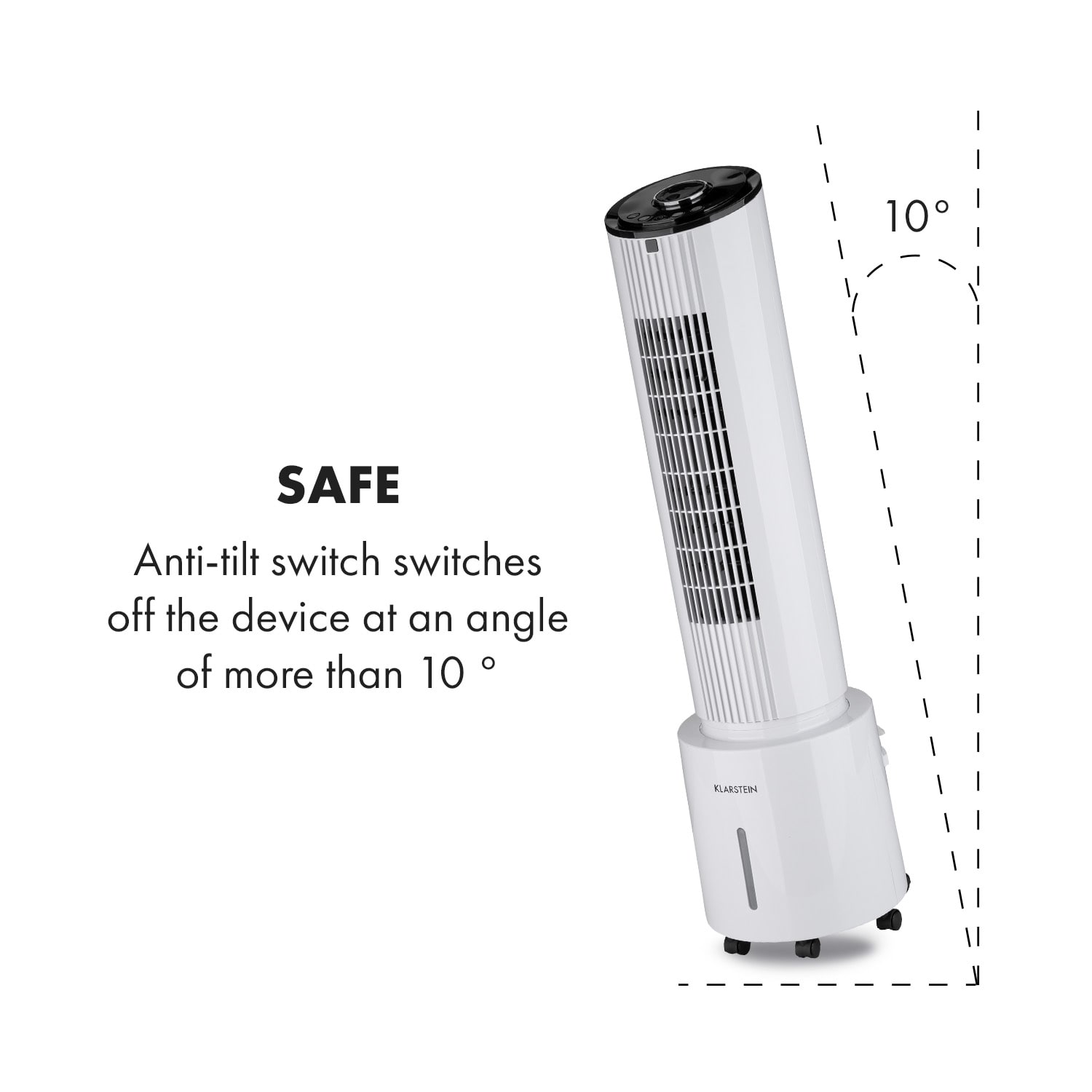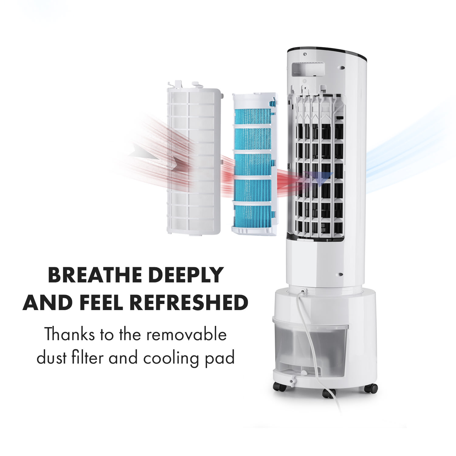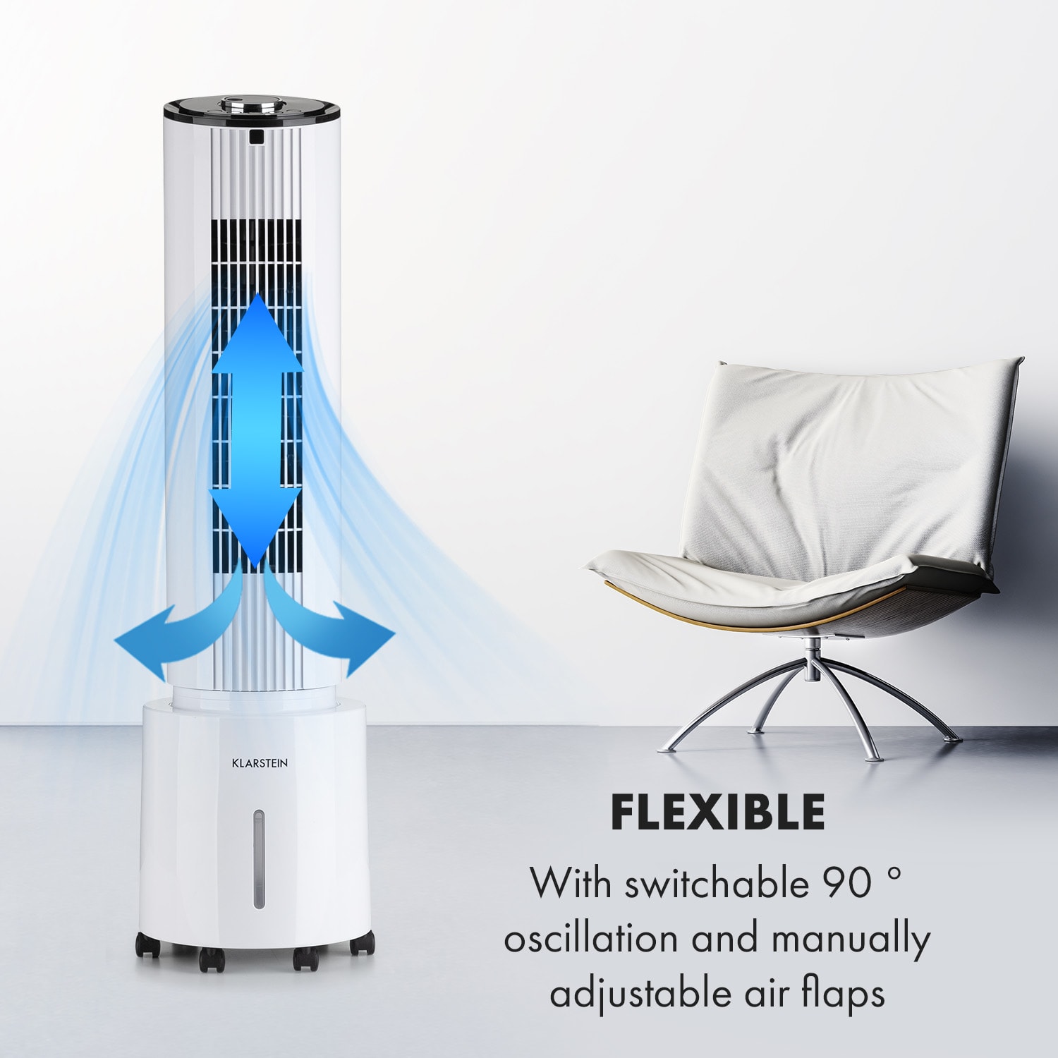 Štvornásobne osviežujúci, štýlový vežový ventilátor. Ochladzovač vzduchu 4 v 1 Klarstein Waterfall ti poskytne svieži vzduch ako ventilátor, ochladzovač vzduchu, čistič vzduchu a zvlhčovač vzduchu.Vďaka vysokému prietoku vzduchu 400 m³/h rozhýbe zariadenie Klarstein Waterfall ako ventilátor letný vzduch a vytvára príjemný vánok v troch rýchlostiach. Okrem toho si môžeš zvoliť prírodný režim, režim spánku alebo normálny režim V kombinácii s funkciou ochladzovača vzduchu je prúd vzduchu navyše príjemne vychladený a poskytuje osvieženie. Voda sa vtedy odparuje z 4-litrovej nádrže cez podložku na zvlhčovanie vzduchu. Tým odvádza teplo z prúdiaceho vzduchu prirodzeným a mimoriadne energeticky úsporným spôsobom – prúd vzduchu sa stáva príjemne chladným vánkom a precízne osviežuje, či už pri stole, na gauči alebo v posteli. V prípade potreby znižujú teplotu pre ešte väčšie ochladenie dva chladiace akumulátory do vodnej nádrže.Vďaka tomu je zariadenie Klarstein Waterfall vítaným pomocníkom nielen v lete: ako zvlhčovač vzduchu skoncuje v zime so suchým vzduchom pri vykurovaní. Ak sa má osviežiť viac ako jedna osoba, môžeš aktivovať 90° osciláciu zariadenia. Pre väčšiu flexibilitu môžeš dodatočne horizontálne nastavovať vzduchové klapky. Integrovaný ionizátor, ktorý zo vzduchu efektívne odstraňuje prachové častice a pachy, sa postará o lepšie dýchanie. Vďaka podlahovým kolieskam je možné ochladzovač vzduchu Klarstein Waterfall vziať kamkoľvek so sebou a je okamžite pripravený na použitie. Ovláda sa pomocou ovládacieho panela a otočného gombíka na hornej strane zariadenia alebo veľmi pohodlne pomocou diaľkového ovládača. Bezpečnostný spínač pri prevrátení zaisťuje potrebnú bezpečnosť a automaticky vypne zariadenie v uhle sklonu nad 10°.Výkonný a všestranný: ochladzovač vzduchu Klarstein Waterfall je osviežujúcou odpoveďou na všetky horúce dni v roku.