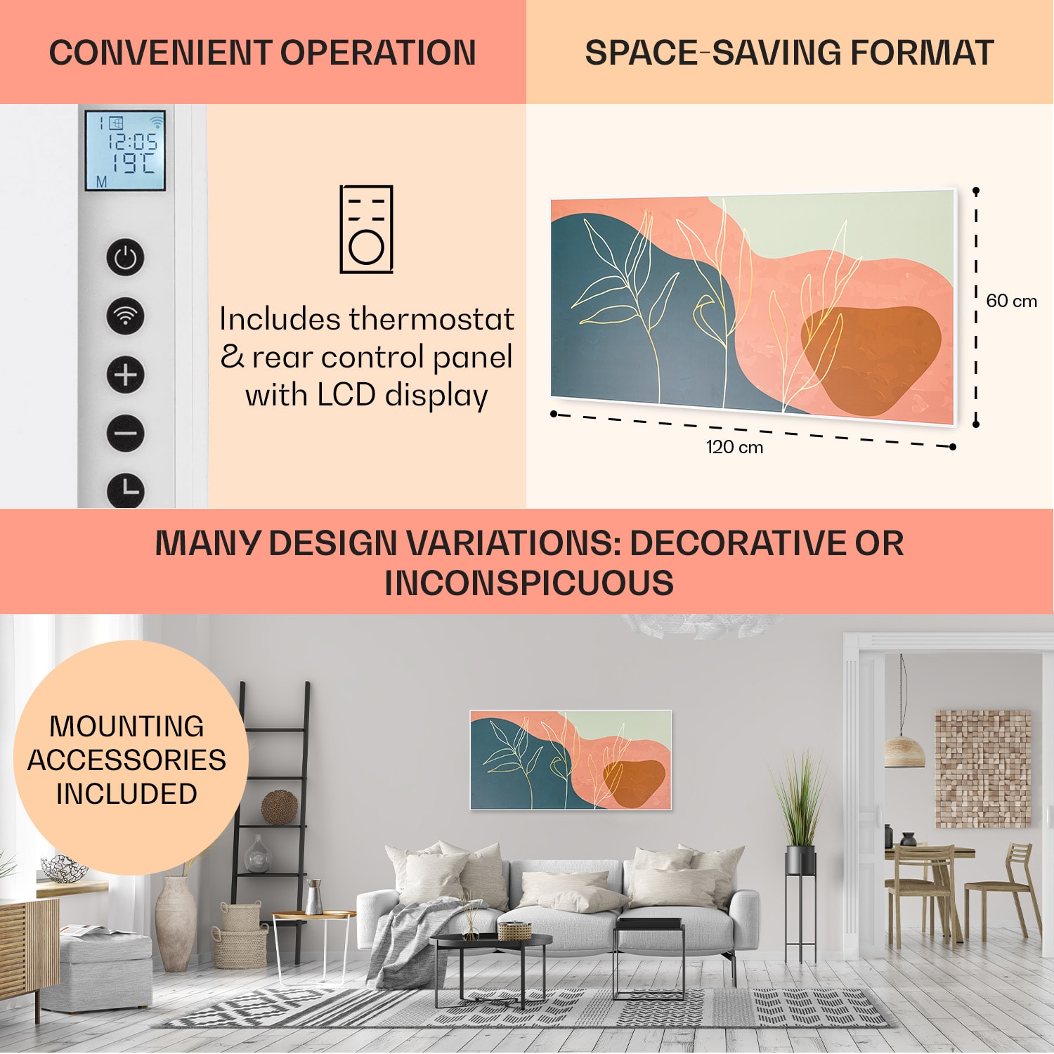 Inteligentná technológia pre príjemné teplo: Infračervený ohrievač Wonderwall Air Art Smart od Klarstein vás veľmi účinne zohreje príjemným infračerveným teplom a stane sa dekoratívnym svetlým bodom v každej miestnosti. Infračervený ohrievač Wonderwall Air Art Smart od Klarstein predstavuje revolúciu vo vykurovaní pomocou modernej technológie. Vykurovací panel je úplne plochý a môžete ho zavesiť na stenu ako Infrapanel obraz. Pomocou technológie IR ComfortHeat a výkonom 700 wattov pritom využíva princíp slnečného ohrievania: namiesto toho, aby pomaly ohrieval vzduch, vydáva príjemné infračervené teplo, ktoré priamo ohrieva osoby a objekty v oblasti približne 14 m². Váš nový elektrický ohrievač je zároveň mimoriadne energeticky účinný: celých 98 % absorbovanej energie sa nemení na tepelné žiarenie. Termostat, funkcia automatického vypnutia, týždenný časovač, tichá prevádzka a inteligentné ovládanie cez aplikáciu WiFi sofistikovane dopĺňajú inovatívnu možnosť vykurovania. Budúcnosť vykurovacej technológie: dekoratívny a efektívny infračervený elektrický ohrievač Wondewall Air Art Smart od Klarstein.
