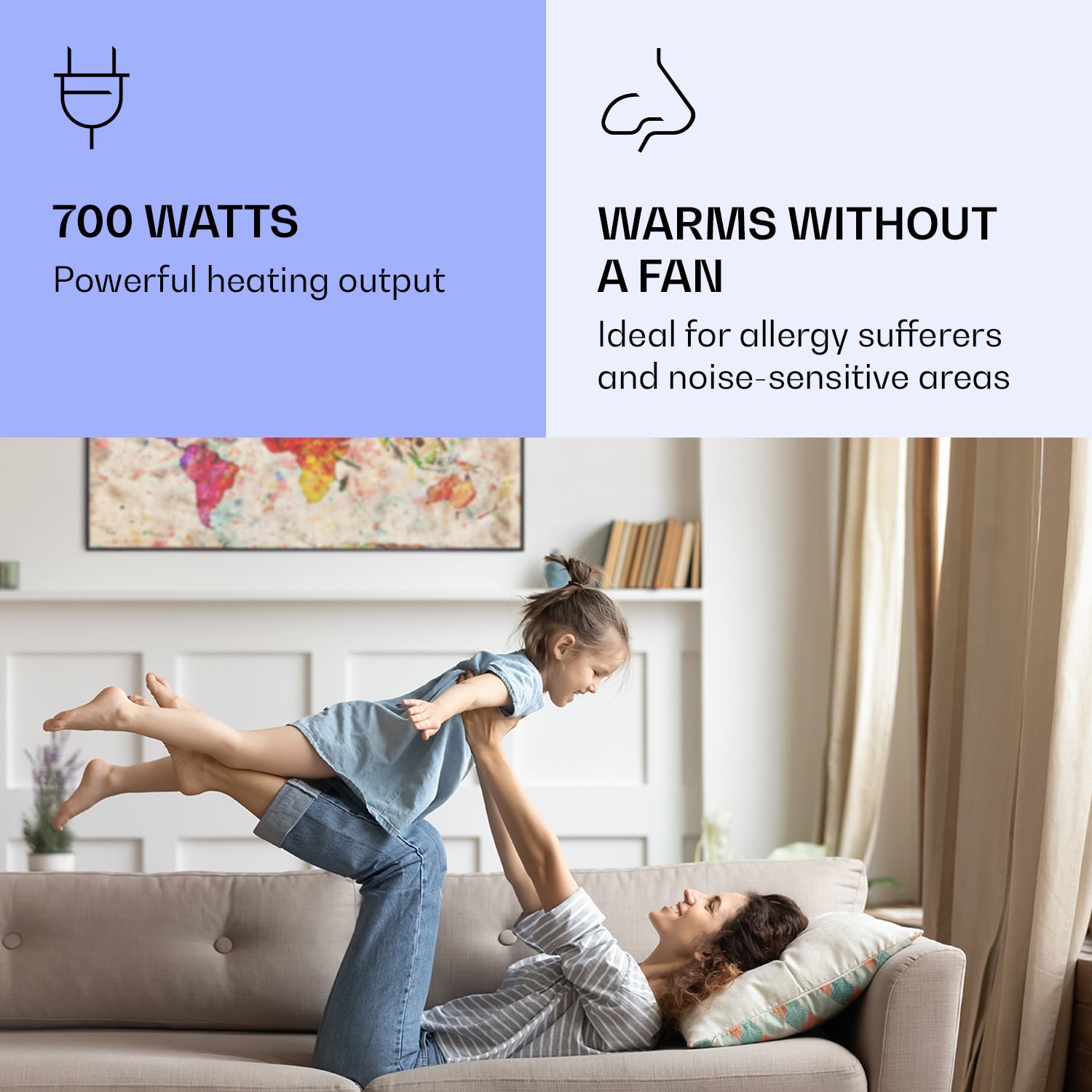 Infračervený ohrievačKlarstein Air Art Smart kombinuje vysoko efektívny vykurovací výkon s pôsobivým dizajnom a najnovšou technológiou. Prináša príjemné teplo a tiež nový lesk a farbu do každej miestnosti a pritom je energeticky veľmi efektívny a ekologický vďaka svojej infračervenej technológii. So svojím silným výkonom 700 W a vďaka technológii IR ComfortHeat šíri k ľudskej pokožke veľmi príjemné teplo, ktoré je vyžarované cielene na osoby v blízkosti ohrievača. Ovládaj veľmi jednoducho pomocou smartfónu, diaľkového ovládača alebo ovládacieho panela jeden ohrievač alebo viacero ohrievacích zariadení. Tento Infrapanel obraz sa dokonale hodí do každého interiéru. Vitaj v budúcnosti vykurovacej techniky: infračervený ohrievačKlarstein Air Art Smart.