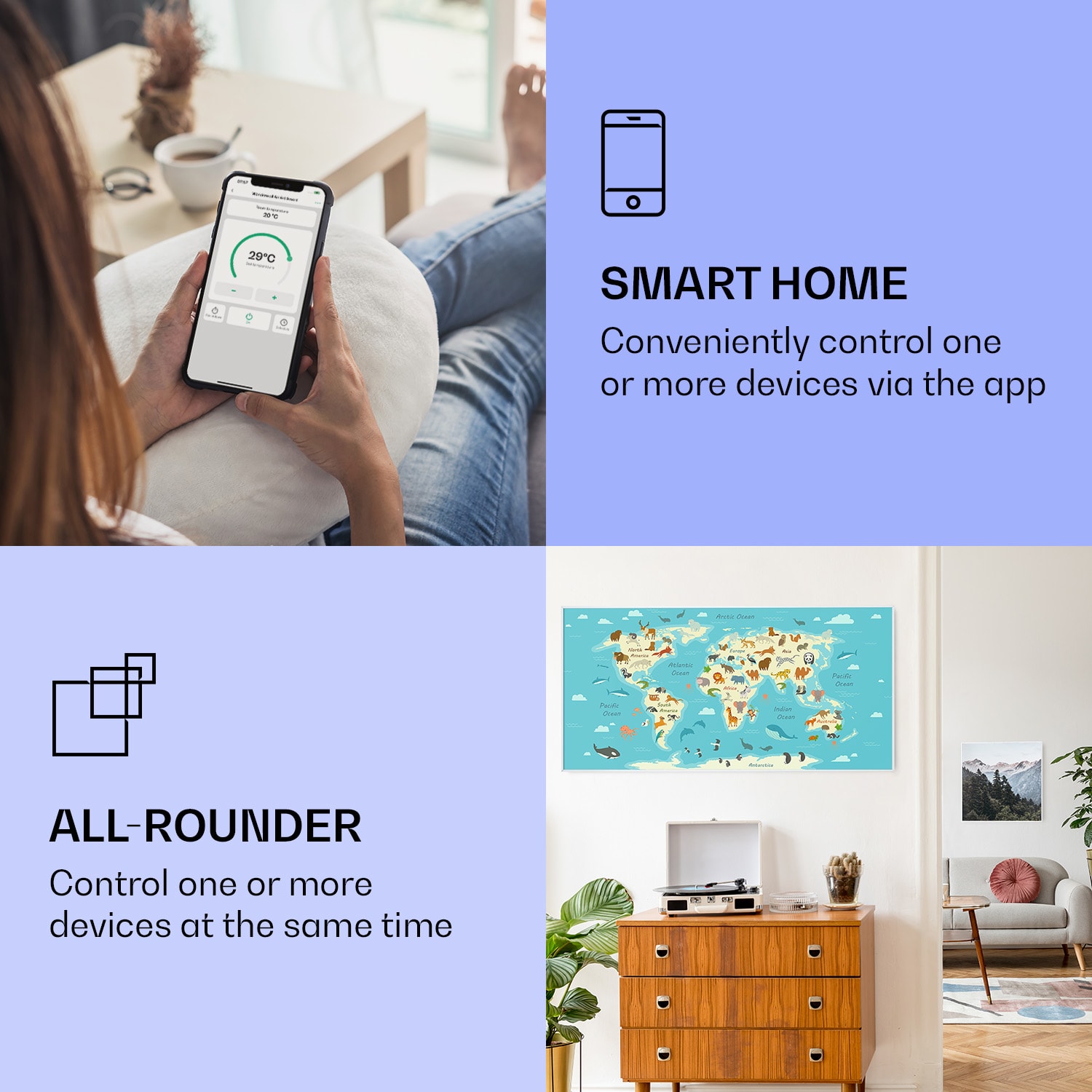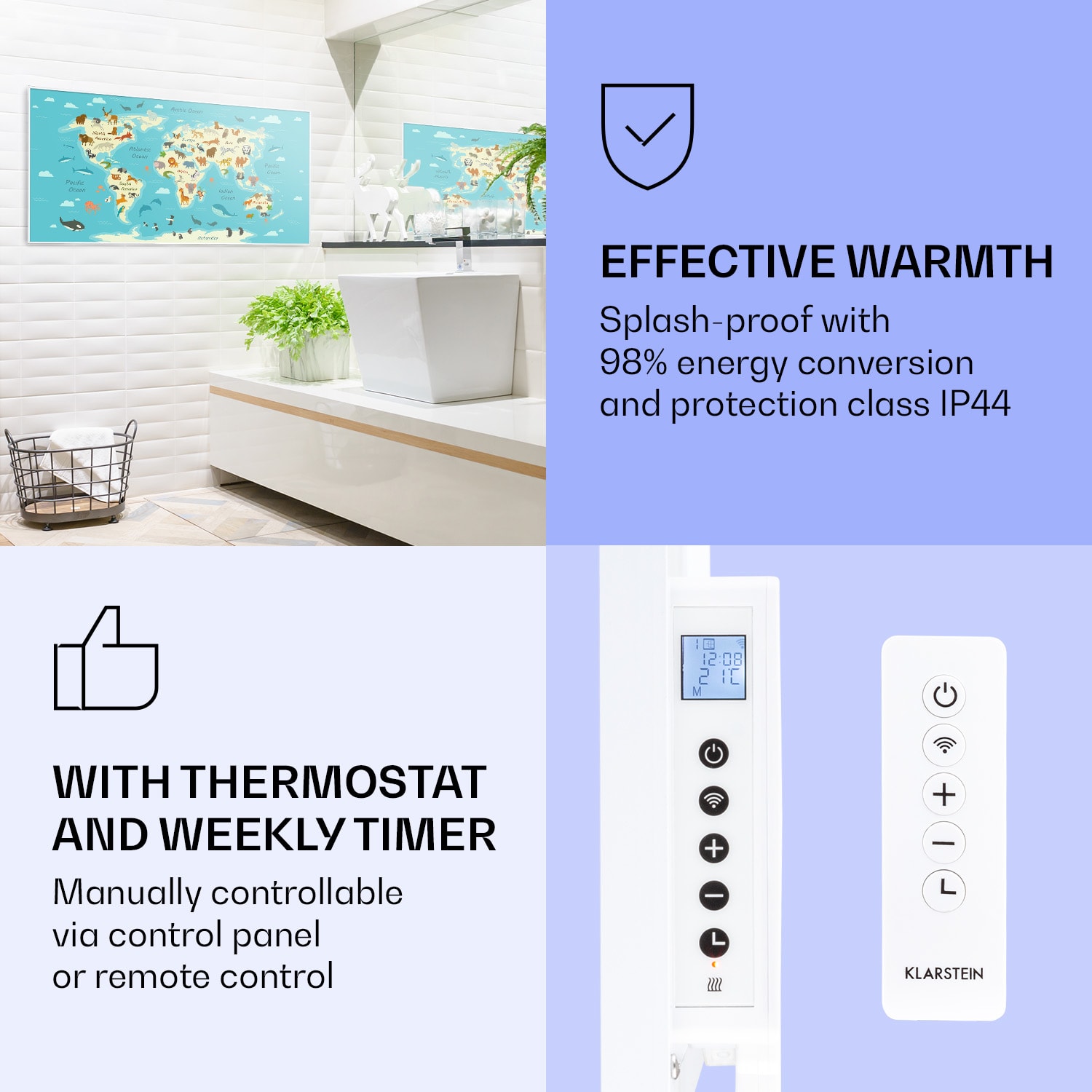 Infračervený ohrievačKlarstein Air Art Smart kombinuje vysoko efektívny vykurovací výkon s pôsobivým dizajnom a najnovšou technológiou. Prináša príjemné teplo a tiež nový lesk a farbu do každej miestnosti a pritom je energeticky veľmi efektívny a ekologický vďaka svojej infračervenej technológii. So svojím silným výkonom 700 W a vďaka technológii IR ComfortHeat šíri k ľudskej pokožke veľmi príjemné teplo, ktoré je vyžarované cielene na osoby v blízkosti ohrievača. Ovládaj veľmi jednoducho pomocou smartfónu, diaľkového ovládača alebo ovládacieho panela jeden ohrievač alebo viacero ohrievacích zariadení. Tento infrapanel obraz sa dokonale hodí do každého interiéru. Vitaj v budúcnosti vykurovacej techniky: infračervený ohrievačKlarstein Air Art Smart.