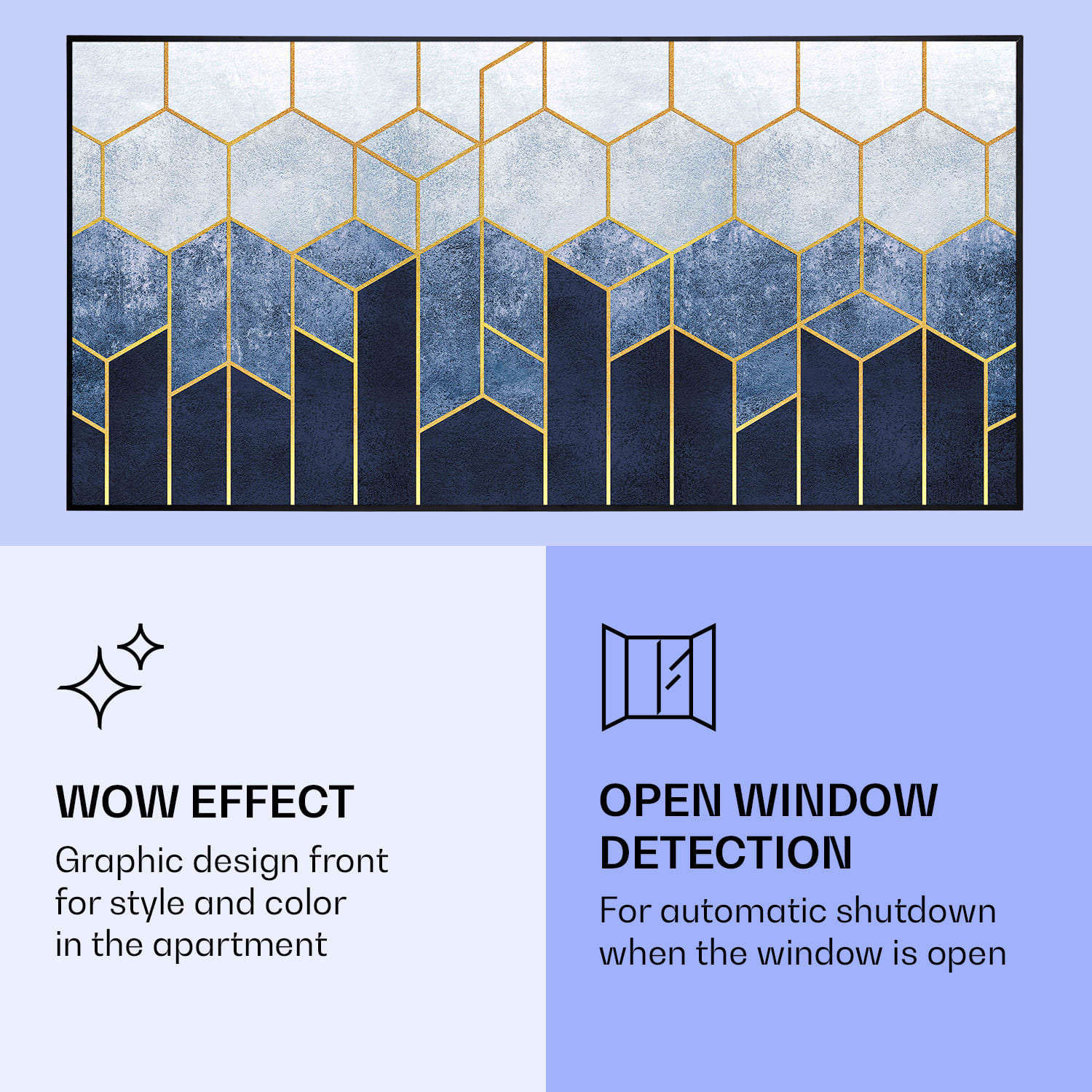 Infračervený ohrievačKlarstein Air Art Smart kombinuje vysoko efektívny vykurovací výkon s pôsobivým dizajnom a najnovšou technológiou. Prináša príjemné teplo a tiež nový lesk a farbu do každej miestnosti a pritom je energeticky veľmi efektívny a ekologický vďaka svojej infračervenej technológii. So svojím silným výkonom 700 W a vďaka technológii IR ComfortHeat šíri k ľudskej pokožke veľmi príjemné teplo, ktoré je vyžarované cielene na osoby v blízkosti ohrievača. Ovládaj veľmi jednoducho pomocou smartfónu, diaľkového ovládača alebo ovládacieho panela jeden ohrievač alebo viacero ohrievacích zariadení. Tento Infrapanel obraz sa dokonale hodí do každého interiéru. Vitaj v budúcnosti vykurovacej techniky: infračervený ohrievačKlarstein Air Art Smart.