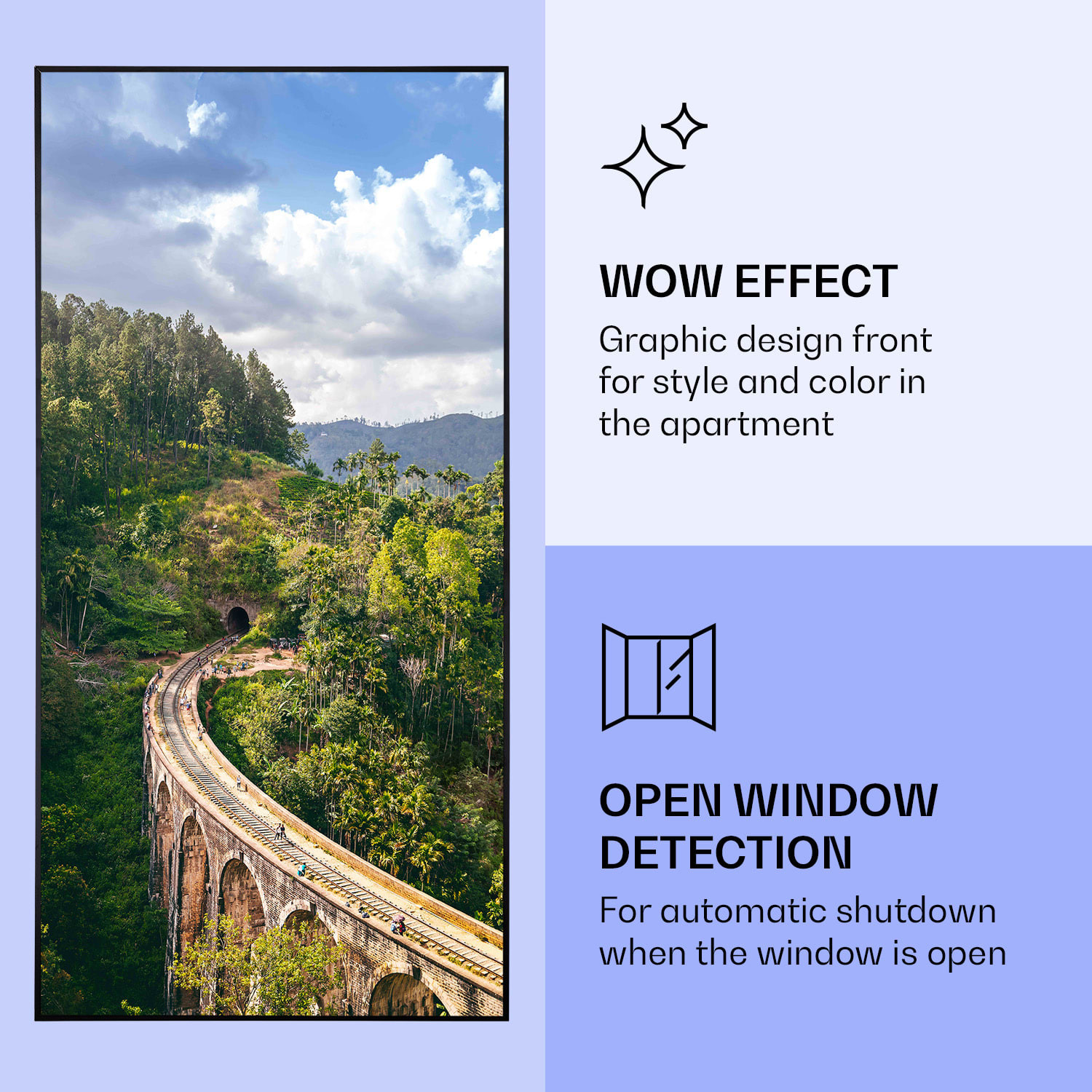 Infračervený ohrievačKlarstein Air Art Smart kombinuje vysoko efektívny vykurovací výkon s pôsobivým dizajnom a najnovšou technológiou. Prináša príjemné teplo a tiež nový lesk a farbu do každej miestnosti a pritom je energeticky veľmi efektívny a ekologický vďaka svojej infračervenej technológii. So svojím silným výkonom 700 W a vďaka technológii IR ComfortHeat šíri k ľudskej pokožke veľmi príjemné teplo, ktoré je vyžarované cielene na osoby v blízkosti ohrievača. Ovládaj veľmi jednoducho pomocou smartfónu, diaľkového ovládača alebo ovládacieho panela jeden ohrievač alebo viacero ohrievacích zariadení. Tento Infrapanel obraz sa dokonale hodí do každého interiéru. Vitaj v budúcnosti vykurovacej techniky: infračervený ohrievačKlarstein Air Art Smart.