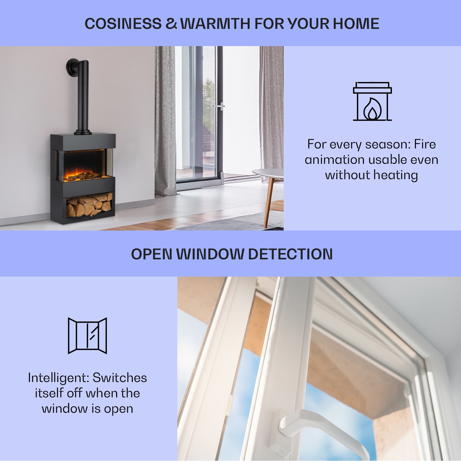 Nechaj sa očariť: elektrický krb Klarstein Zermatt prináša realistickú a ľahko viditeľnú ilúziu plameňa v každej izbe vďaka svojim trom priehľadným oknám. Jemné svetlo klamlivo napodobňuje skutočné plamene aj tlejúce polená a okamžite vytvára útulnú, romantickú atmosféru.Podľa potreby je možné zapnúť ohrievač, ktorý okamžite šíri teplo s výkonom 900 alebo 1800 W. Zabudovaný termostat sa dá pohodlne nastaviť pomocou otočného ovládača a umožňuje spoľahlivú a vyváženú reguláciu teploty. Integrovaná ochrana proti prehriatiu sa postará v núdzovom prípade o automatické vypnutie krbu. Elektrický krb sa ovláda buď priamo na zariadení, alebo pohodlne pomocou diaľkového ovládača. V ráme krbu je magnetický držiak pre jeho inteligentné umiestnenie. Je teda nielen bezpečne uložený, ale tiež vždy pripravený na použitie.Elektrický krb Klarstein Zermatt zaujme štúdiovým dizajnom vďaka svojej jednoduchosti a elegancii bez zbytočných ozdôb. Špeciálne zaujímavými prvkami sú okrem 3-dielneho panoramatického okna aj dekoratívny úložný priestor na guľatinu v spodnej časti krbu a tiež pripevniteľná dymová rúra, ktorá podčiarkuje realistický vzhľad ilúzie plameňa. Celé to ukončuje 6-stupňový stmievač pre novú, 3-rozmernú LED ilúziu plameňa a sada dekoratívnych drevených polien na vytvorenie vlastného krbu.Nezáleží, či je vybavenie rustikálne alebo moderné: elektrický krb Zermatt od spoločnosti Klarstein všade vykúzli romantickú atmosféru a poskytuje bez plameňov a dymu dojem sedenia pred praskajúcim ohníkom. Elektrický krb je ideálnym doplnkom pre každú domácnosť.Upozornenie: Tento produkt je určený len do dobre izolovaných miestností alebo na príležitostné použitie.