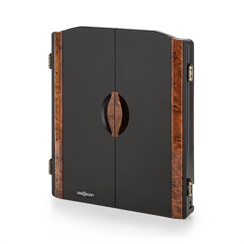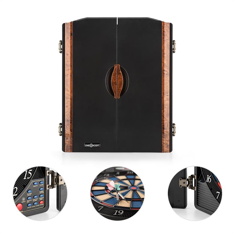 oneConcept prináša s automatom na šípky Masterdarter zábavu so šípkami pre domácnosti, či už pre začiatočníkov, alebo profesionálov. Kto chce podľa chuti a nálady preukázať svoje umenie alebo trénovať, má teraz príležitosť. Vďaka integrovanému hernému počítaču si nikto nemusí lámať hlavu s výpočtom bodov, zariadenie Masterdarter to vybaví samo.Celkovo je na výber 38 najpopulárnejších hier ako Count down 301, Cricket alebo Shanghai, ktoré možno prispôsobiť podľa vlastných preferencií rôznymi hernými režimami ako Double alebo Bounce Out. Súťažiť môže súčasne do 16 hráčov v tímoch alebo každý proti každému. A ak nie sú k dispozícii žiadni ďalší hráči, automat na šípky má pripraveného virtuálneho súpera v 5 úrovniach obťažnosti. Zariadenie Masterdarter je ovládané 9 tlačidlami pod terčom. LED indikátory nad terčom ukazujú jasne viditeľne nielen skóre hráčov, ale aj všetky udalosti v hre. Pre okamžité hranie obsahuje automat na šípky 12 šípok s 3 x 4 farebnými letkami a 24 náhradnými hrotmi. Aby sa pri hádzaní nepoškodili steny a bytové vybavenie, všetky šípky majú mäkké hroty z plastu, ktoré dokonale pasujú do otvorov terča.Aj navonok sa skriňa s terčom oneConcept Dartmaster prejavuje maximálne profesionálne: Dve elegantné dvierka s držiakmi šípok na vnútornej strane šikovne priťahujú pohľady. V prípade, že terč nie je používaný, ho chránia pred prachom a špinou.Dostupné varianty: drevený vzhľad, kovový vzhľad (produkt 10030659)