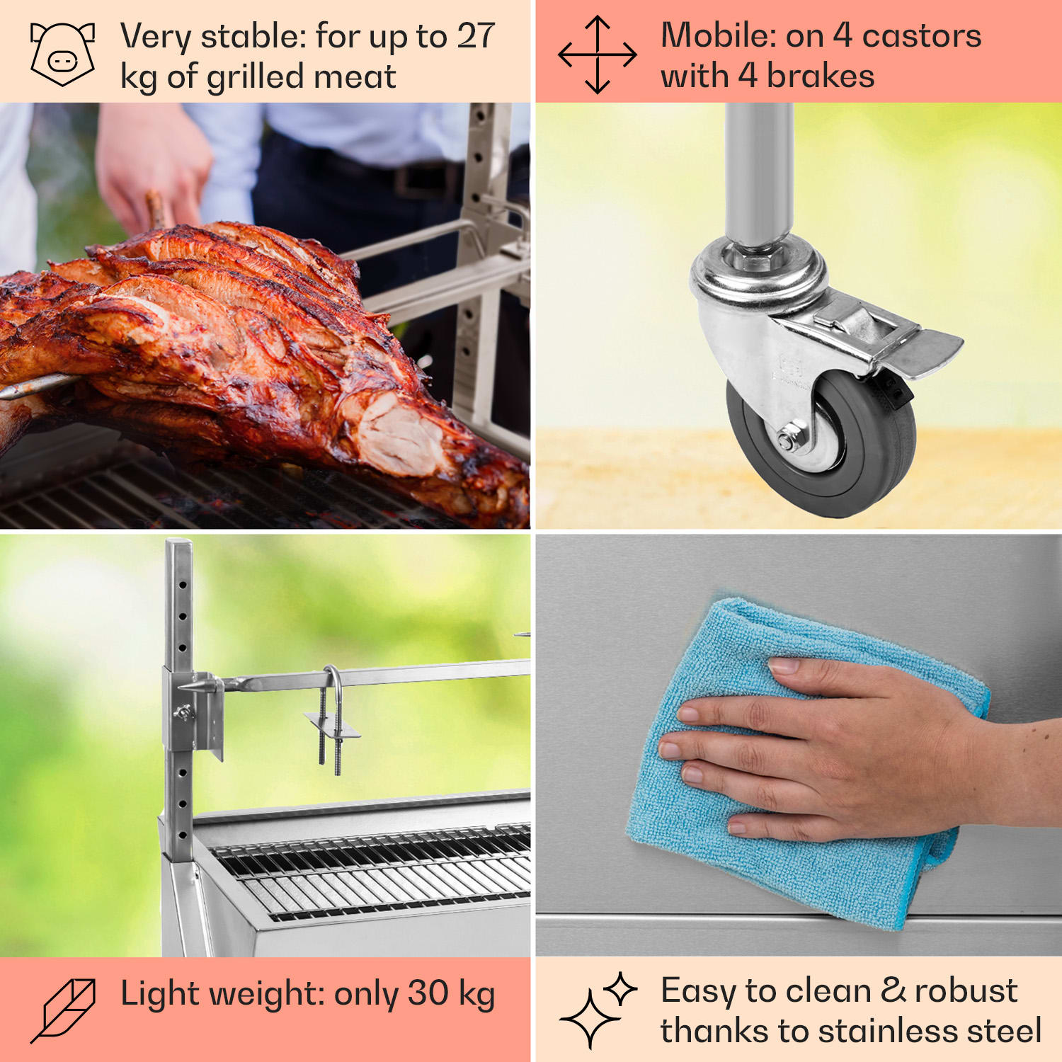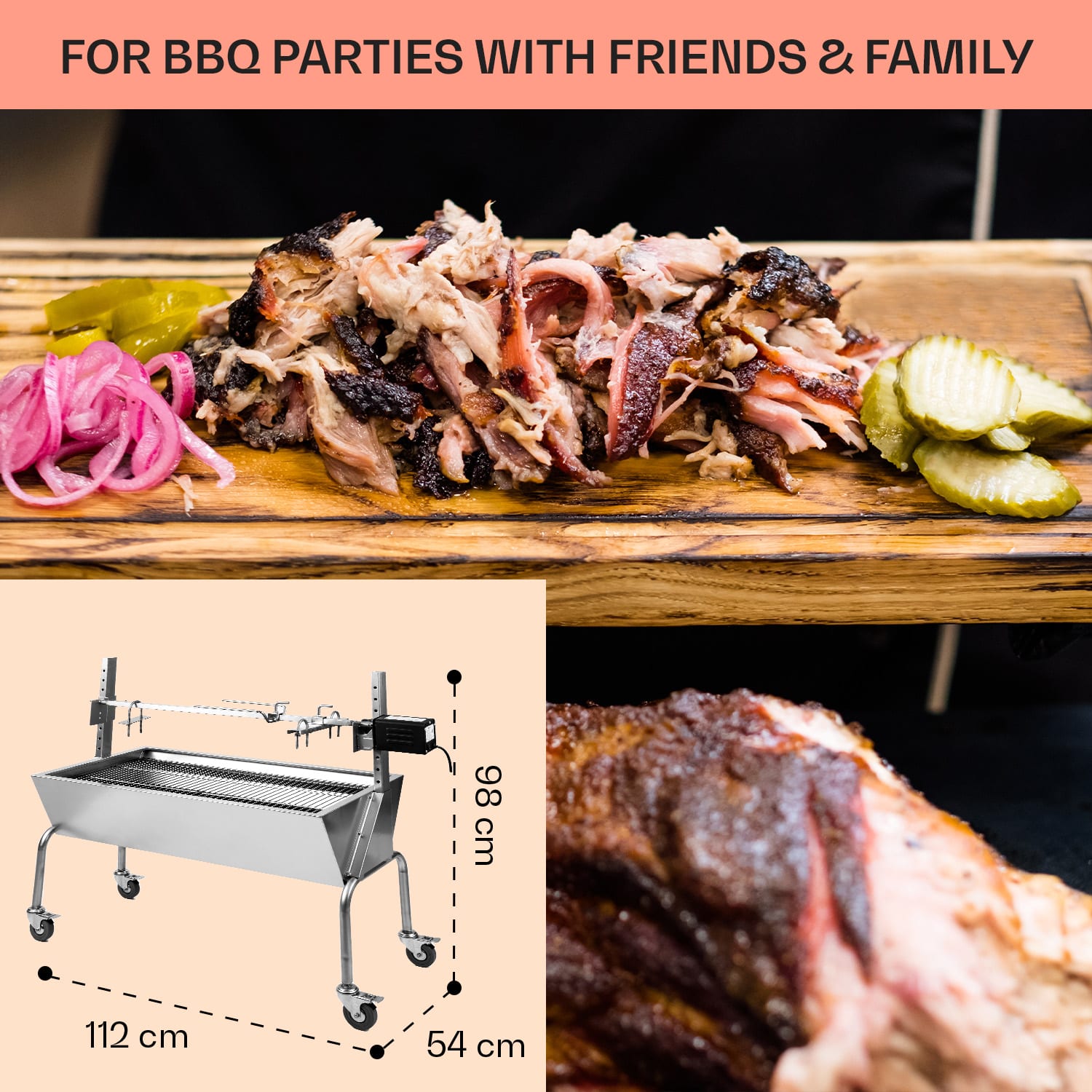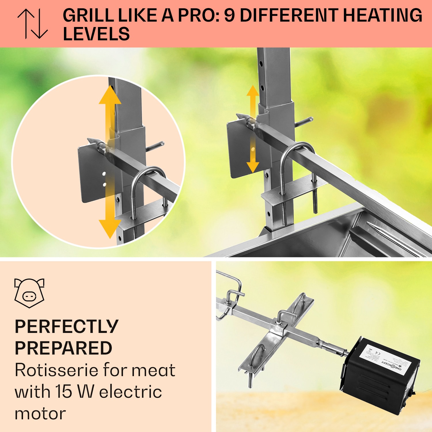 Zariadenie Sauenland od spoločnosti oneConcept je záhradný gril na prasiatko, ktorý plní sny rustikálnych labužníkov. Masívna oceľová konštrukcia určuje vonkajší vzhľad zariadenia. Vďaka štyrom kolieskam s integrovanými brzdami možno veľký gril na prasiatko prenášať z bodu A do bodu B napriek jeho hmotnosti 30 kg a vysokej stabilite: napríklad z garáže na záhradu alebo z kôlne na terasu. Najviac iste na grile upúta dobre dimenzovaný grilovací špíz z nerezovej ocele: Lahodné pečené mäso možno napichnúť rovnako ako kurča alebo iné grilované jedlá. Svorky, ktoré sú súčasťou dodávky, umožňujú spoľahlivé upevnenie obzvlášť veľkých kusov ako celé jahňatá a ošípané. Špíz z nerezovej ocele grilu je poháňaný dodávaným motorom: Vďaka stabilnej rotácii poskytuje rovnomerný proces varenia a dokonale šťavnatý pôžitok z mäsa. Grilovacia vaňa pojme dostatok uhlia pre dodávku potrebného tepla po dlhú dobu. Vďaka dvom grilovacím roštom je tiež k dispozícii veľká grilovacia plocha, ktorá robí zo zariadenia od spoločnosti oneConcept aj perfektného partnera pre tradičné grilovanie. Či už sa jedná o rodinnú oslavu, párty alebo výročie: So zariadením Sauenland sa Vám podaria chutné pečené prasiatka a iné dobroty vo veľkom štýle! Vezmite, prosím, na vedomie, že zariadenie je dodávané ako montážna sada (čas montáže: cca 25 minút). Montážny materiál je súčasťou dodávky.