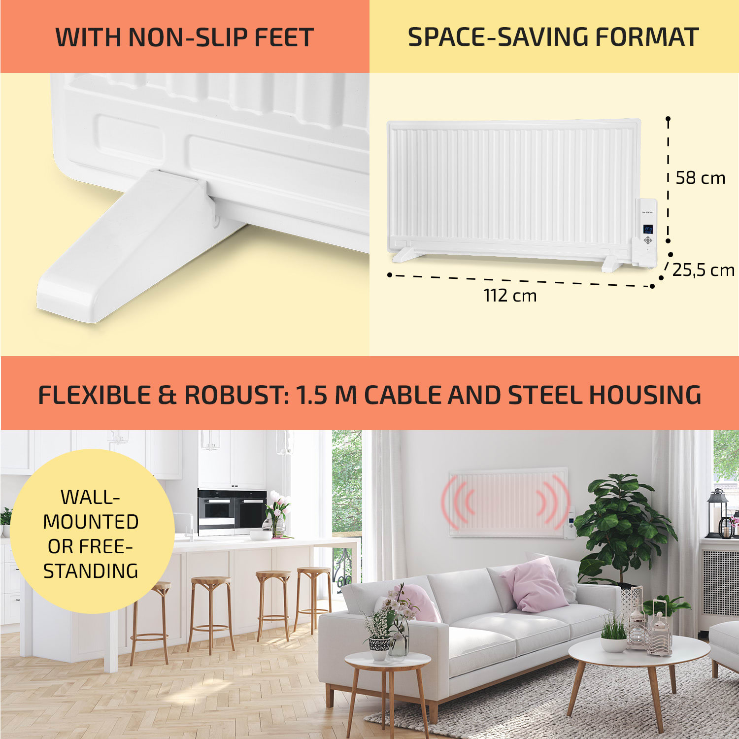 Pohodlné teplo pre Váš domov: či už ako nástenné zariadenie, alebo ako mobilný spoločník, olejový radiátor oneConcept Wallander premení Váš byt na príjemnú oázu pohody. Pri vykurovacom výkone 1000 W sa olejový radiátor oneConcept Wallander veľmi rýchlo zohrieva a vďaka funkcii termostatu poskytuje spoľahlivé a rovnomerné teplo. Ovládanie zariadenia Wallander je veľmi jednoduché: pomocou LED displeja a elektronického ovládania môžete vždy veľmi jednoducho sledovať a nastavovať požadované teploty. Mimoriadne úzky dizajn s extra veľkou vykurovacou plochou sa postará o optimálne rozdelenie tepla. Ochrana proti prehriatiu a poistka proti prevráteniu umožňujú veľmi bezpečnú prevádzku radiátora. Výhody olejových radiátorov vyplývajú z typu vykurovania a dlhého času ohrevu po vypnutí. Olejové radiátory hrejú tým, že sa v nich zohrieva termálny olej. V dôsledku toho sa pri zohrievaní nerozvíri vzduch a predovšetkým žiaden prach. Vďaka tomu je zariadenie obzvlášť vhodné pre alergikov. Zohriaty olej udržiava svoju teplotu veľmi dlhú dobu, takže ohrievač šíri príjemné teplo aj dlhšiu dobu po vypnutí – ideálne do spální. Vďaka funkcii Cleverheat Programming a týždennému časovaču zapínania a vypínania môžete pokojne oddychovať a venovať sa svojim povinnostiam, kým je olejový radiátor stále v prevádzke: V určenom čase sa spoľahlivo sám vypne. Stabilné používanie zabezpečujú dve bezpečné nožičky. Vďaka dodávanej montážnej zostave môže byť vyhrievacie teleso upevnené pohodlne a priestorovo úsporne na stenu. Rýchle dosiahnutie príjemných teplôt v miestnosti alebo kancelárii, v dielni alebo v garáži: olejový radiátor Wallander od spoločnosti oneConcept je výhrou pre každú domácnosť! Vezmite, prosím, na vedomie, že zariadenie je určené len na použitie v dobre izolovaných miestnostiach alebo na príležitostné použitie.