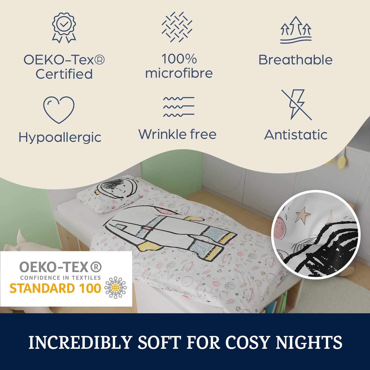 Posteľná bielizeň Soft Wondern Kids-Edition od sleepwise je príjemne mäkká, priedušná, rýchlo schne a je ozdobená detskými motívmi. Deti, urobte si pohodlie! So Soft Wonder Kids-Edition sme vyvinuli najjemnejšiu a najpríjemnejšiu celoročnú posteľnú bielizeň, akú vaša posteľ kedy zažila. Naši odborníci na tkaniny vybrali tie najjemnejšie vlákna na svete, ktoré sú výnimočne príjemné na dotyk: super mikrovlákno je 10× jemnejšie ako hodváb. Z jeho vlákna sa dá upliesť tkanina, ktorej výnimočné vlastnosti prekvapia aj odborníkov na textil: vďaka extrémne vysokej hustote vlákien je tkanina ešte jemnejšia a priedušnejšia ako luxusná egyptská bavlna. Posteľná bielizeň sa zároveň veľmi ľahko udržiava (možno ju prať až na 90 °C) a takmer sa nekrčí. Starostlivé spracovanie švov a zipsov tiež zaručuje dlhú životnosť. Pre všetkých milovníkov ľahkých látok so zamatovým pocitom a motívmi, ktoré vás pozývajú snívať. Nechajte sa presvedčiť posteľnou bielizňou Soft Wonder Kids-Edition od sleepwise so supermikrovláknom, ekologickou certifikáciou a s mimoriadne jednoduchou údržbou.