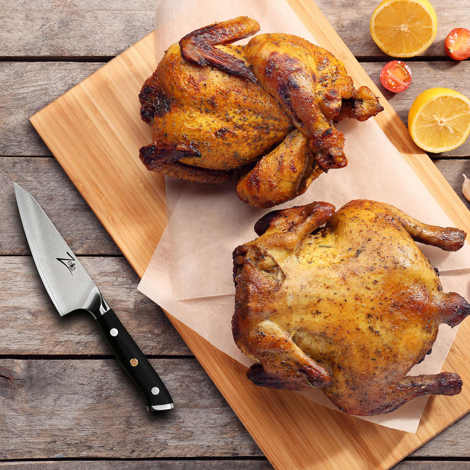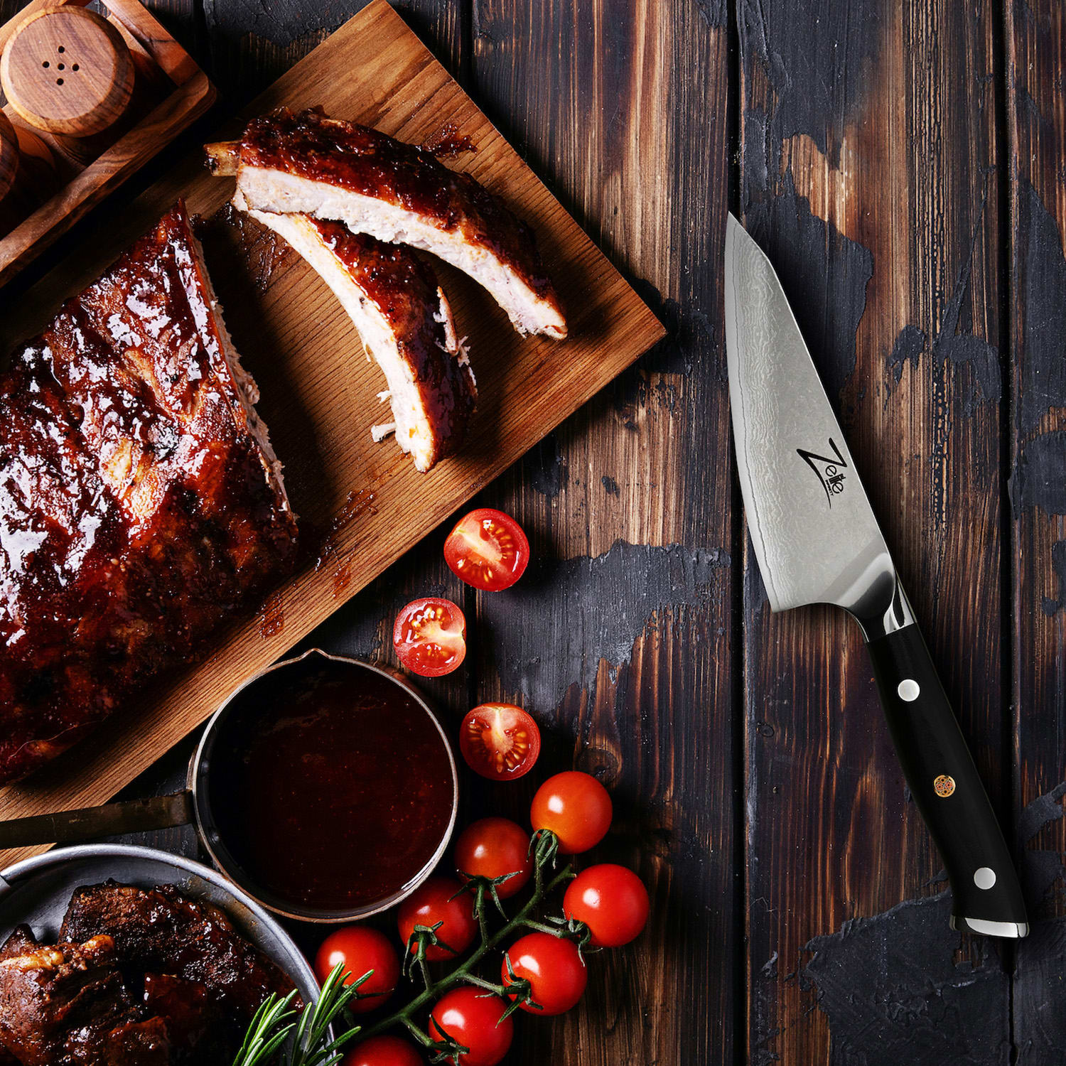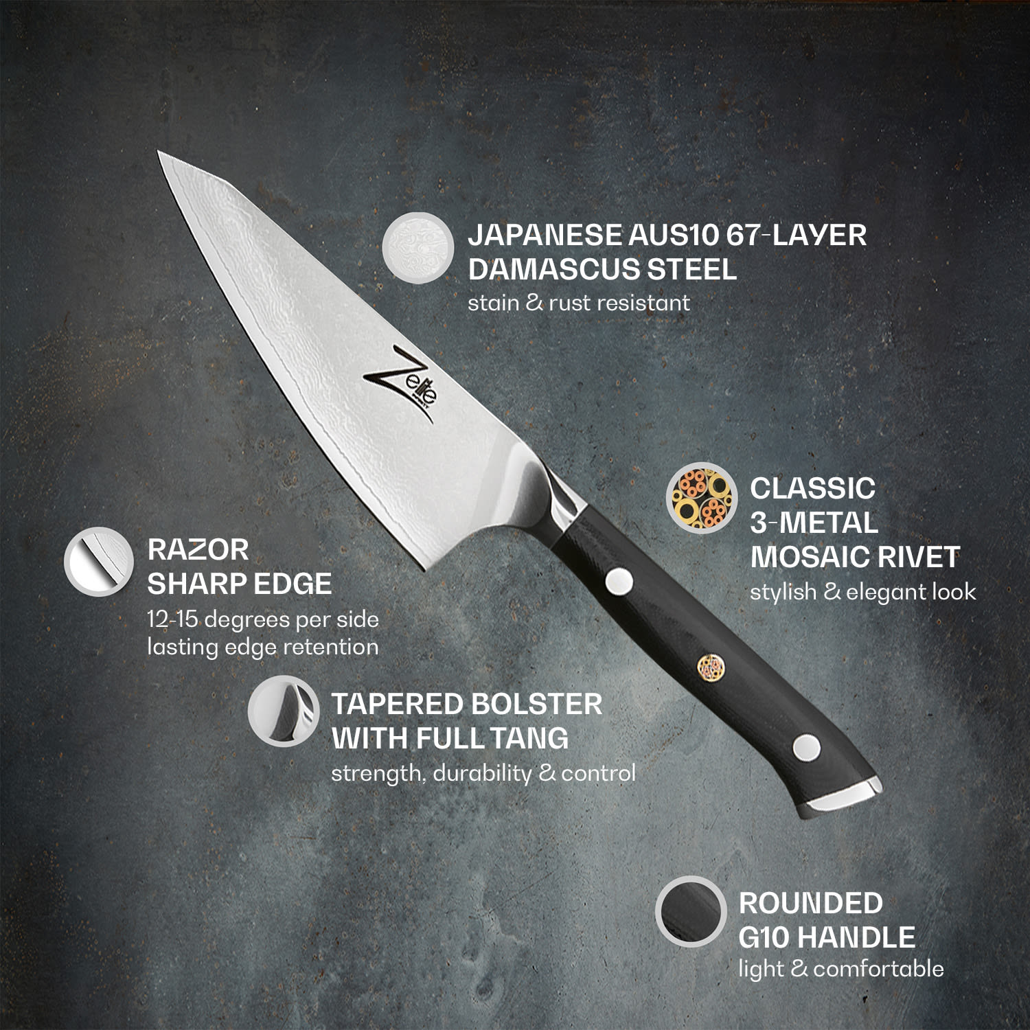 Exkluzívne a precízne nože podľa japonského vzoru: ručne brúsená séria nožov Zelite Infinity by Klarstein Alpha-Royal Japanese spĺňa vysoké nároky každého kuchárskeho umenia. Menistú čepeľ tvorí celkovo 67 vrstiev veľmi kvalitnej japonskej damaškovej ocele. Vďaka svojmu perfektne vyváženému a ergonomickému tvaru a hladkej rukoväti zo skleného vlákna G10 s tromi nitmi sedí tento elegantný kuchynský nástroj dokonale v ruke. Spája sa tu ostrosť, odolnosť, hmotnosť, ovládanie a manipulácia s výnimočným dizajnom, ktoré sú zdokonalené 3 umeleckými kovovými mozaikovými nitmi v rukoväti.Obratný 4,5″ nôž honesuki je všestranný univerzálny nôž japonského pôvodu. Pevná čepeľ s veľmi tenkou špičkou je dokonale vhodná na starostlivé oddelenie všetkých druhov mäsa. Okrem toho môžeš s týmto cenným kuchynským nástrojom zo série Alpha-Royal Japanese od Zelite Infinity by Klarstein jednoducho vykostiť hydinu, profesionálne filetovať ryby a červené mäso a tiež krájať tuk a spojivové tkanivo. Je vhodný aj na zeleninu: čepeľ pri záštite je veľkoryso široká a hrana čepele je mierne zakrivená, čo ti umožní rýchlo krájať pomocou hojdavých pohybov.